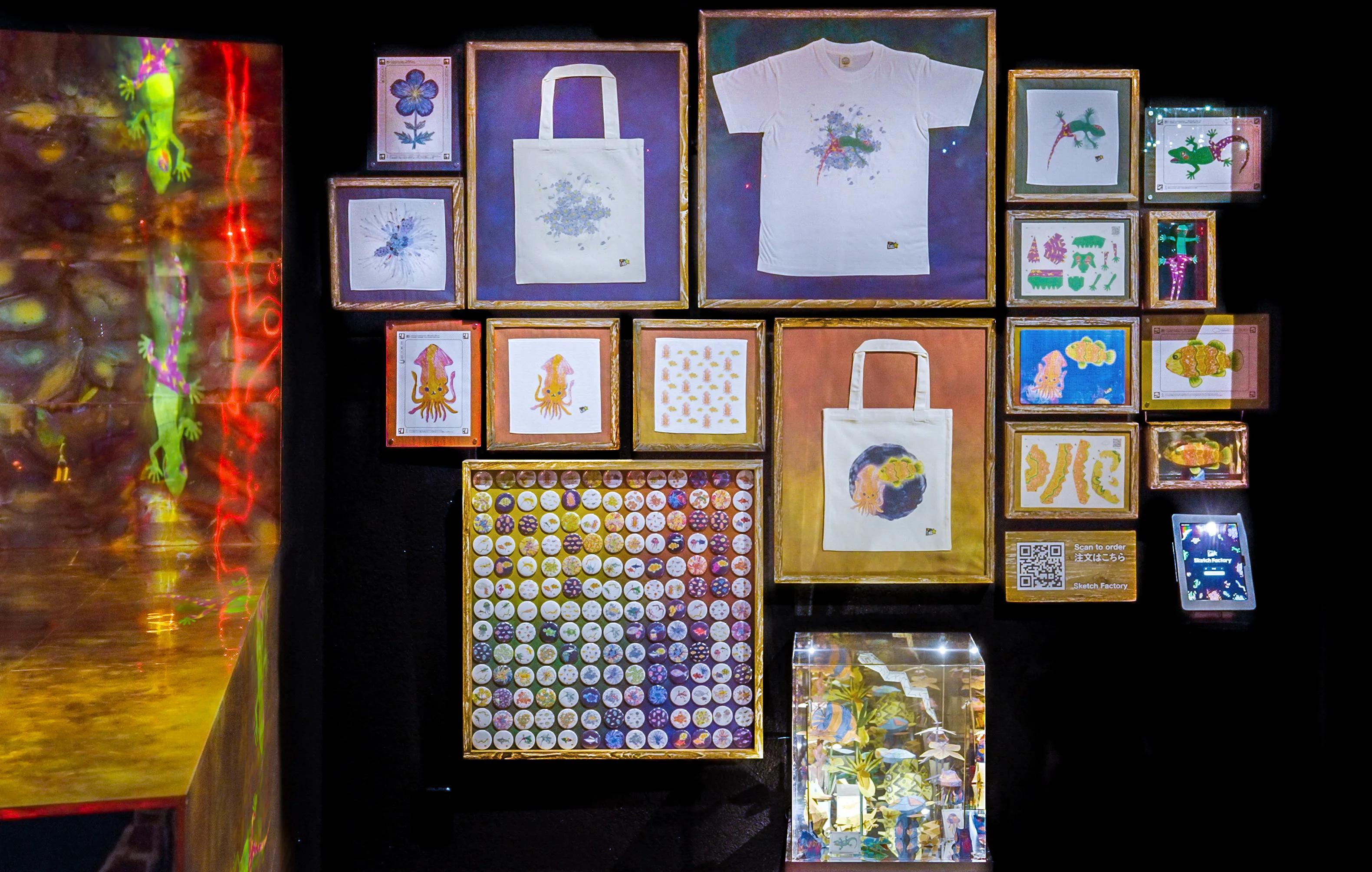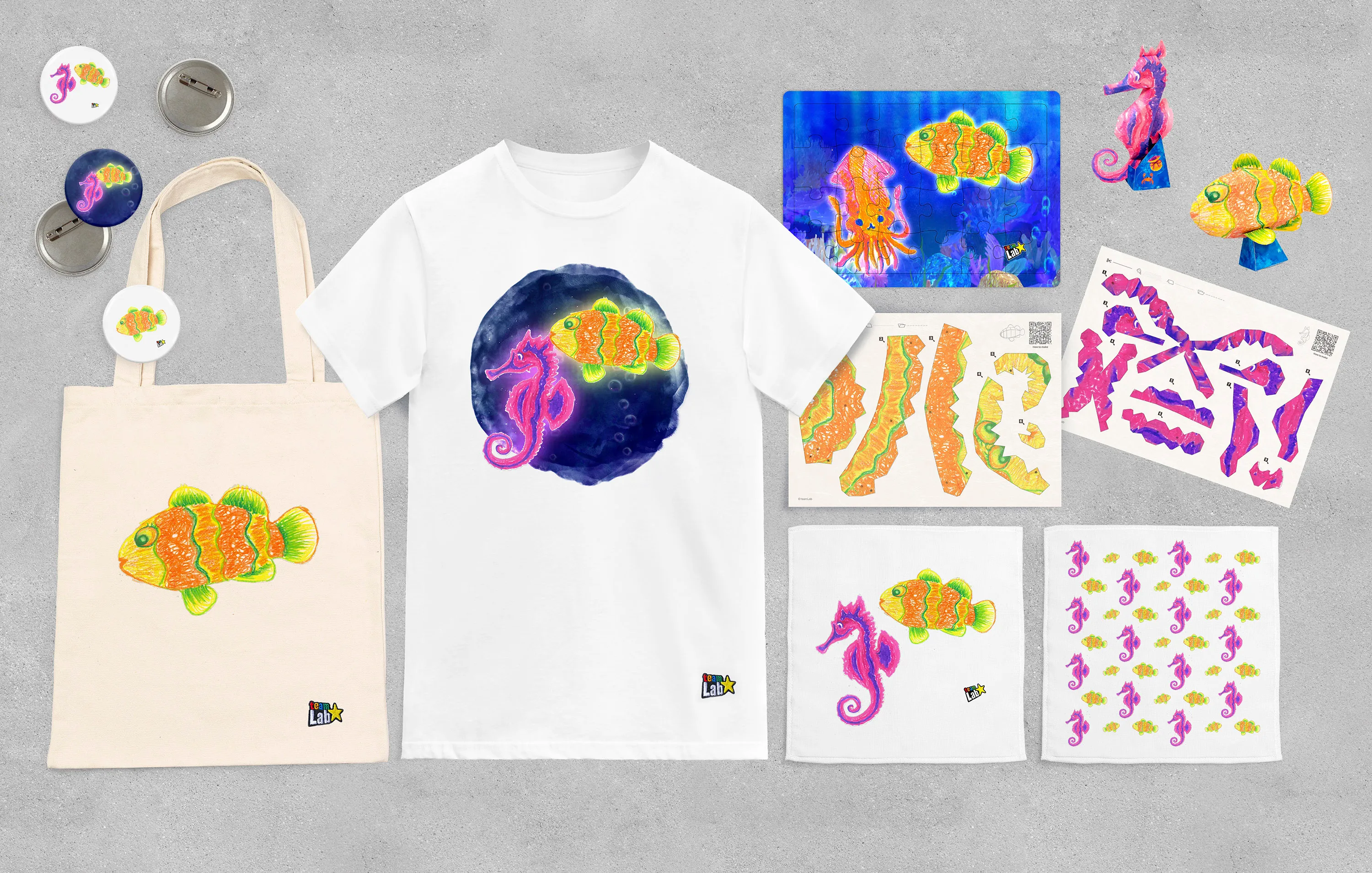 The creatures you draw in Graffiti Nature and Sketch Ocean will be made into an original product such as a badge, magnet, puzzle, hand towel, T-shirt, tote bag or papercraft, to be taken home.