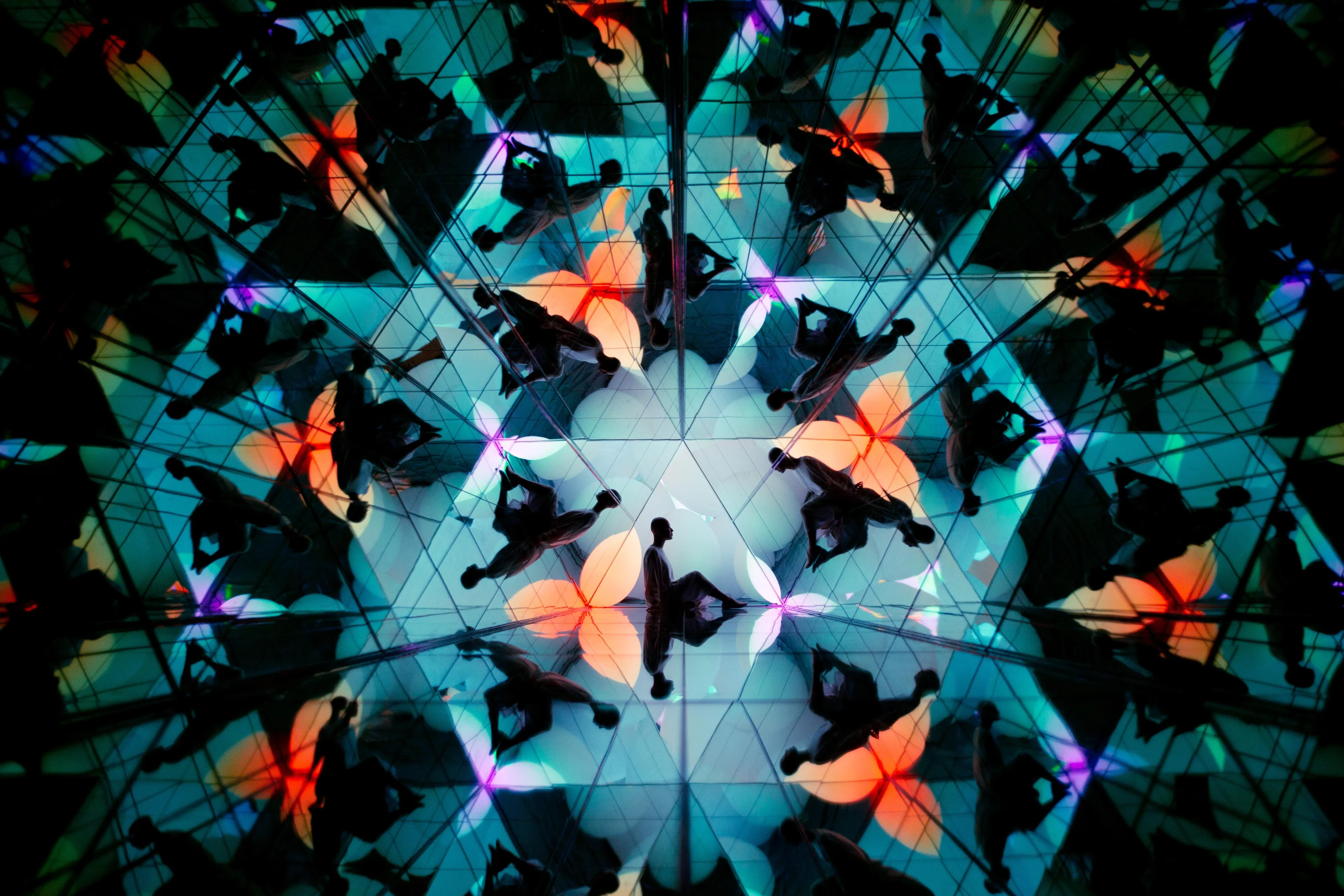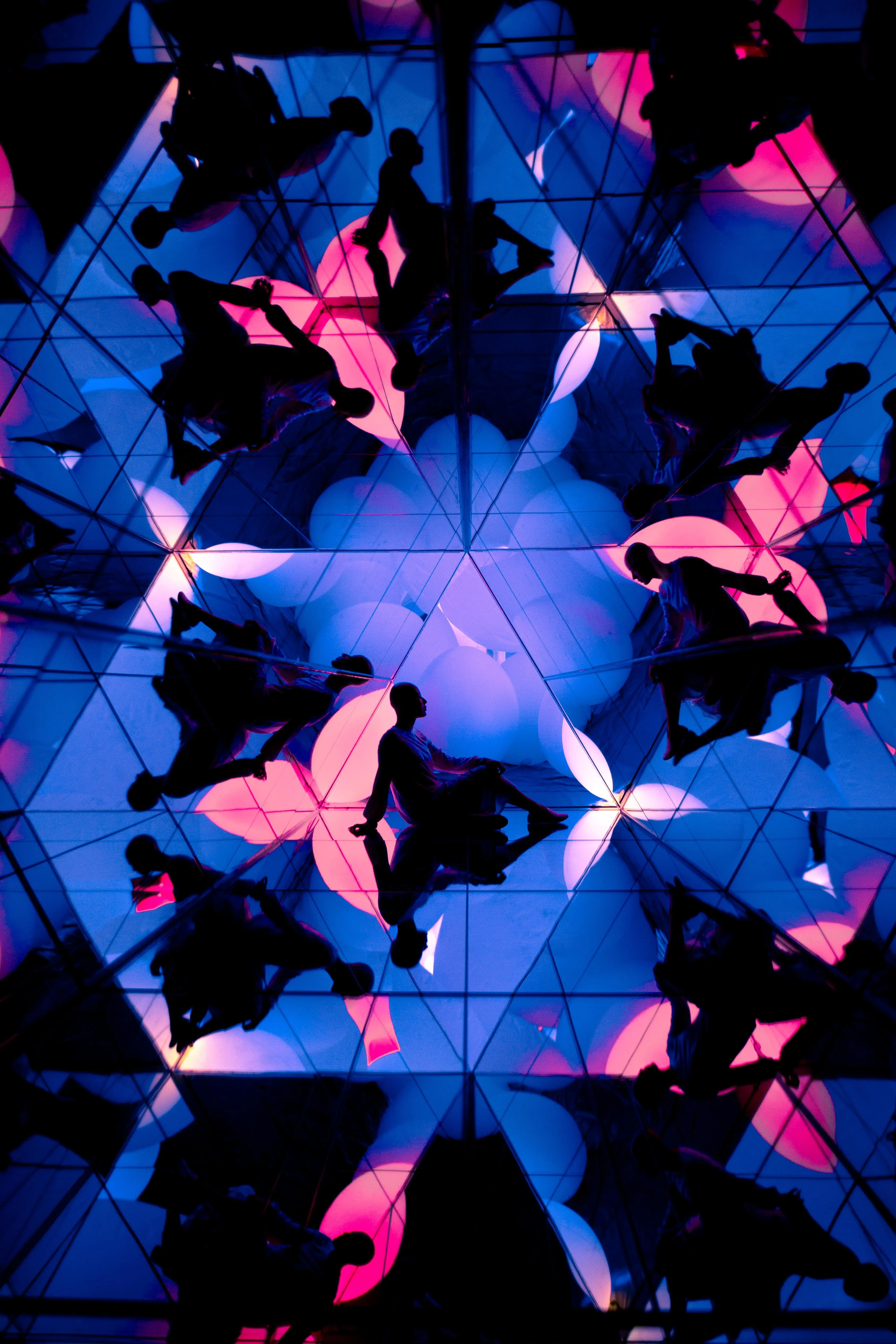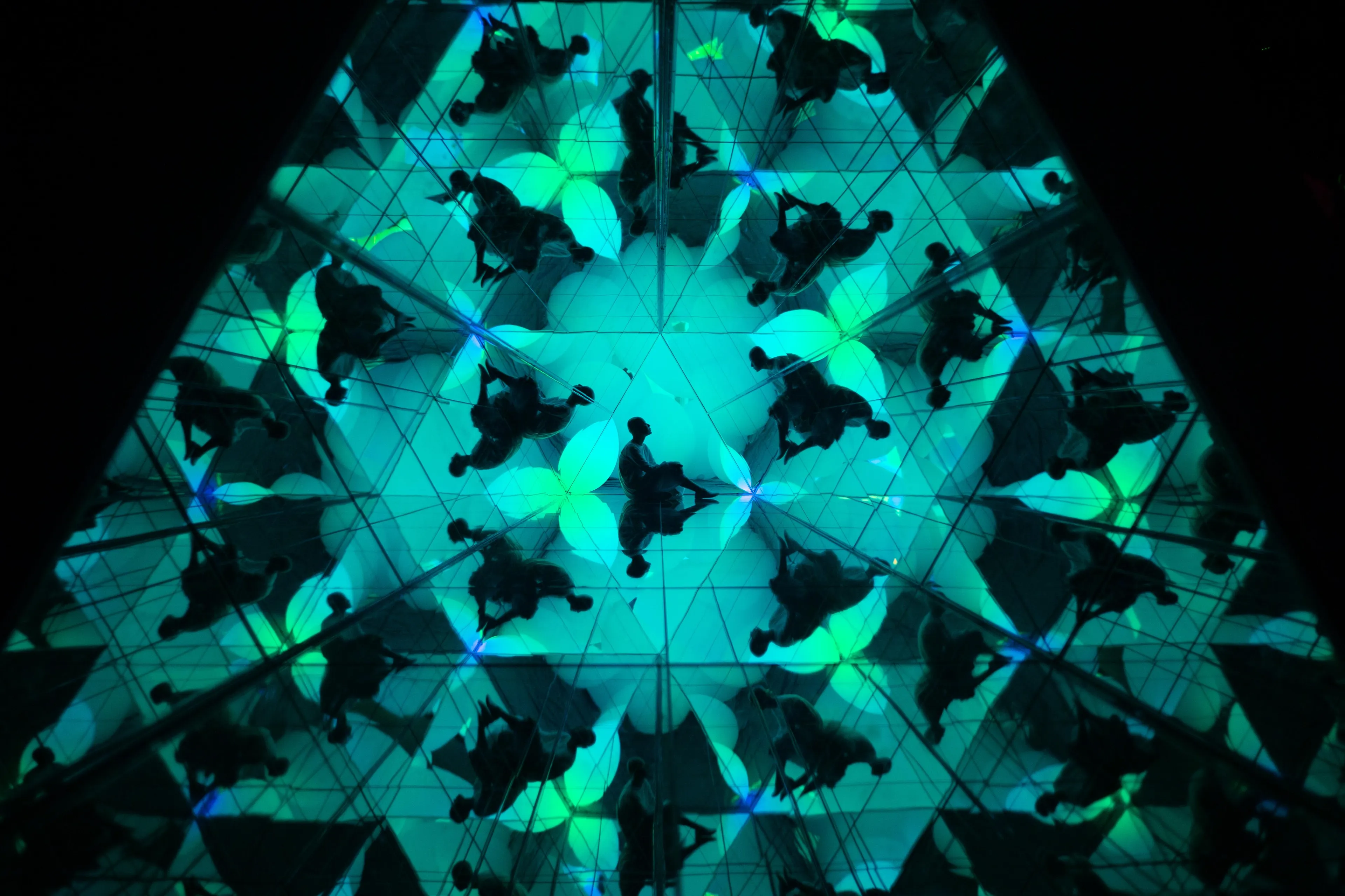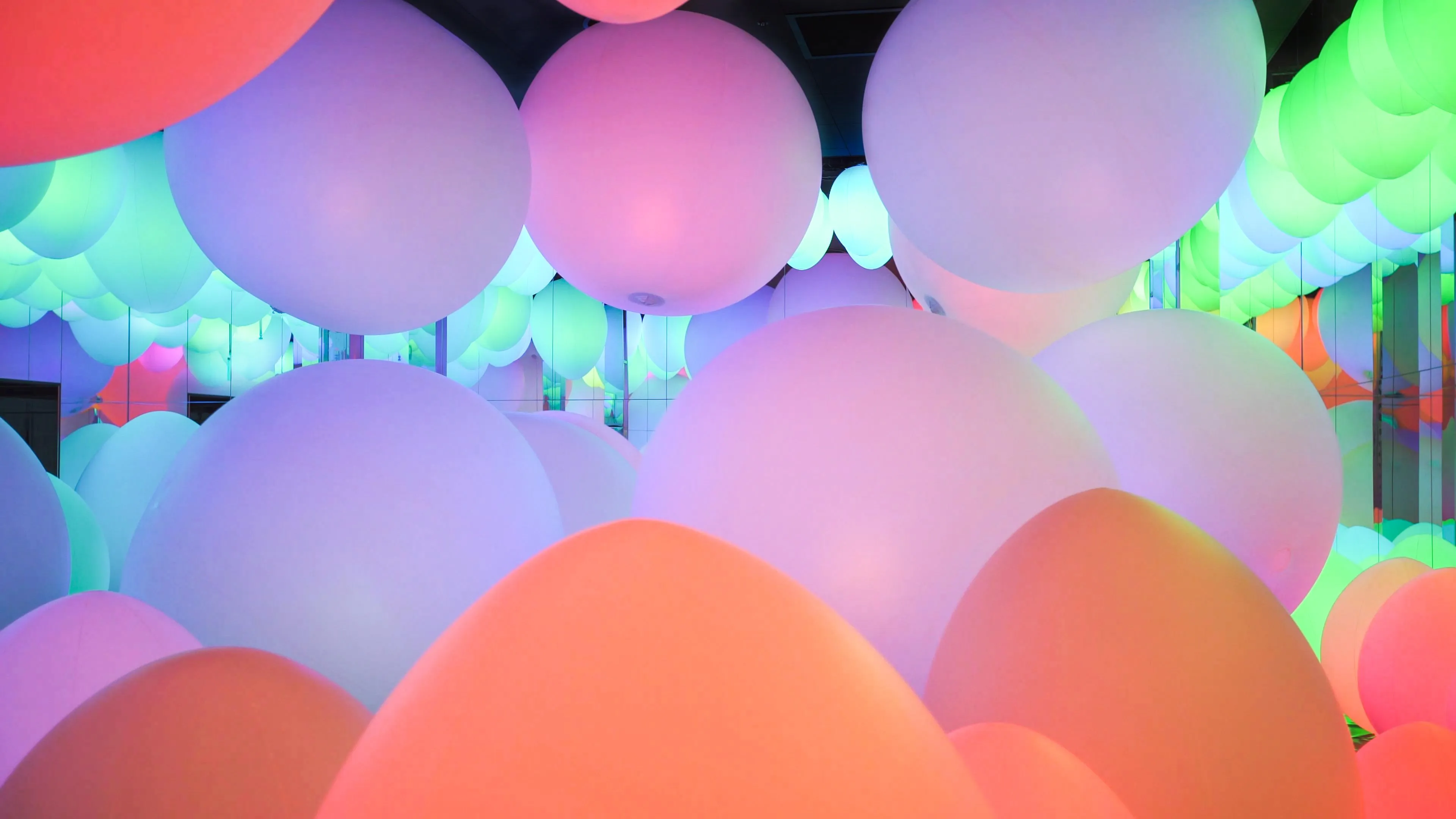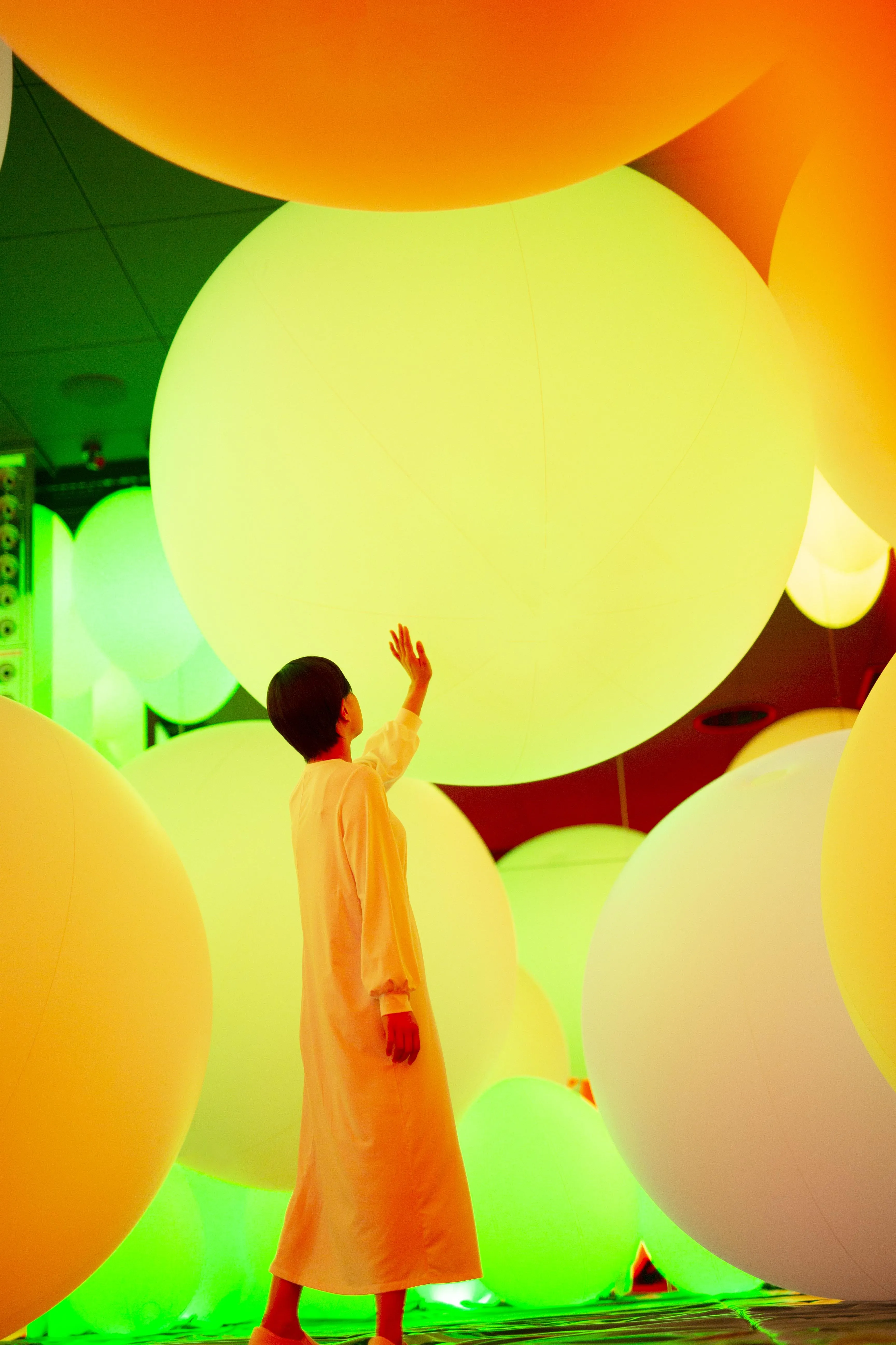 Typhoon Light Balls are a group of giant balls that float, sink, and continuously turn. When they are pushed by a person or receive an impact, they change color and produce a tone unique to that color. The surrounding spheres respond one after another, changing to the same color and sounding the same tone in succession.