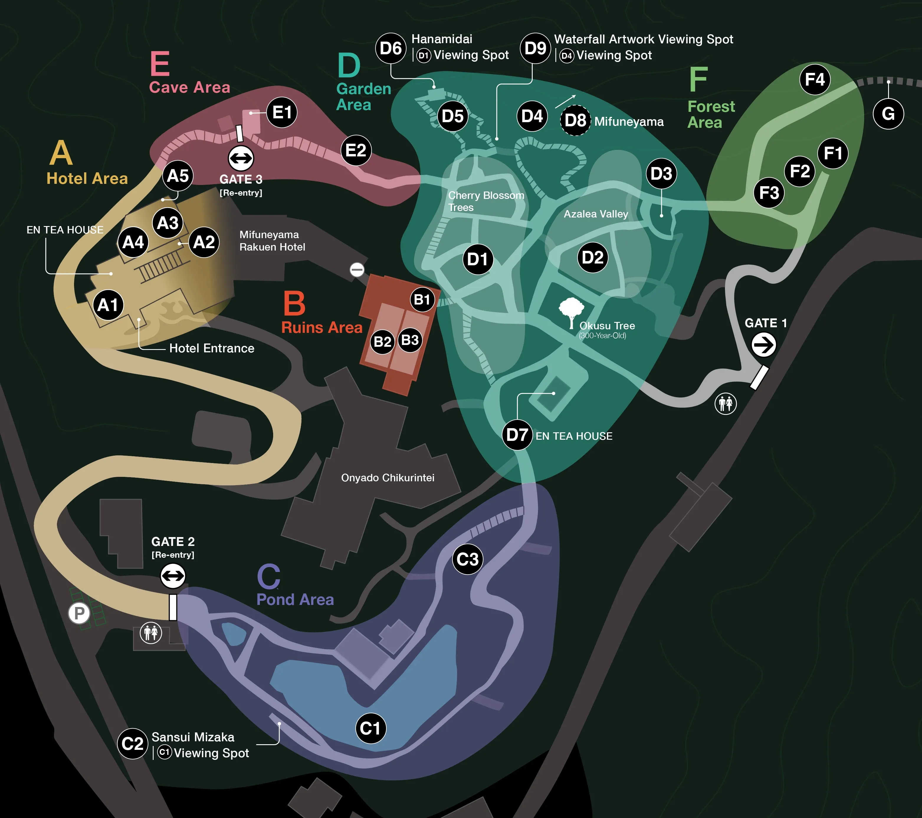Combo tickets for a day trip to Rakan Bath and “teamLab: A Forest Where Gods Live” are available, allowing visitors not staying at the Mifuneyama Rakuen Hotel or Onyado Chikurintei to take a sauna, then experience art in the forest. (*Reservation Required) Open your mind in a sauna surrounded by 3-million-year-old nature and 1,300 years’ worth of heritage. Reconnect with the continuity of the world and of time in 500,000 square meters of art spread across historic forests and gardens.
