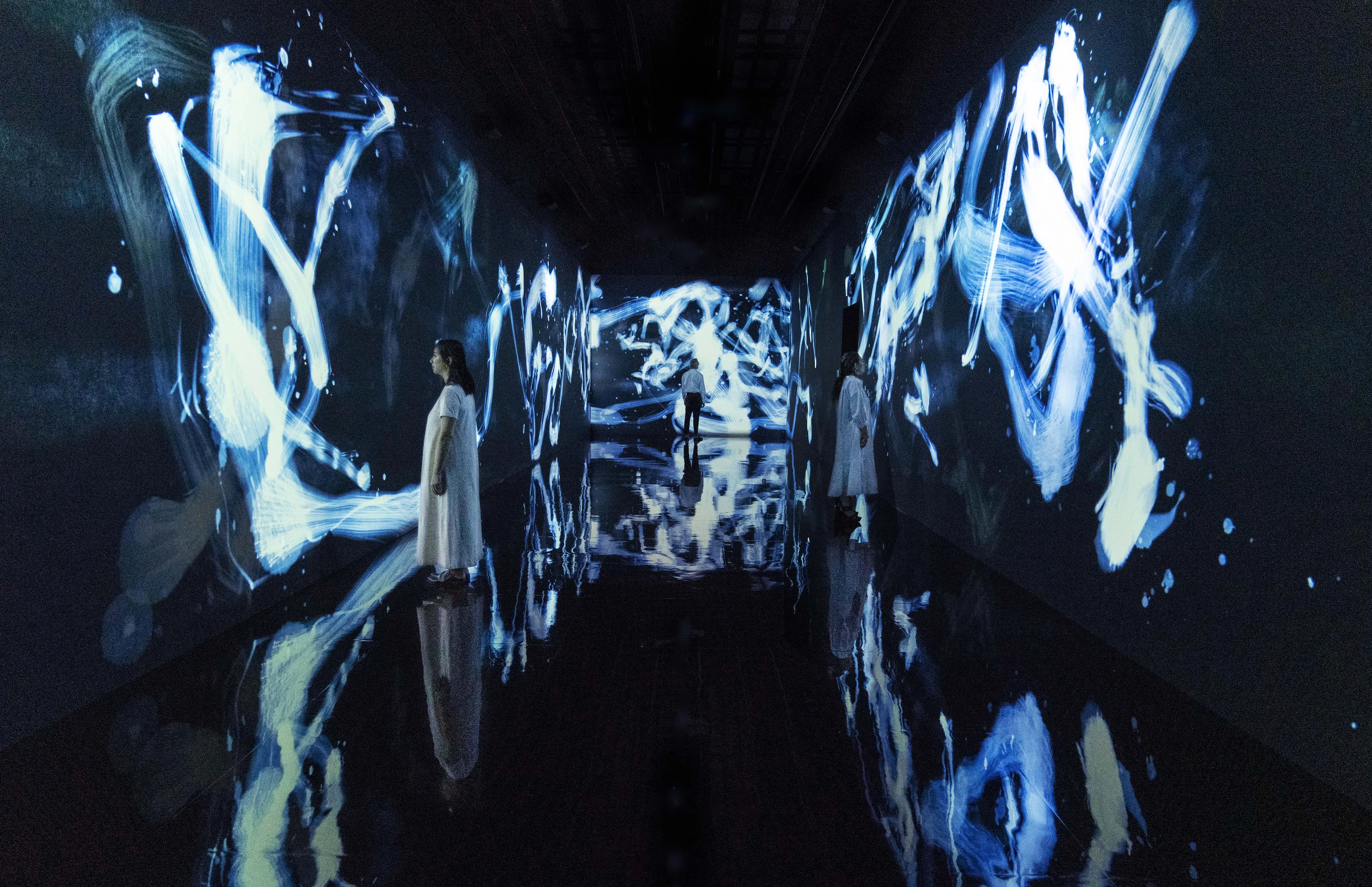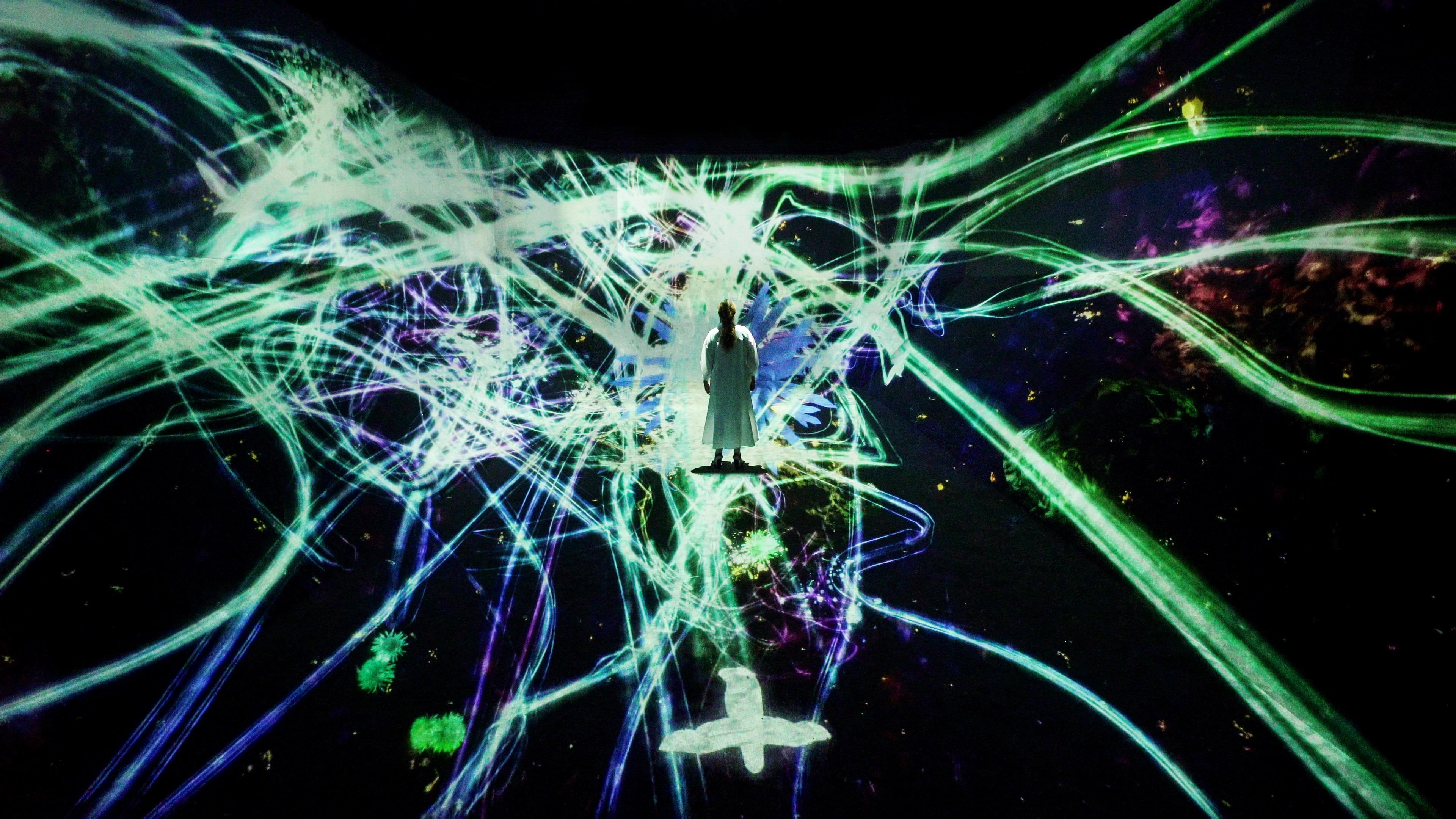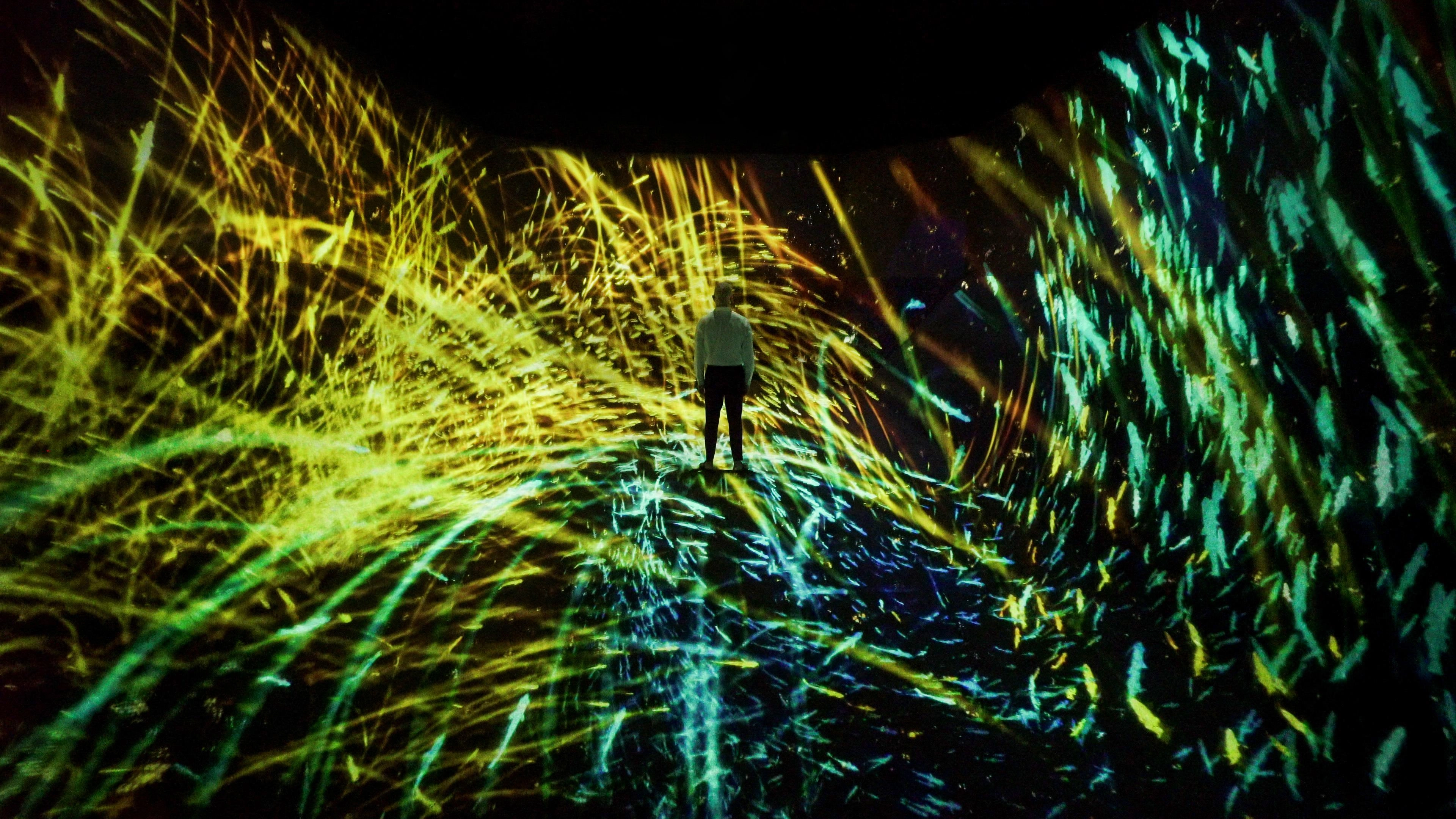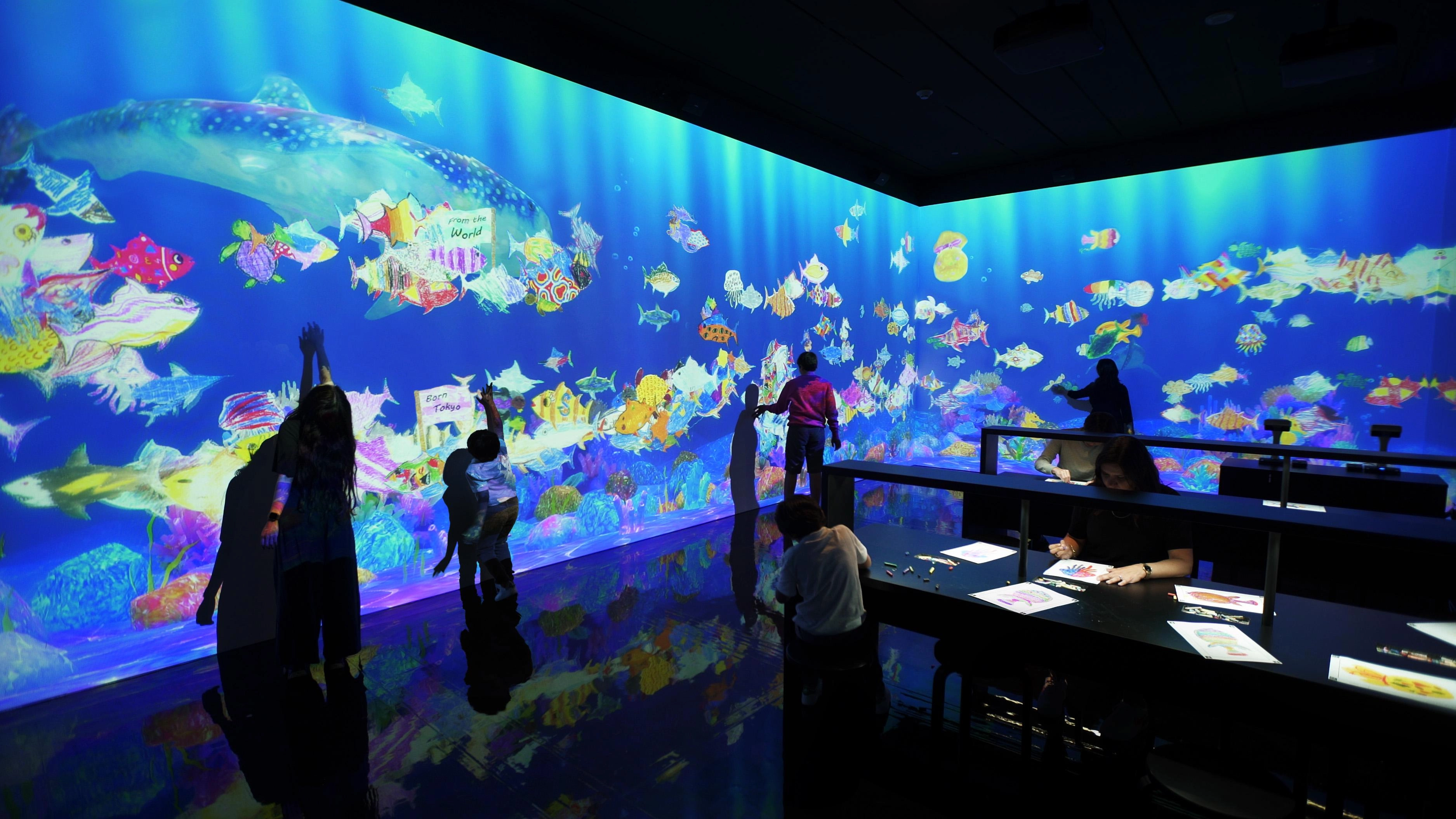 The shoal of fish illuminated by the light moves freely through the space, and their trails of light draw lines in the space. The fish sense people in the space and try to avoid colliding with them. People are also assigned a color, and when a fish passes by a person, it takes on that color.