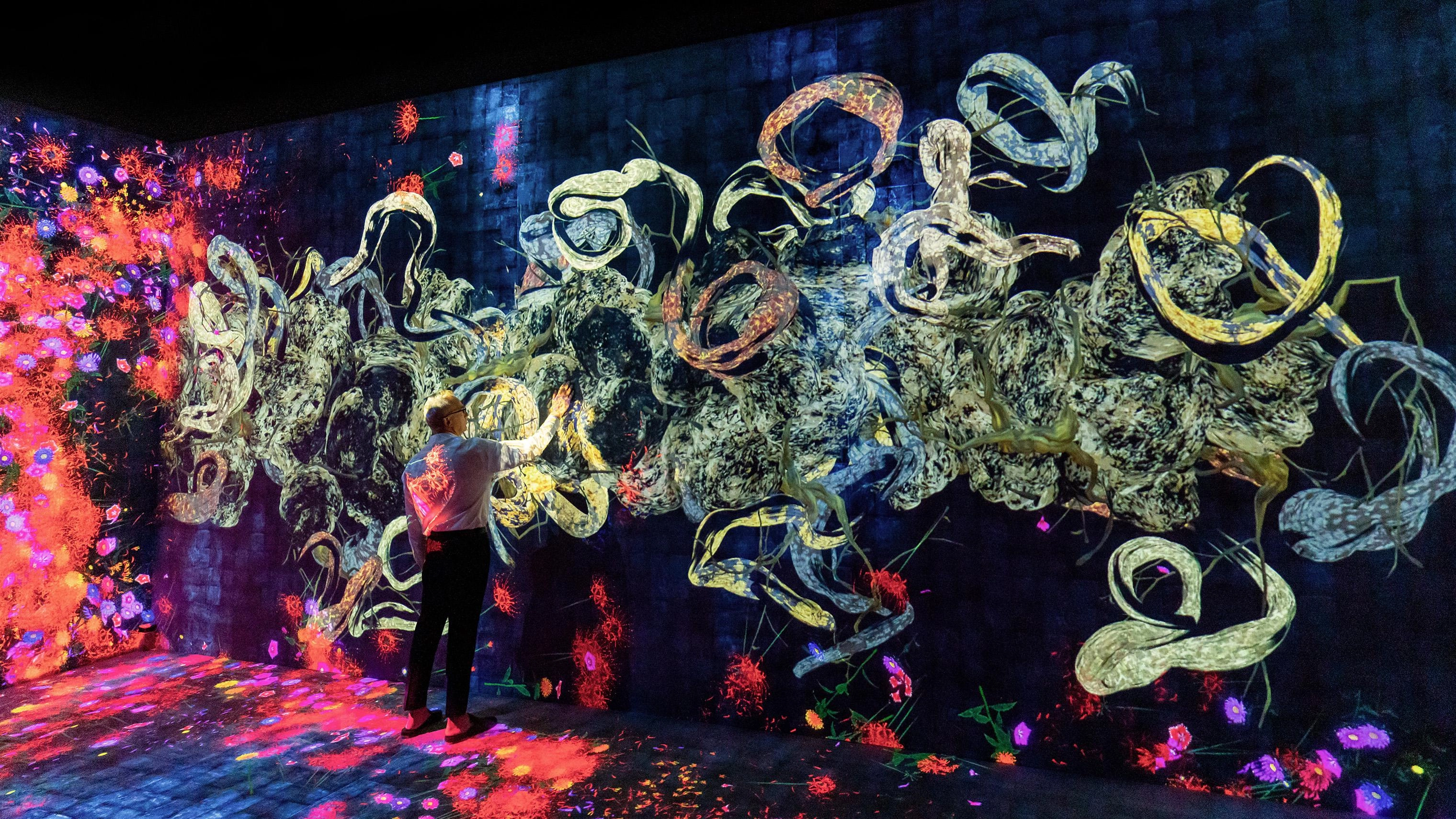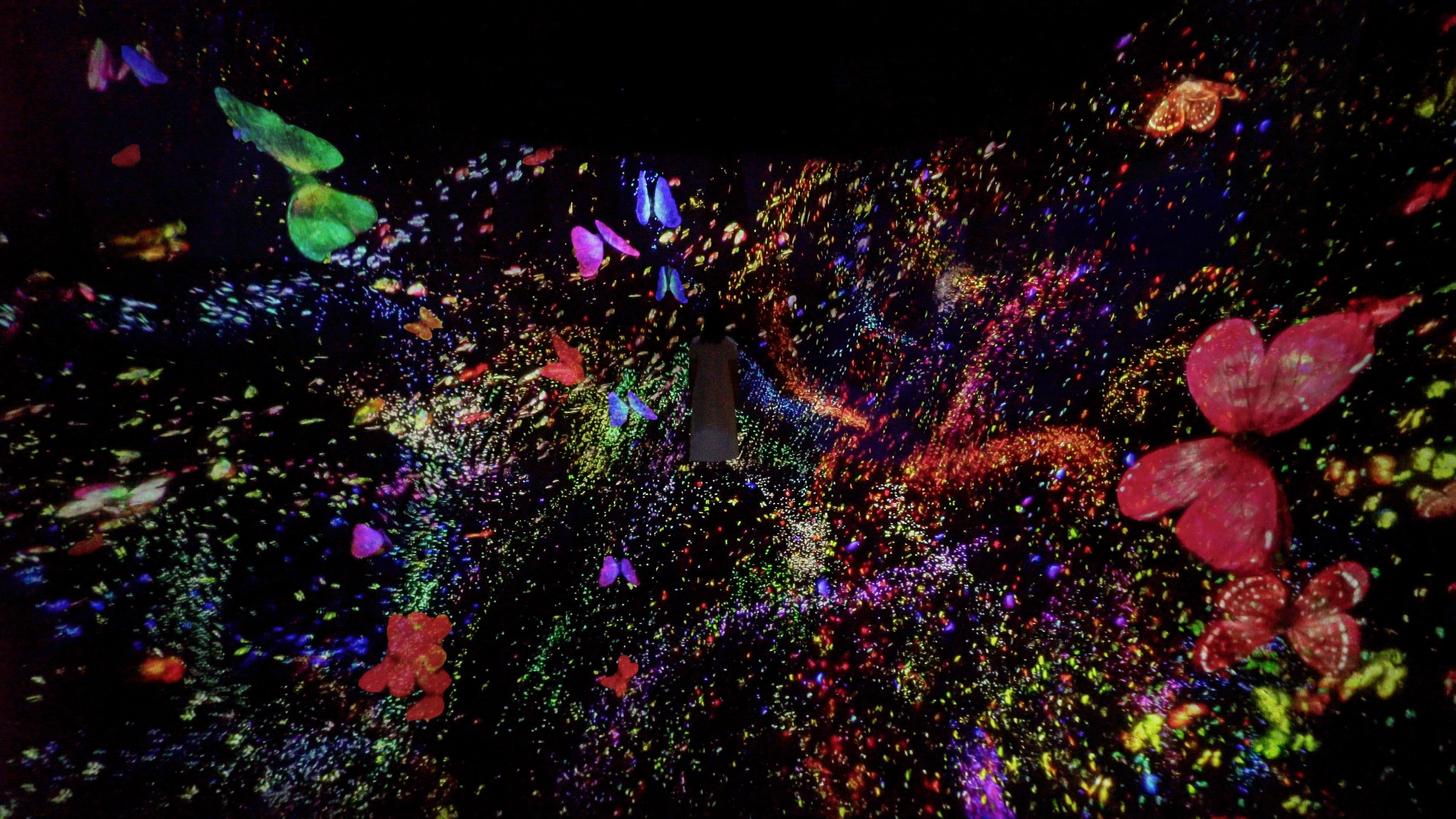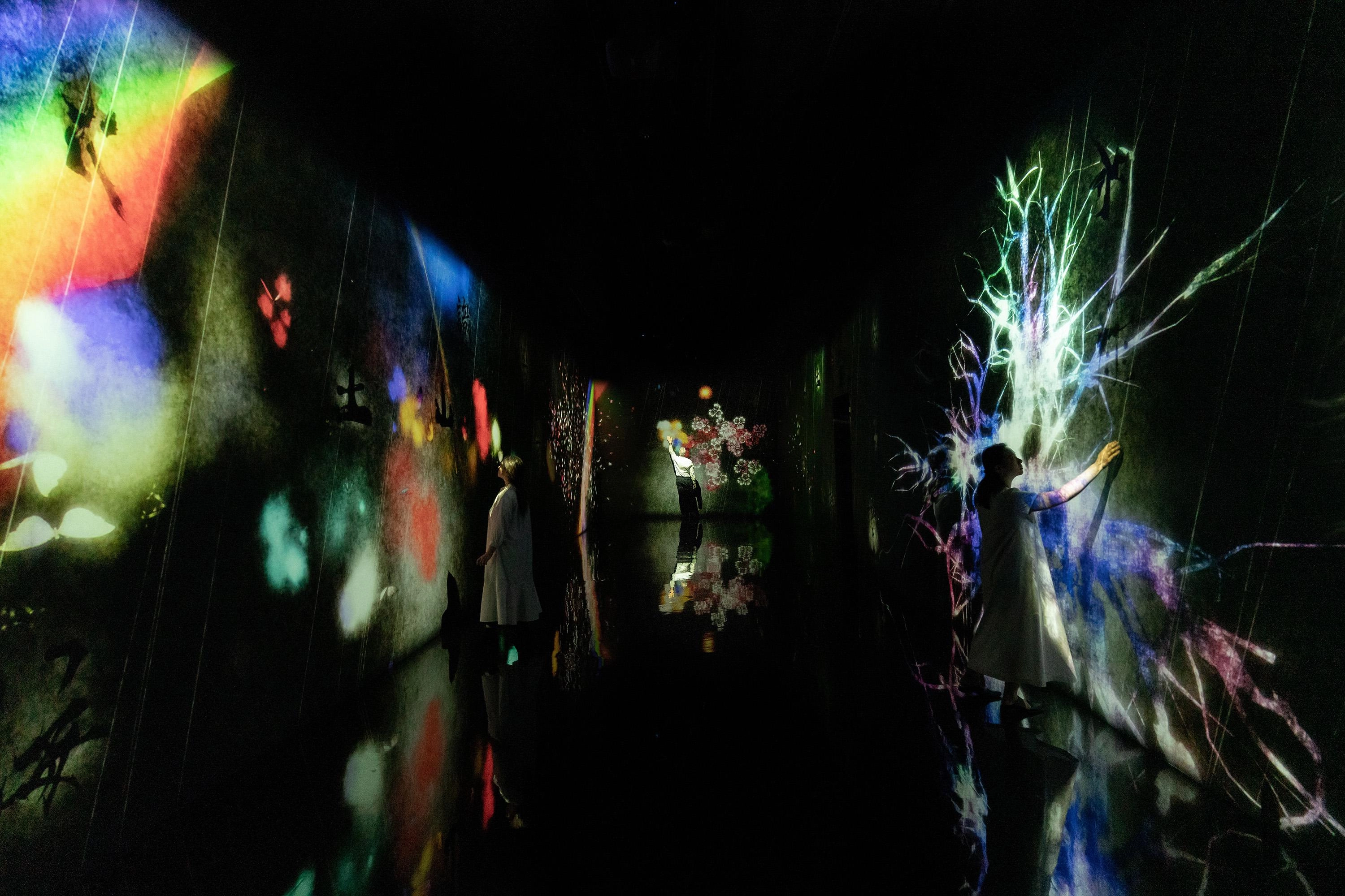 The shoal of fish illuminated by the light moves freely through the space, and their trails of light draw lines in the space. The fish sense people in the space and try to avoid colliding with them. People are also assigned a color, and when a fish passes by a person, it takes on that color.