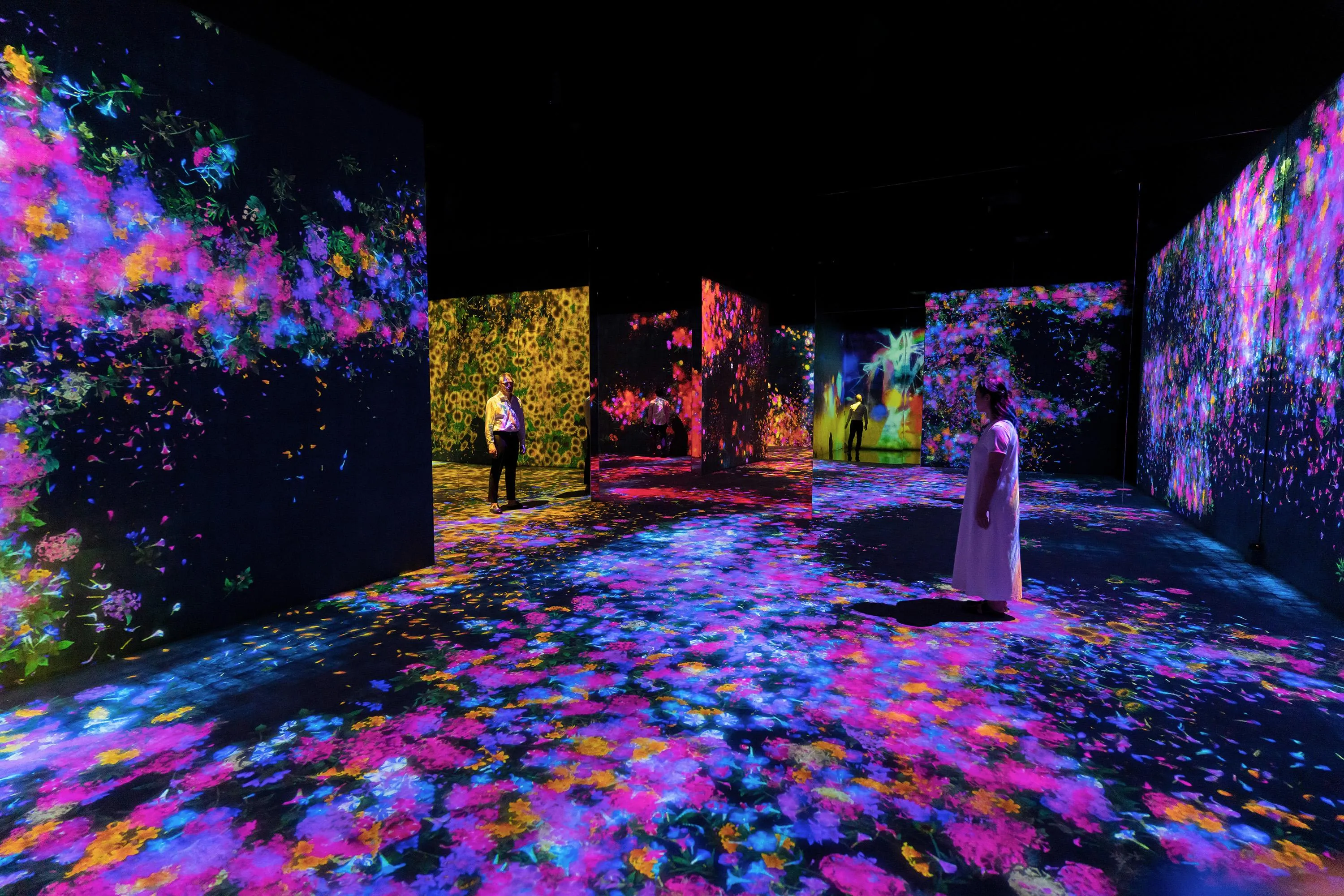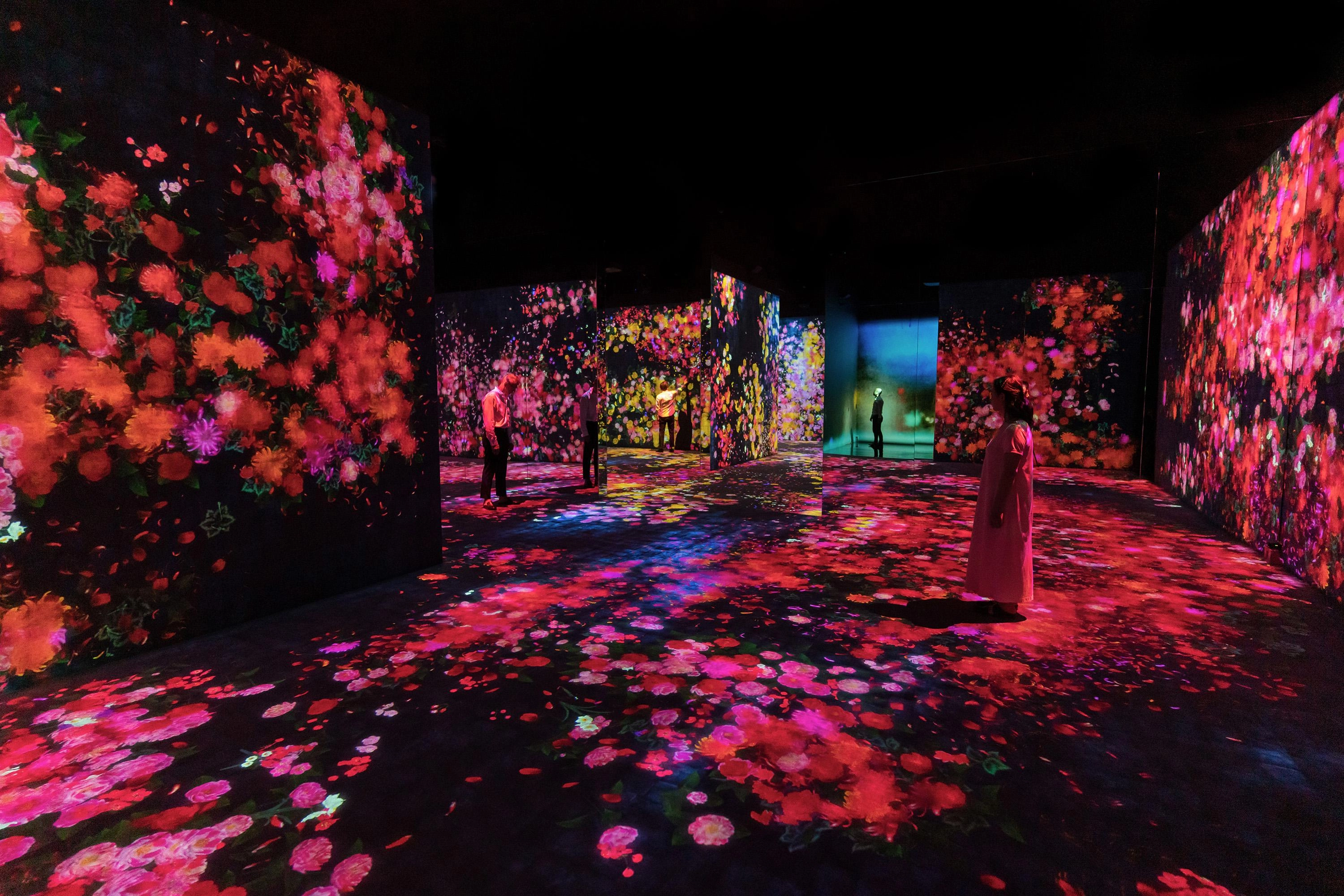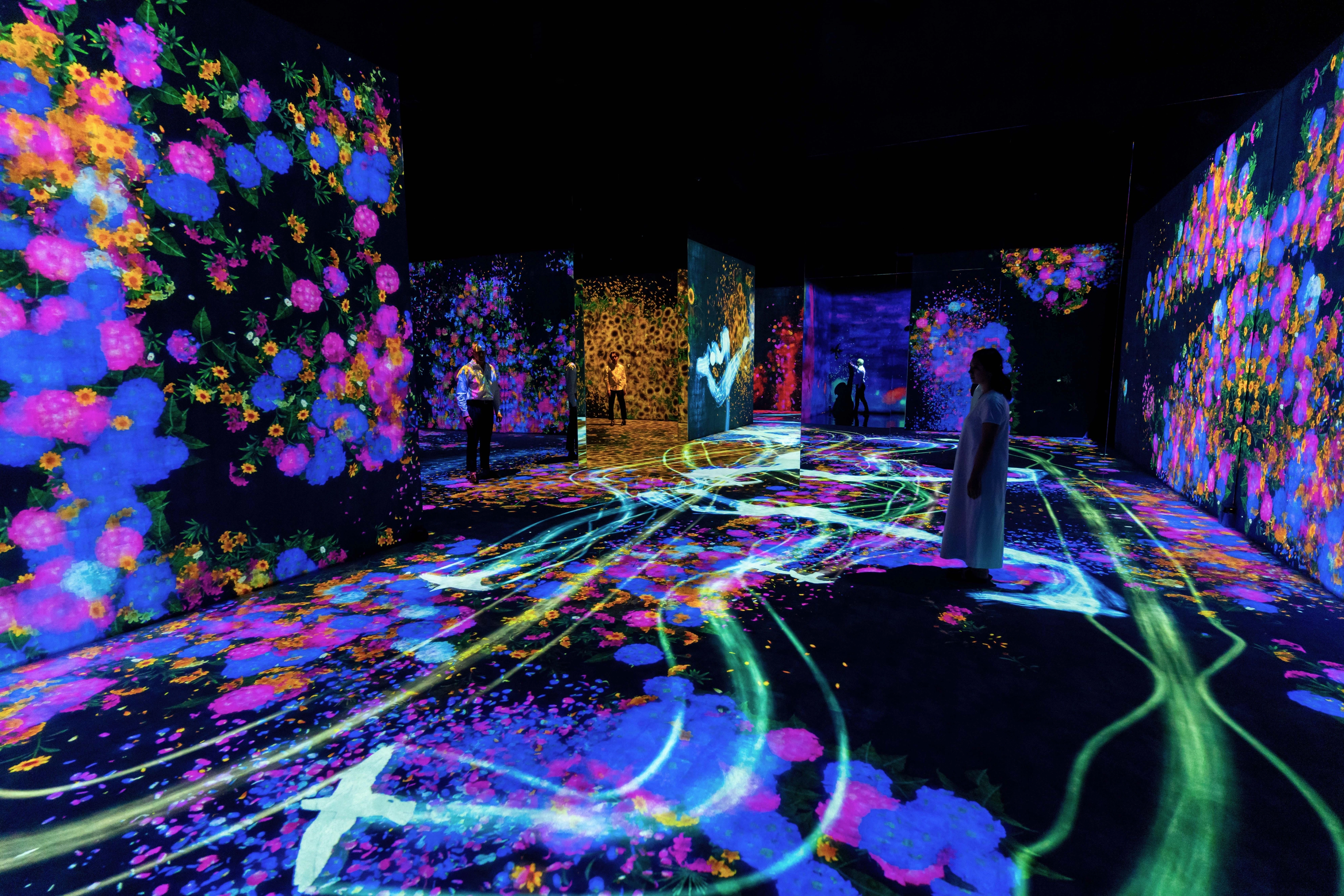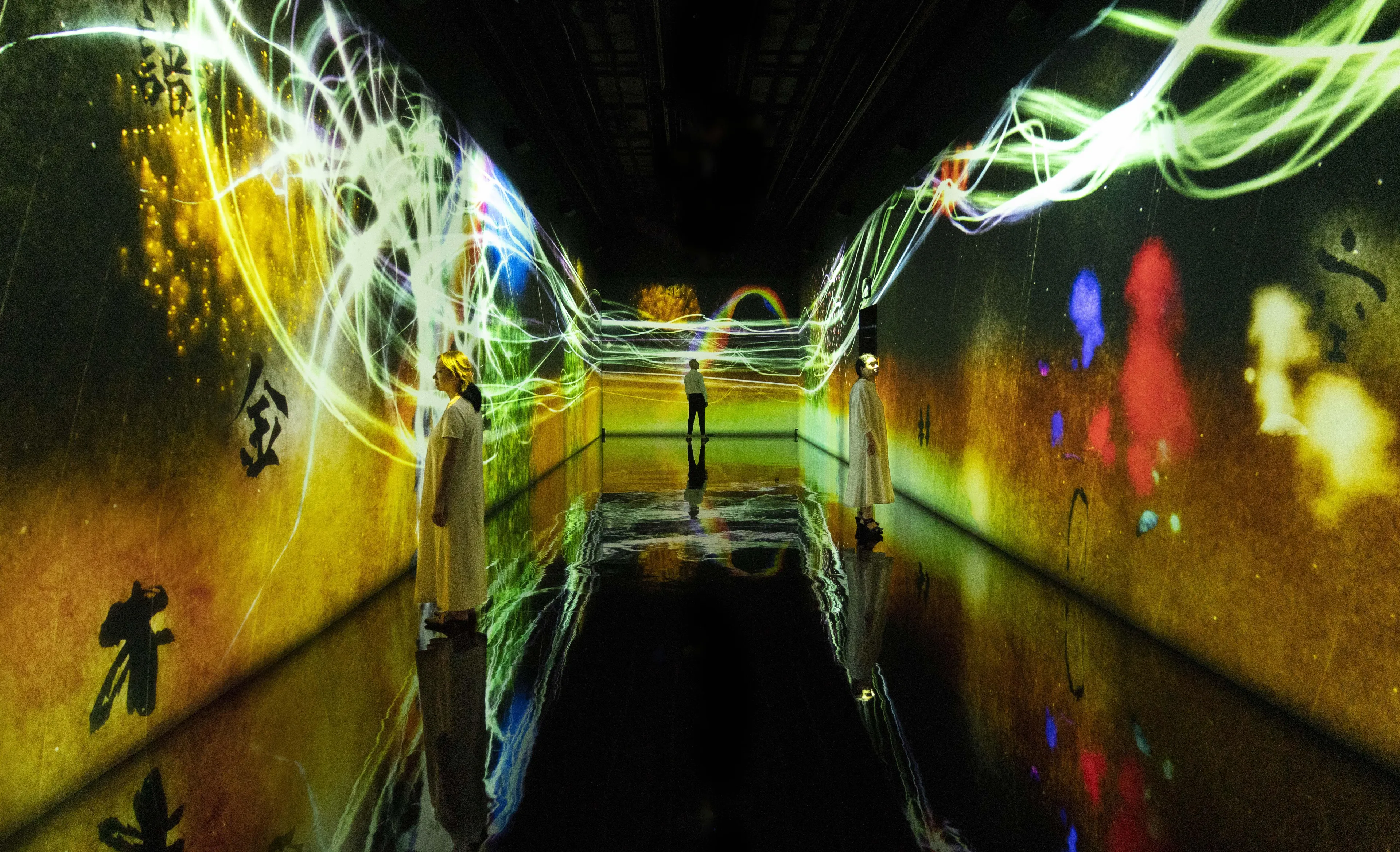 The shoal of fish illuminated by the light moves freely through the space, and their trails of light draw lines in the space. The fish sense people in the space and try to avoid colliding with them. People are also assigned a color, and when a fish passes by a person, it takes on that color.