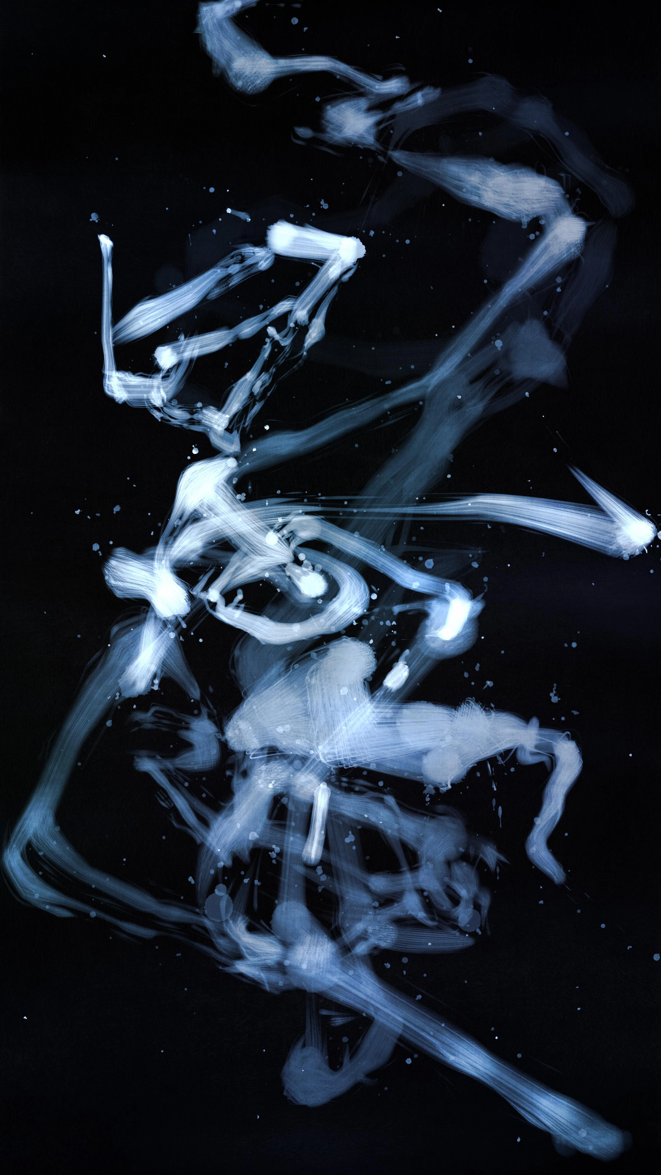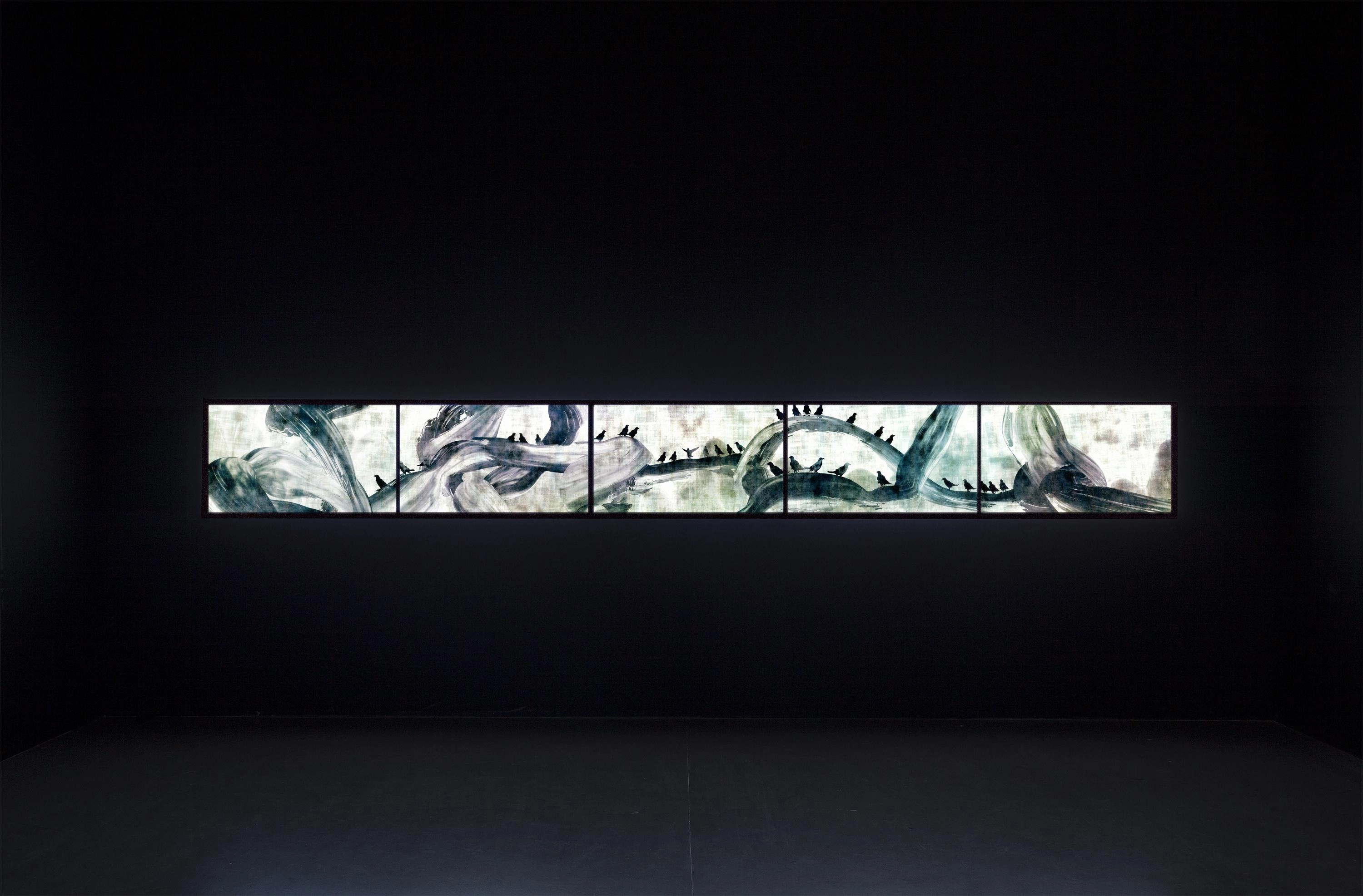 This work is part of a series called The Way of Birds. “The way of the bird” is a saying in Zen which refers to the fact that unlike a human road, the road of the bird is not fixed. The road of the bird is free, unfettered, and leaves no trace. Here, the birds are replaced with fish.