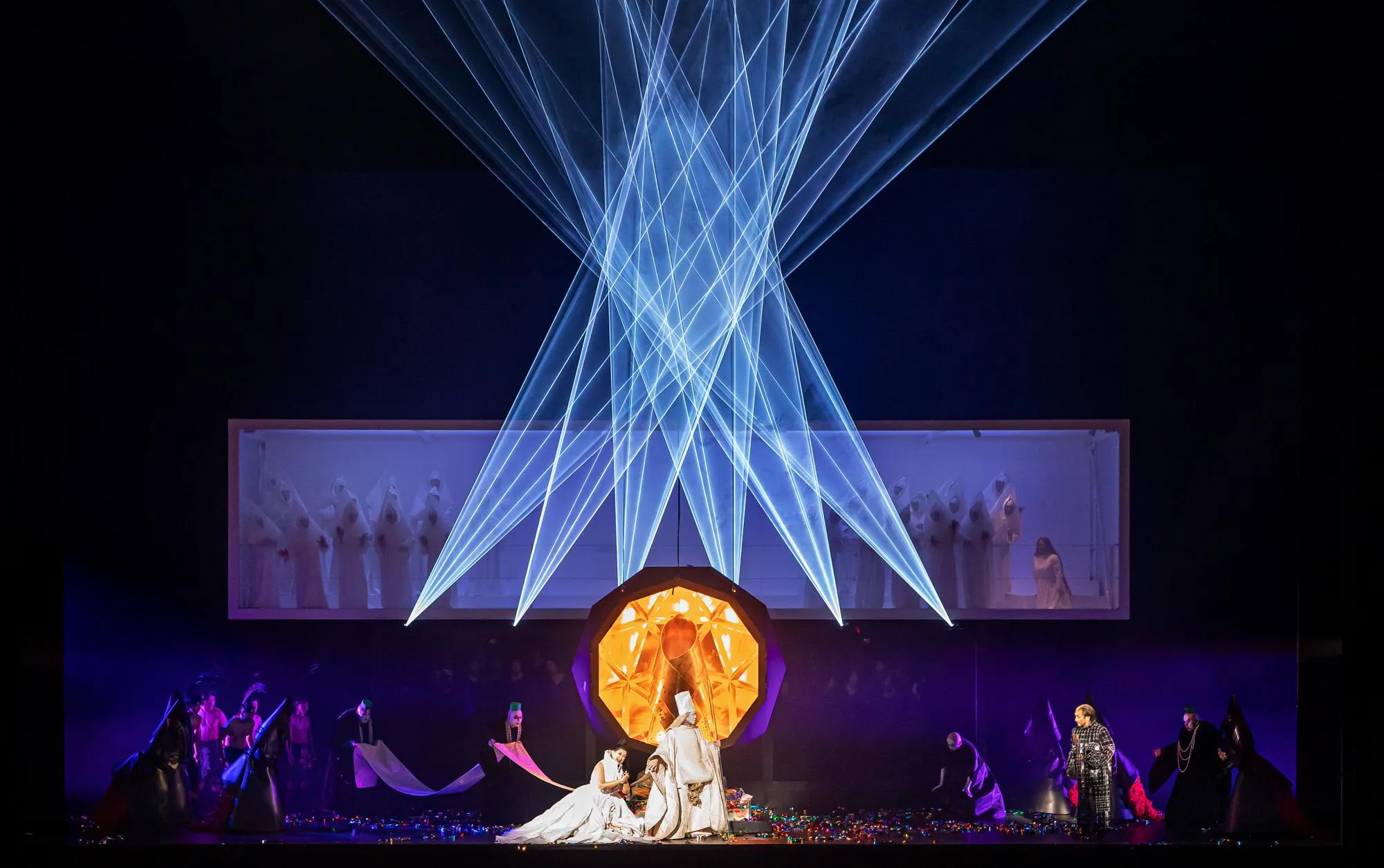 Daniel Kramer’s new staging transposes the old fairy tale to a futuristic world where Turandot’s magic and power hold sway. In a dystopian game show, reminiscent of Hunger Games, the regime of the woman who refuses to become one institutes a surveillance state in which men are culled and the reproduction and breeding of the human species is conducted in a mechanical facility. The US-born director harks back to the archaic essentials of the battle between the sexes.