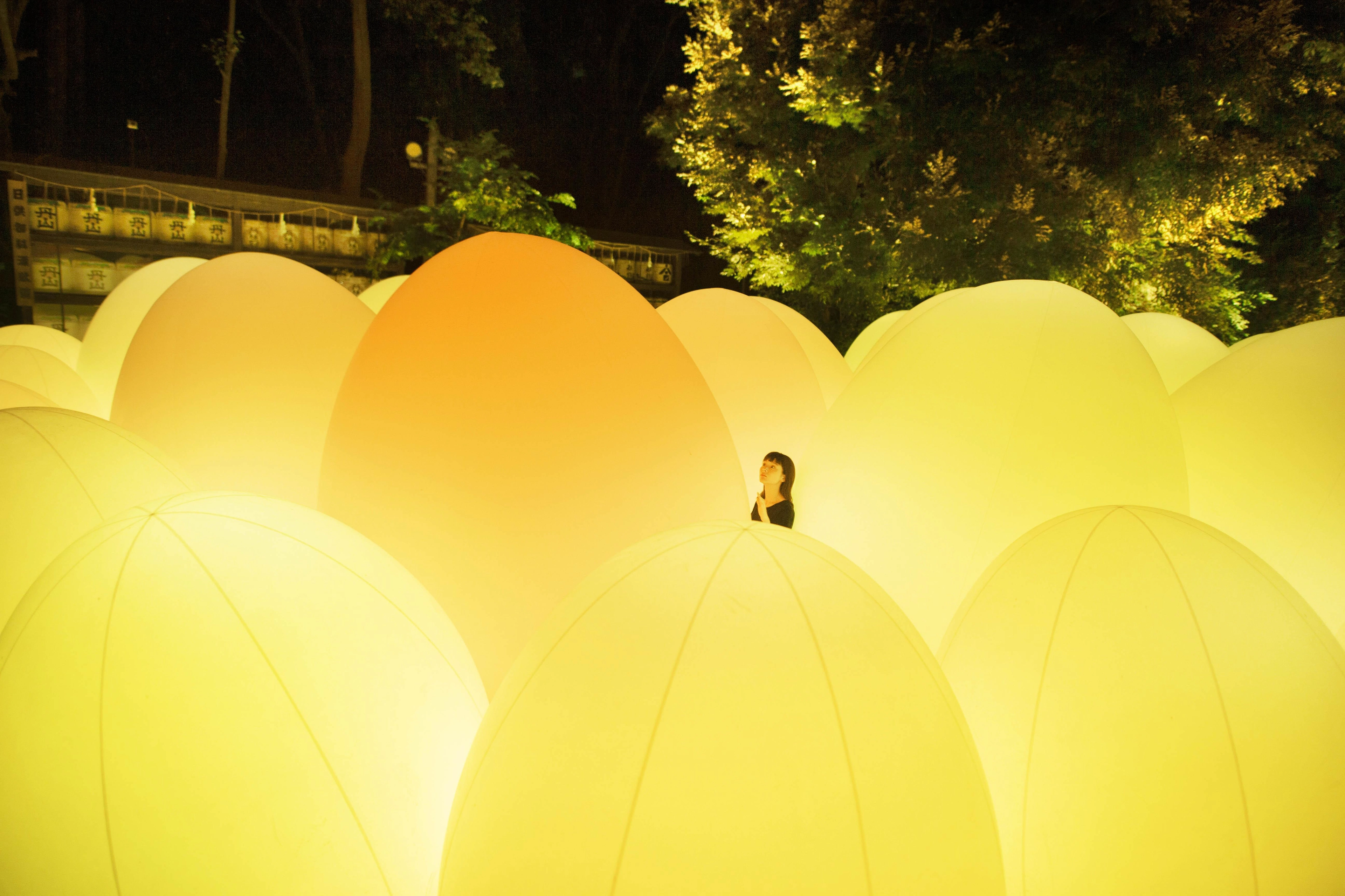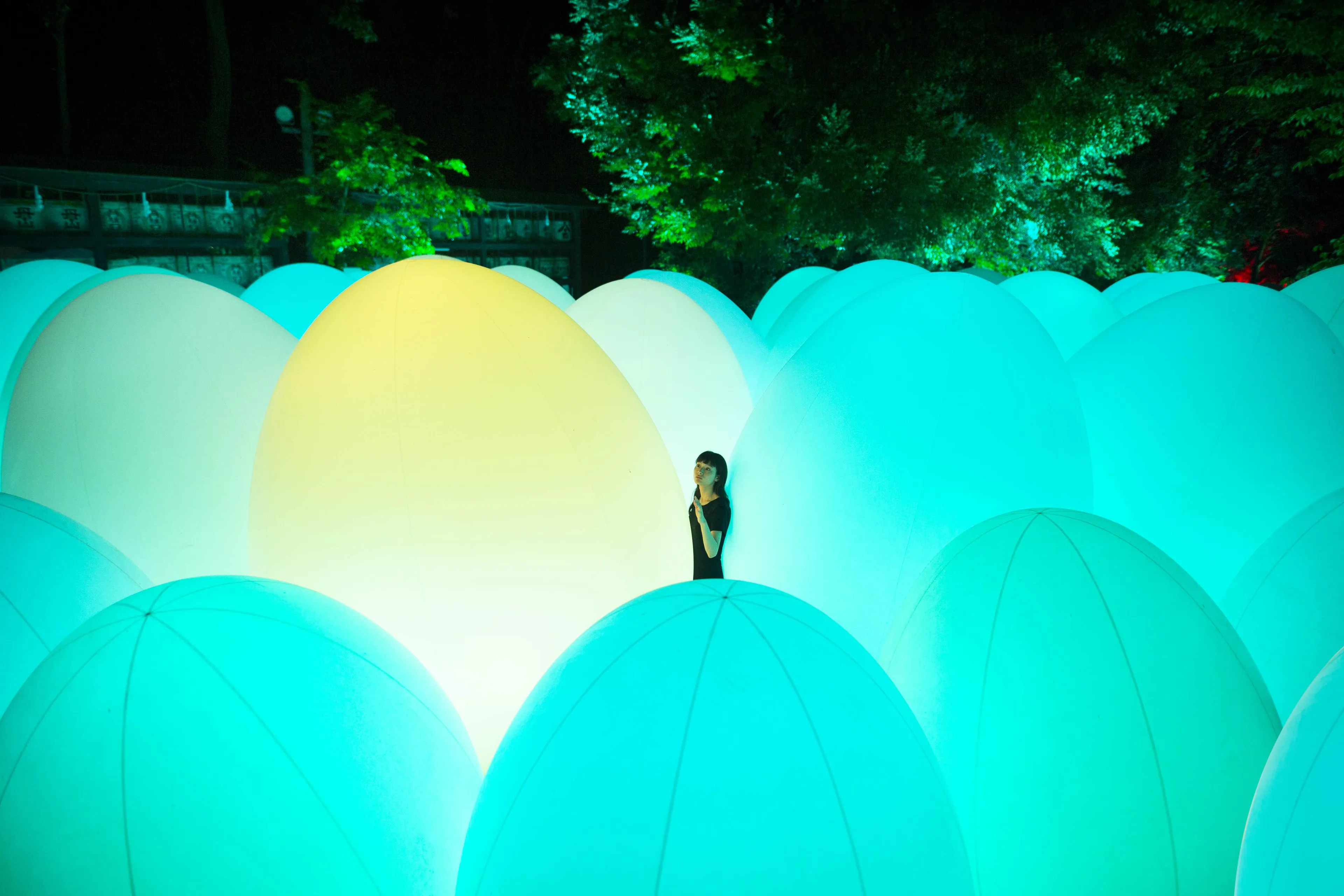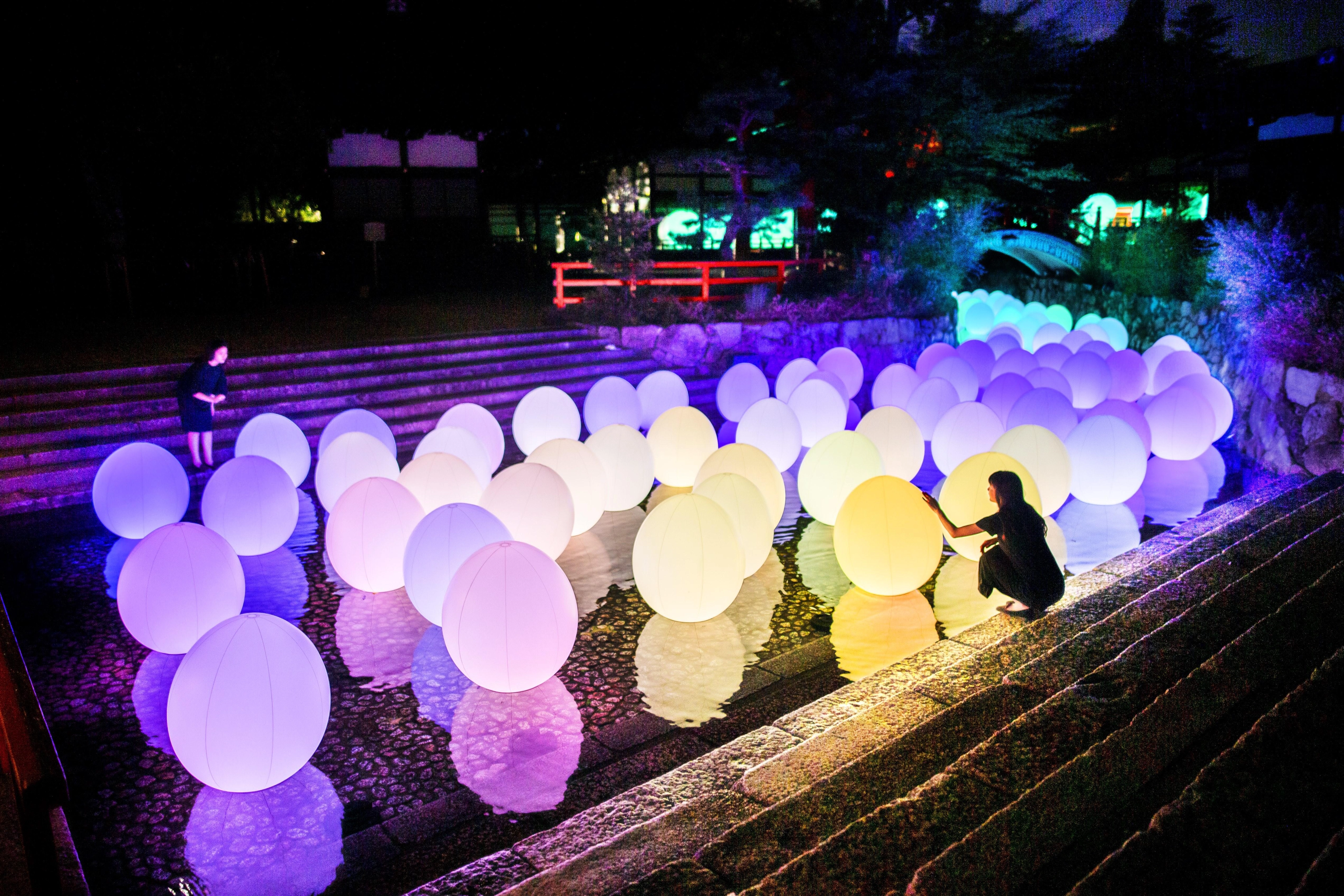 Tadasu Forest has been turned into an art space with the installations Resonating Forest and Autonomous Resonating Life - Tadasu Forest at Shimogamo Shrine, Floating, Resonating Spheres - Shimogamo Shrine, and others.
