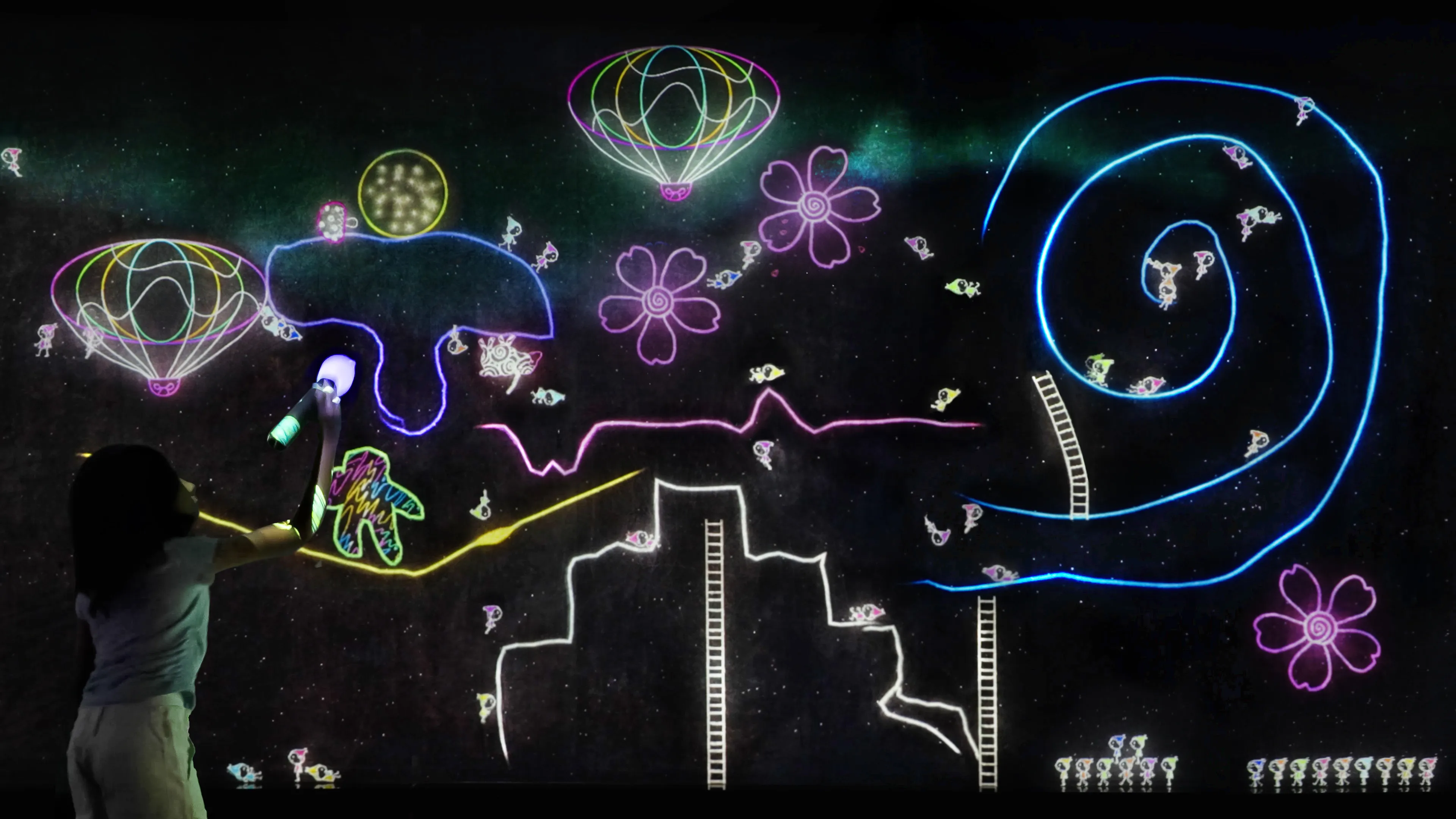 You can create a picture by drawing lines with a light pen or creating shapes with a light stamp. Each line has a special power depending on its color, and influences the little people’s world. The shapes created by the light stamps appear in the little people’s world and start to move.