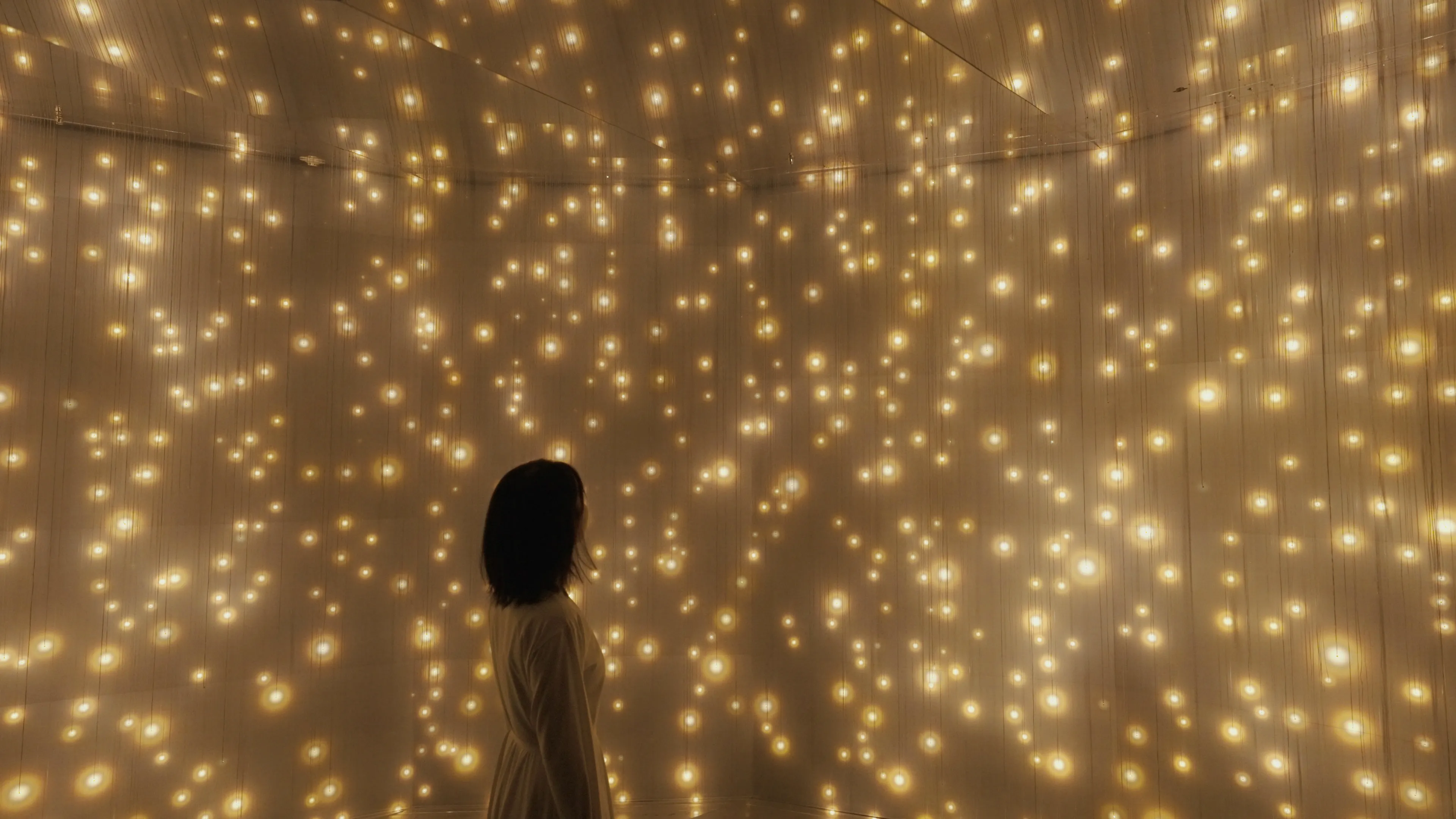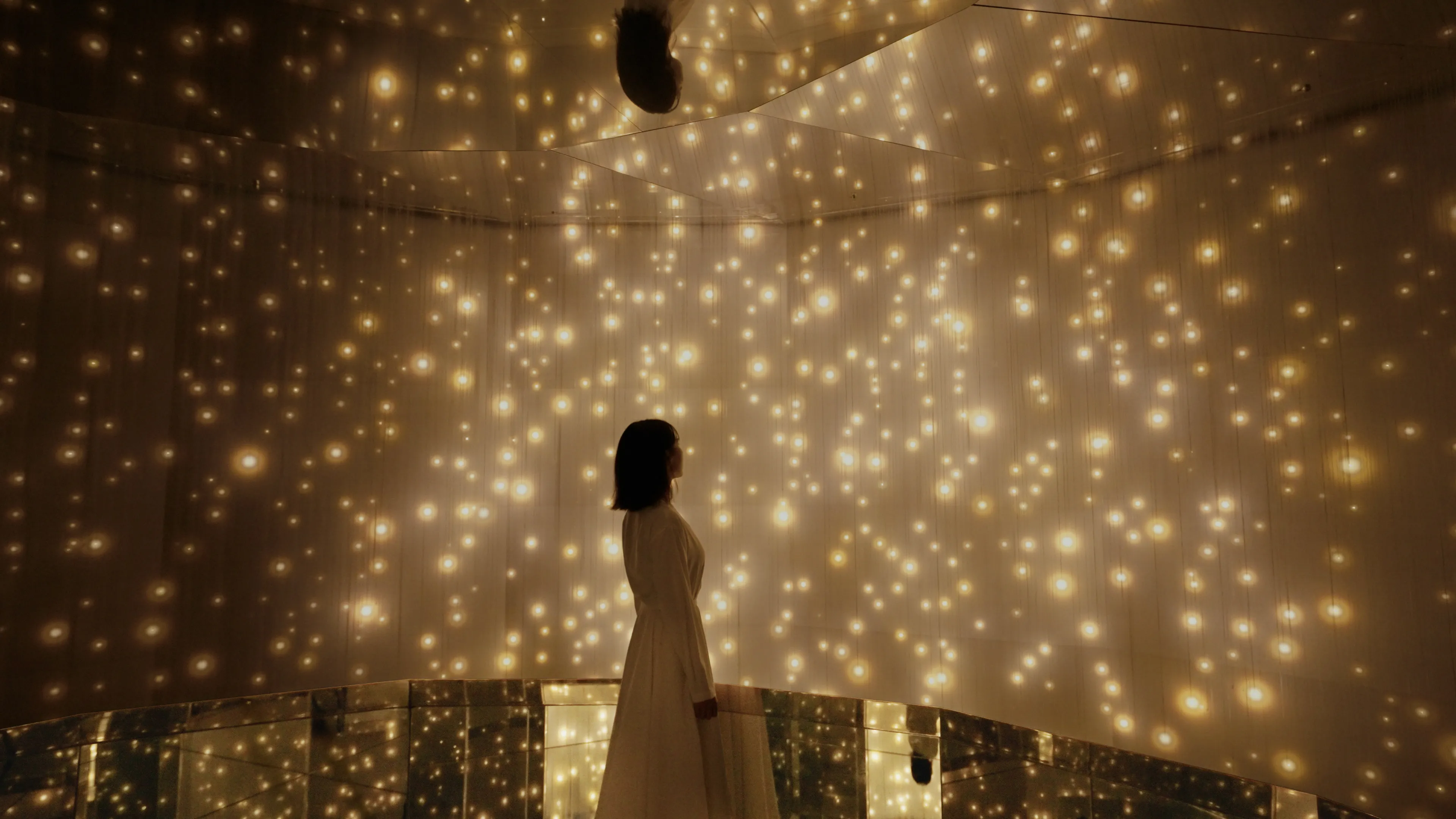 Each sphere of light can be clearly perceived in the space as a mass seemingly made of solidified light, however, there is no material surface boundary. The perception of the boundary between the artwork and your body is ambiguous.