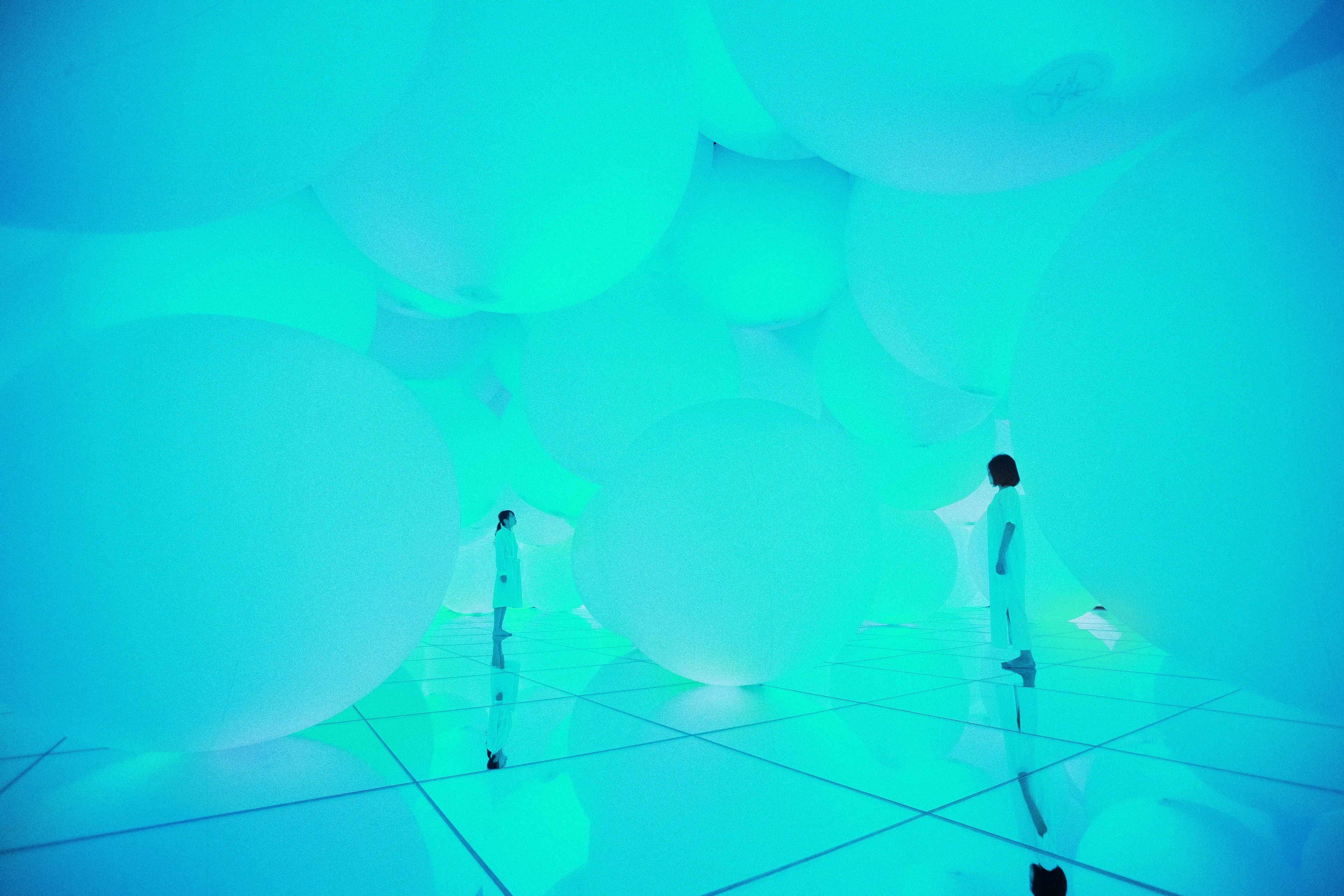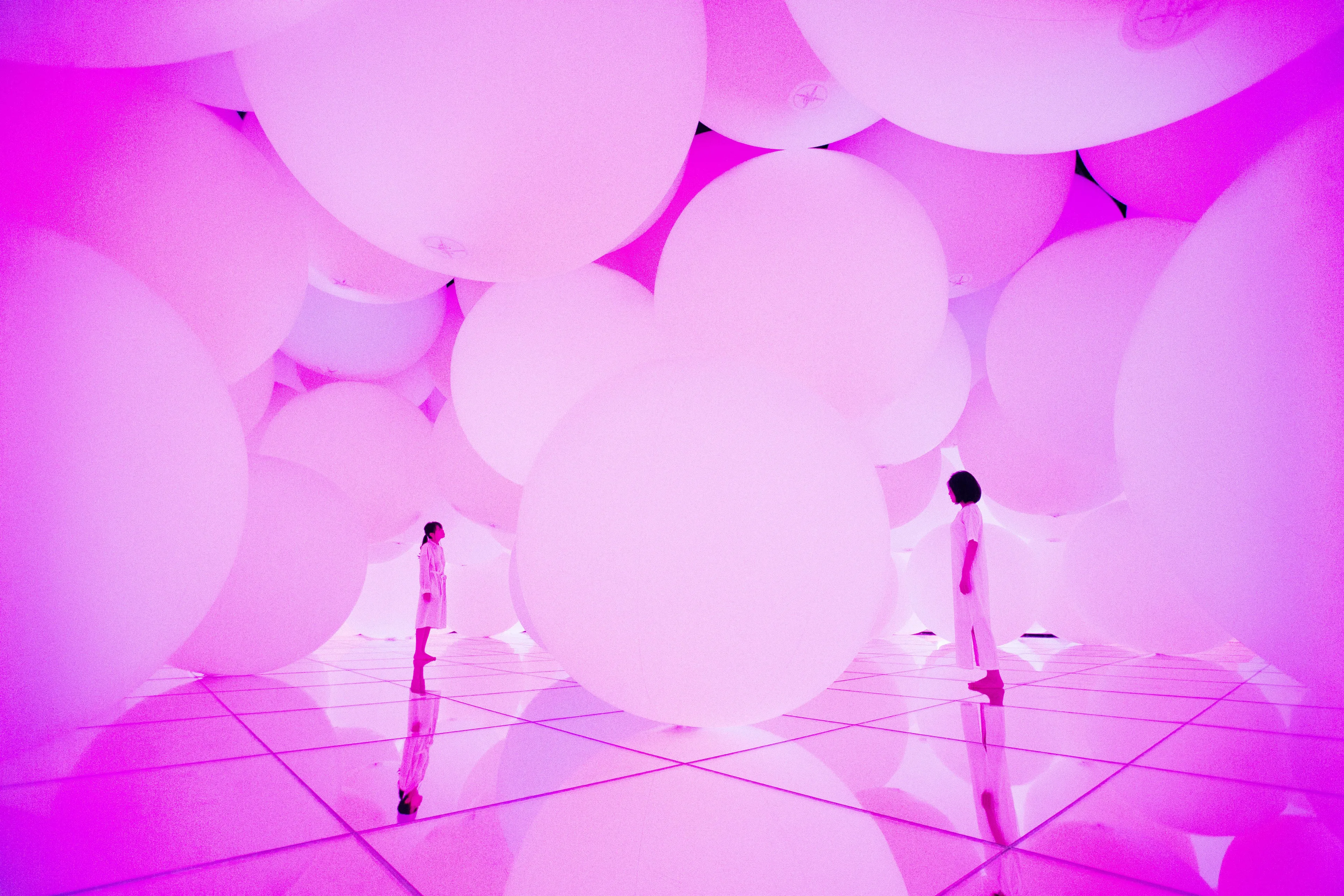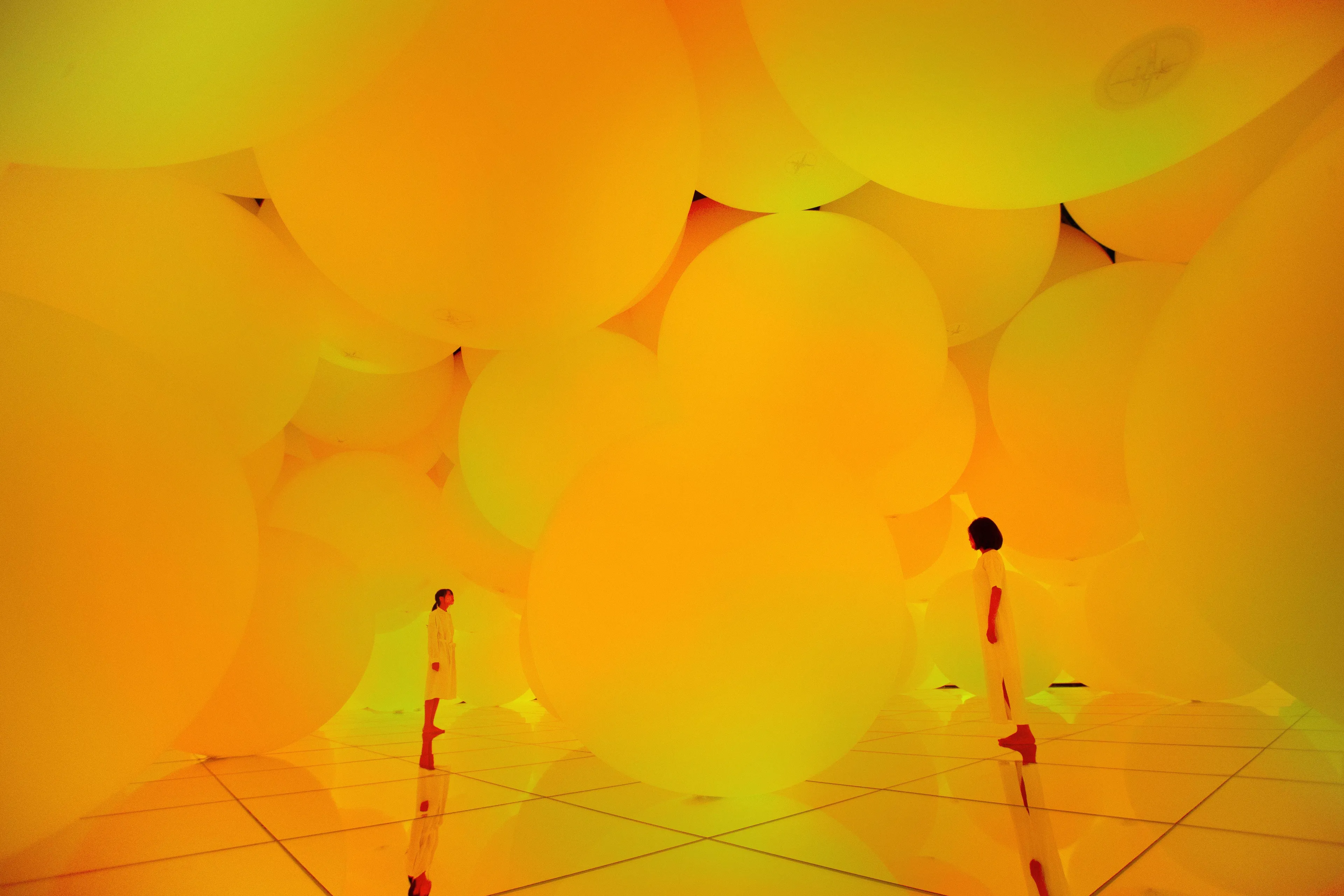 When the spheres change color, the space itself shifts between a collection of spheres forming a three-dimensional space and a flat color wall.