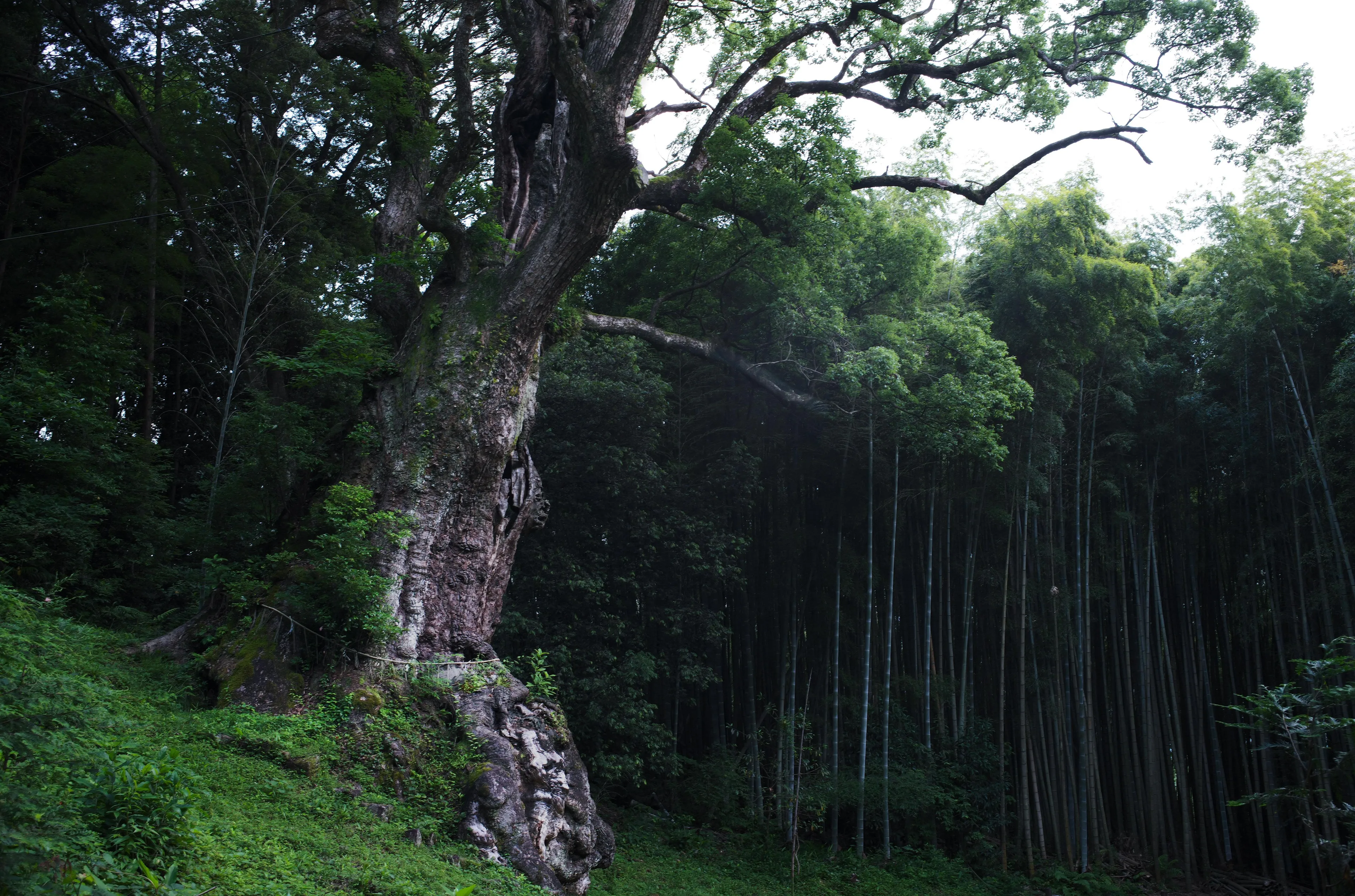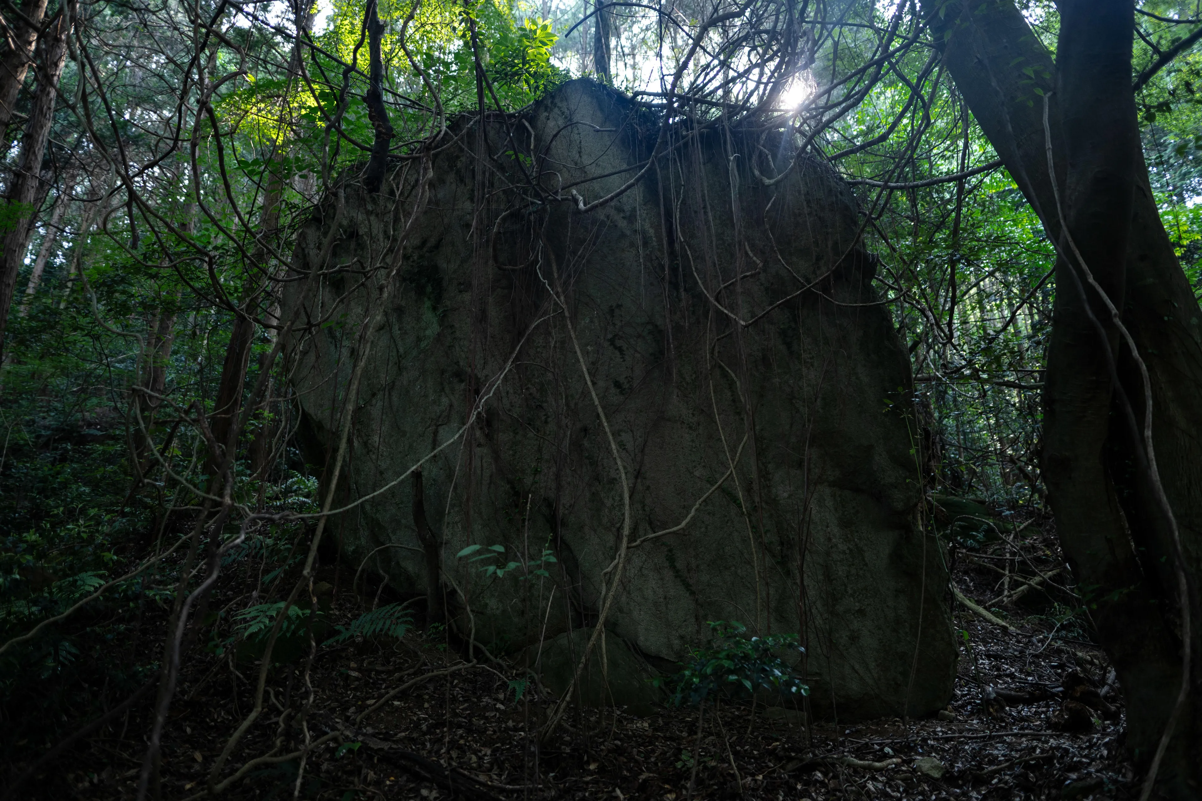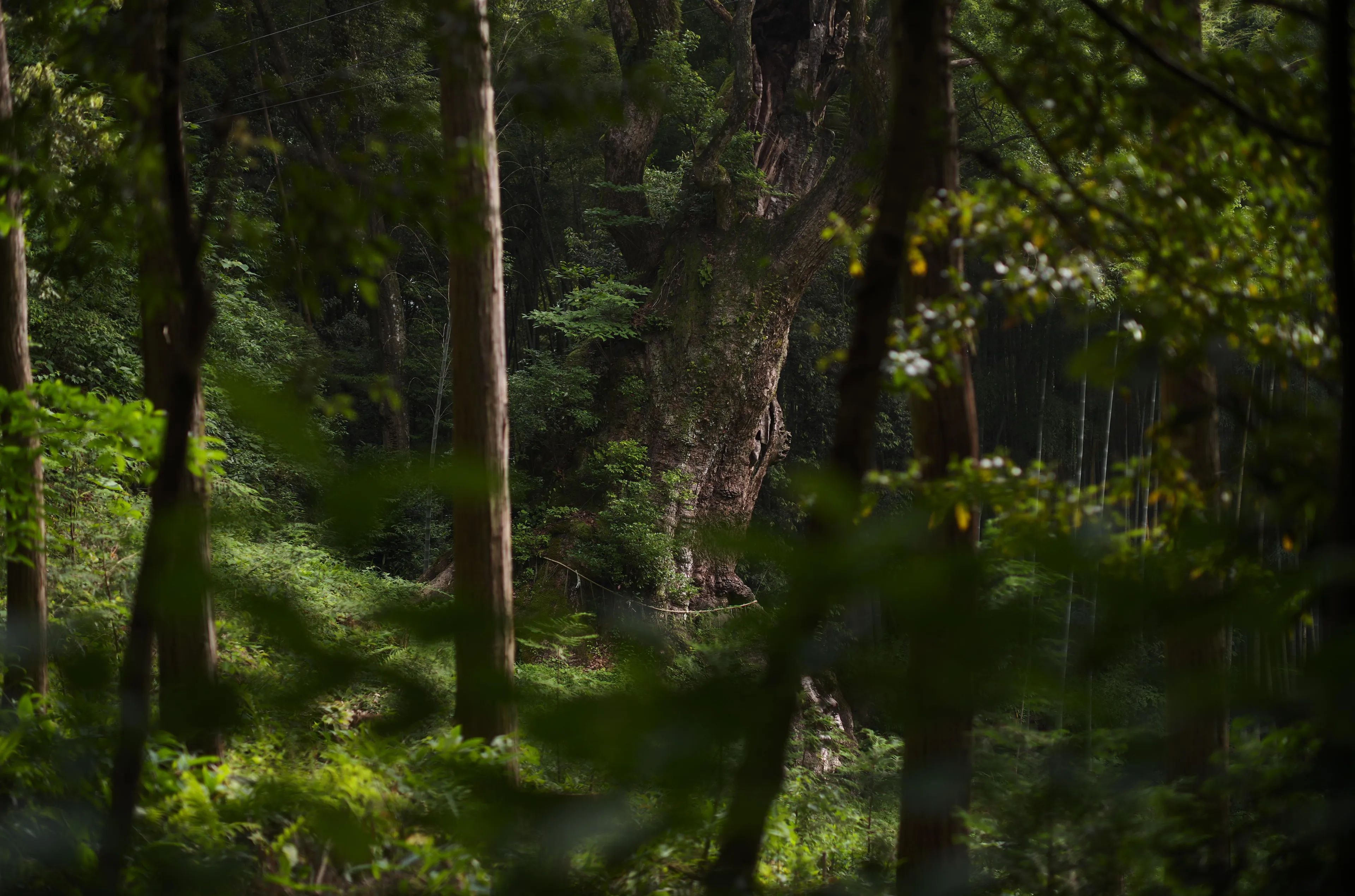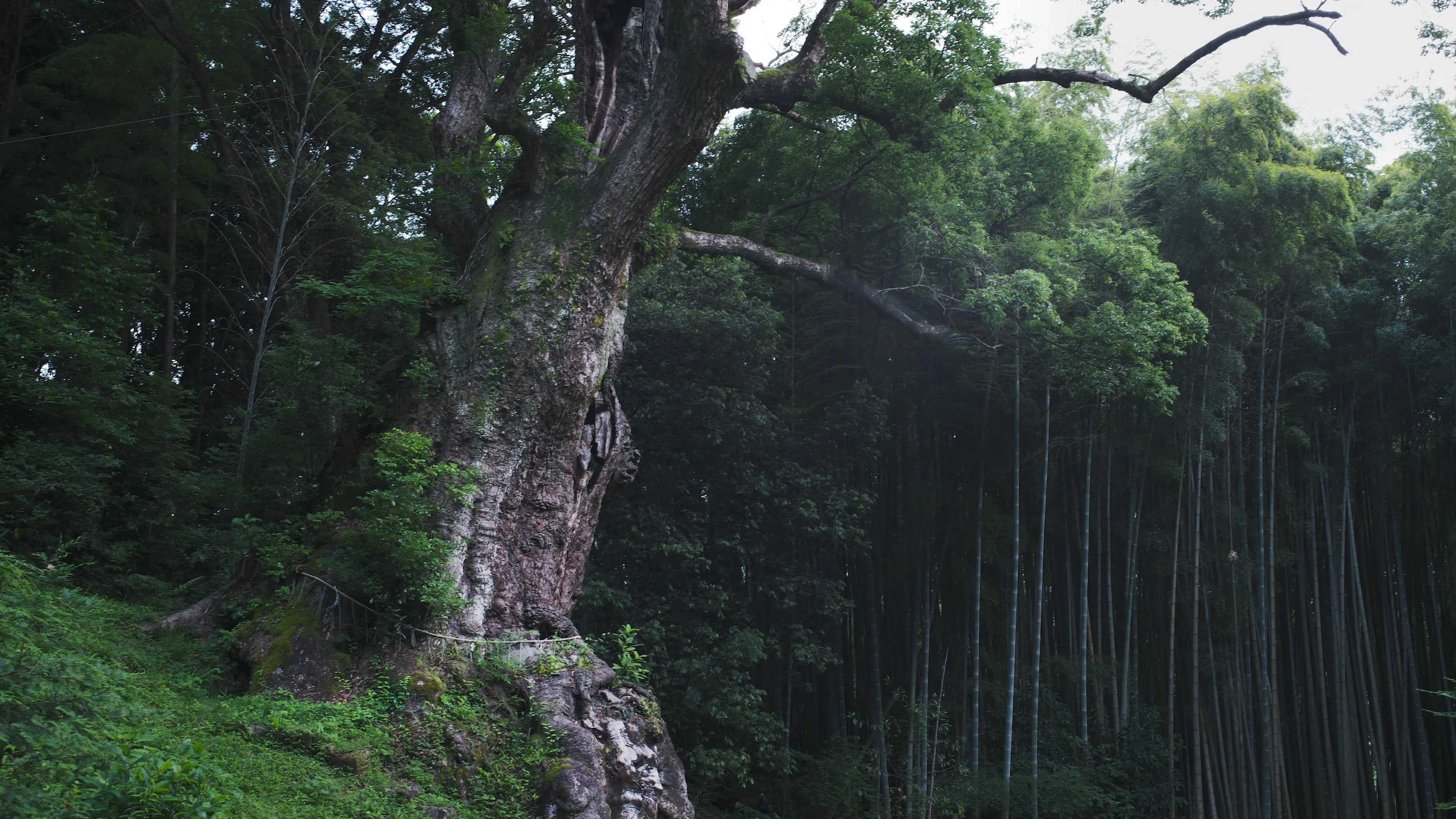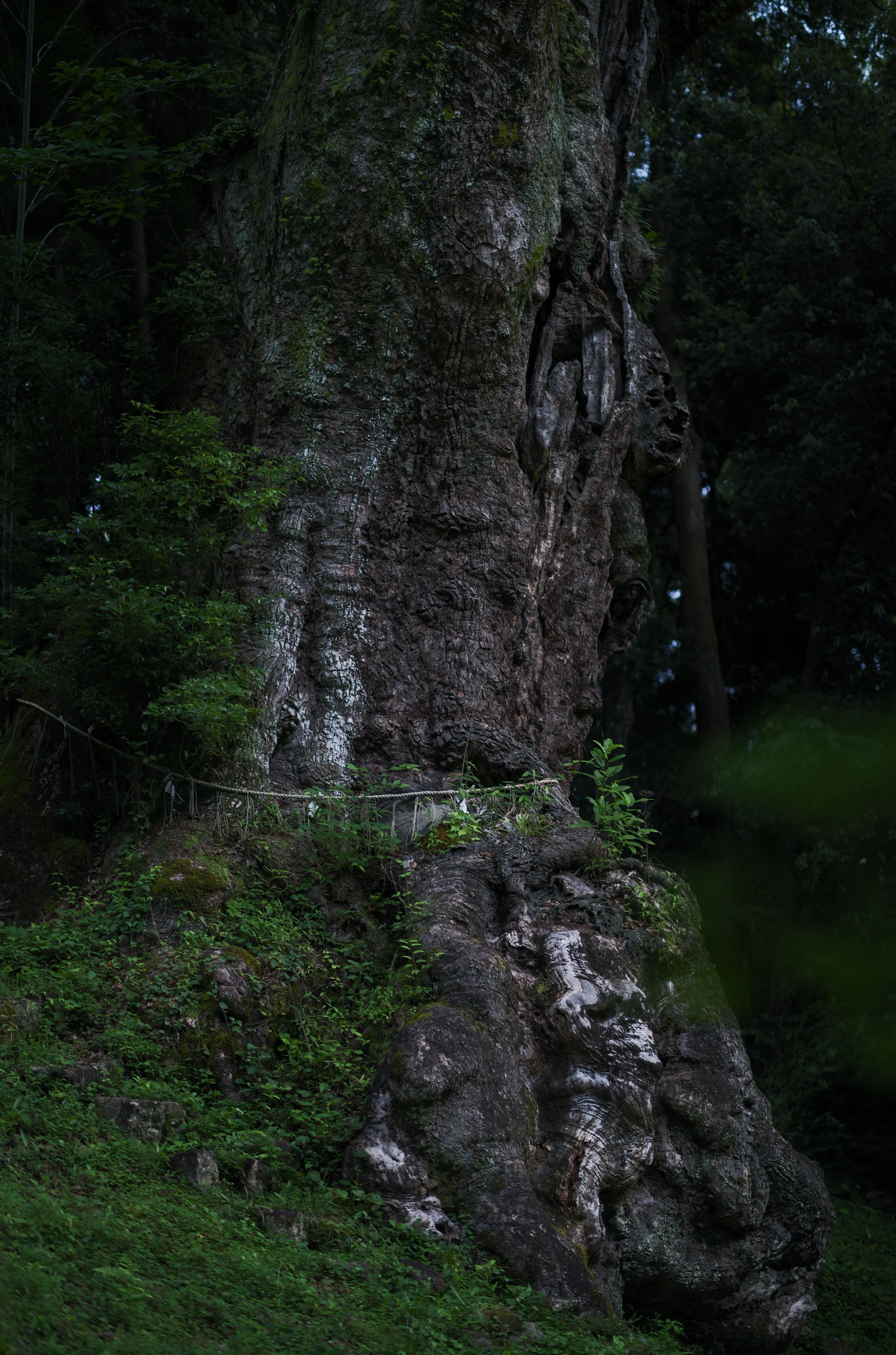 A giant tree over 3,000 years old. The roots of the tree are wrapped in rough bark, with their central section split open near the surface of the ground. The interior is a hollow space about 22 square meters in size, with a stone shrine in the back.