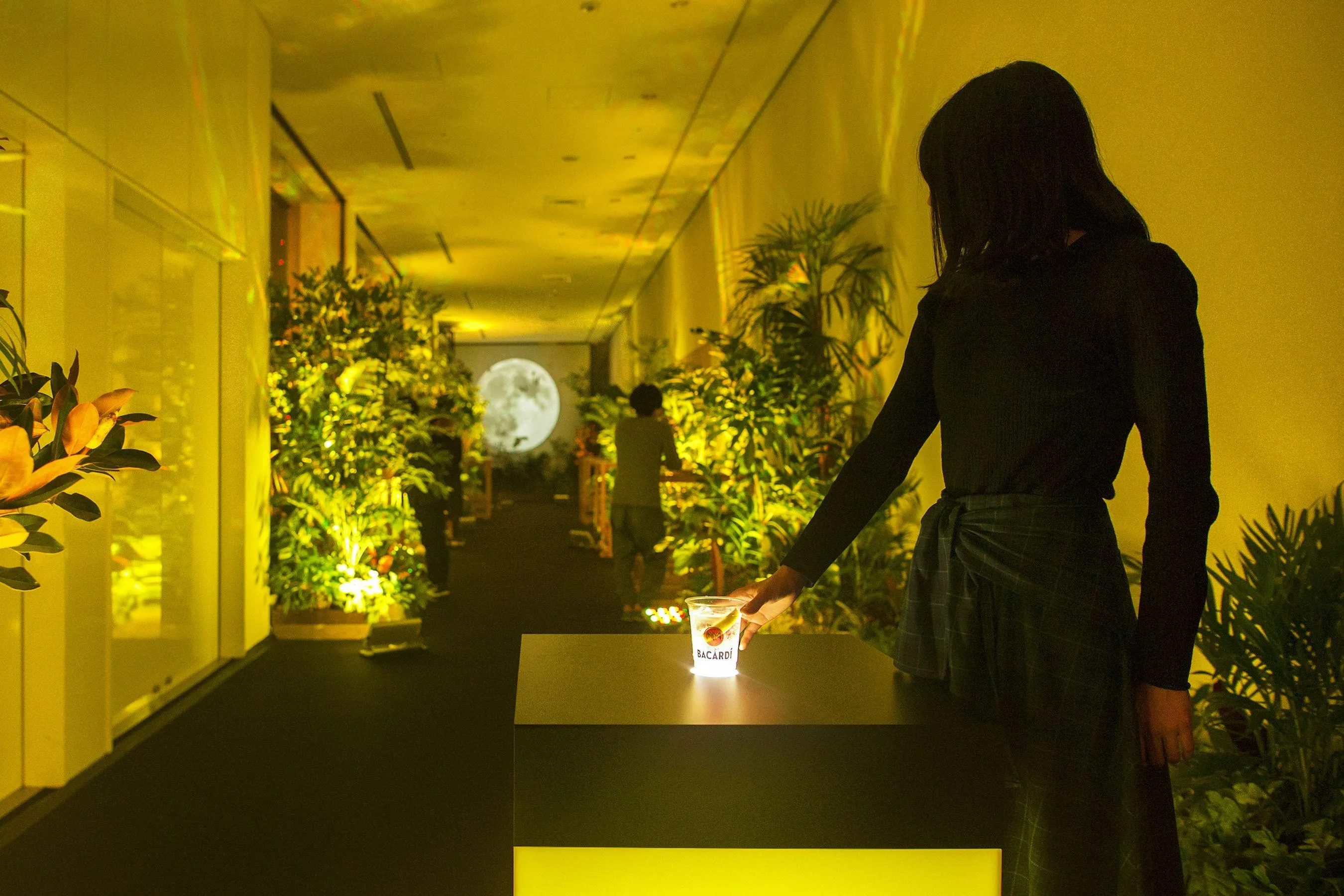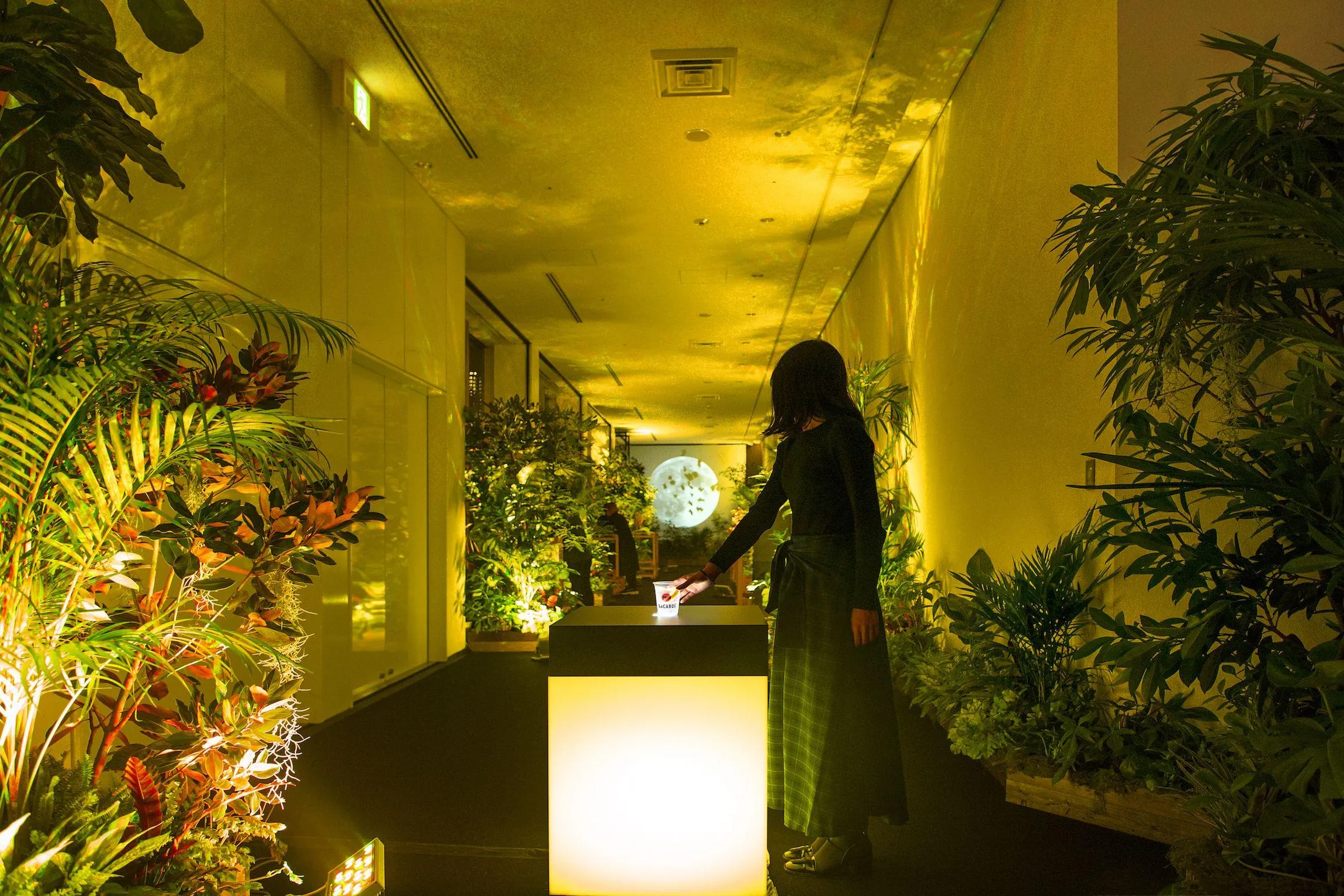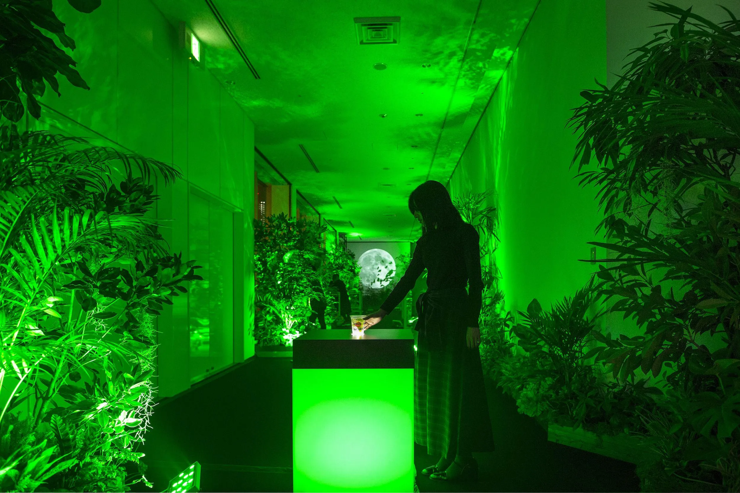 Experience an interactive light bar surrounded by bats and trees. When you put the drink on the high table, 25m-high trees turn to the light color of the drink, and the space is filled with colored light. You can experience it even without purchasing a drink.