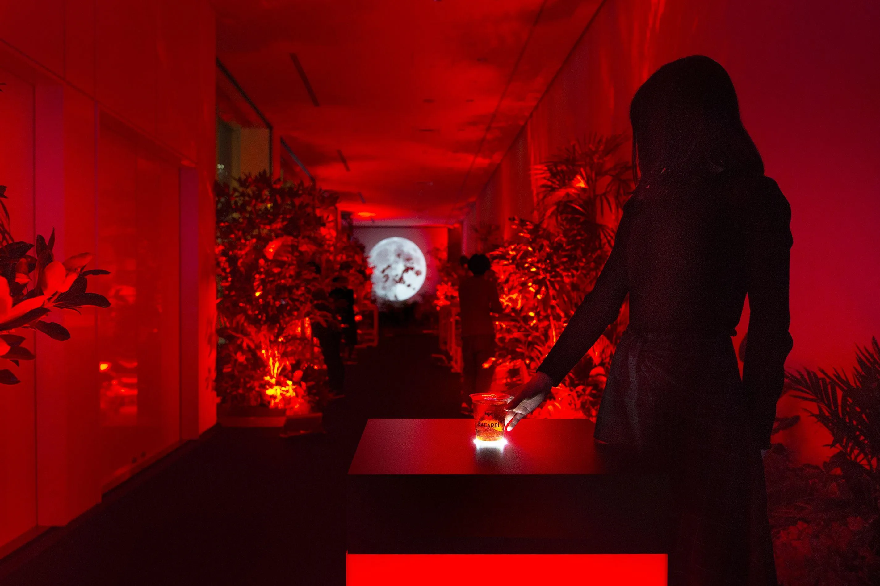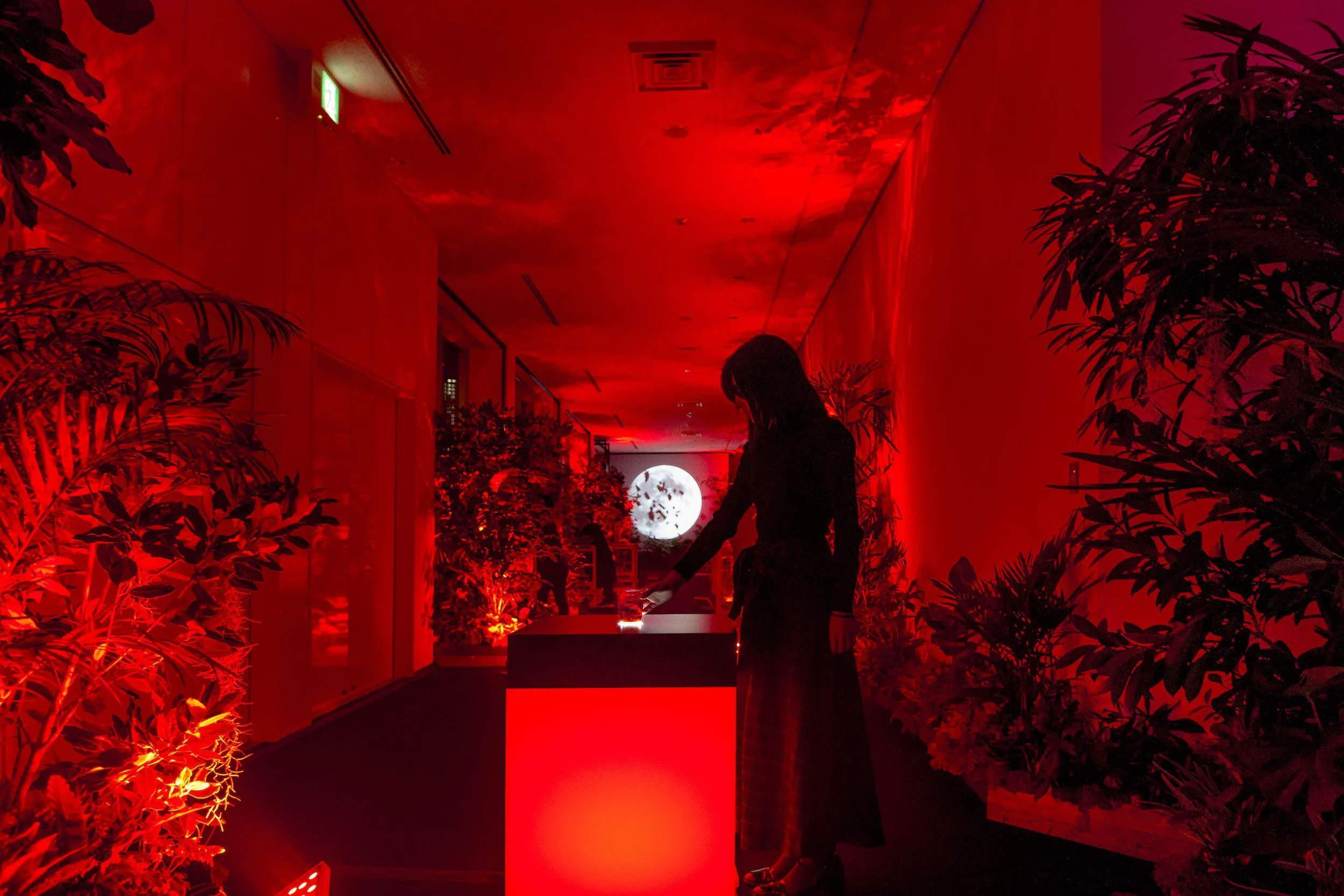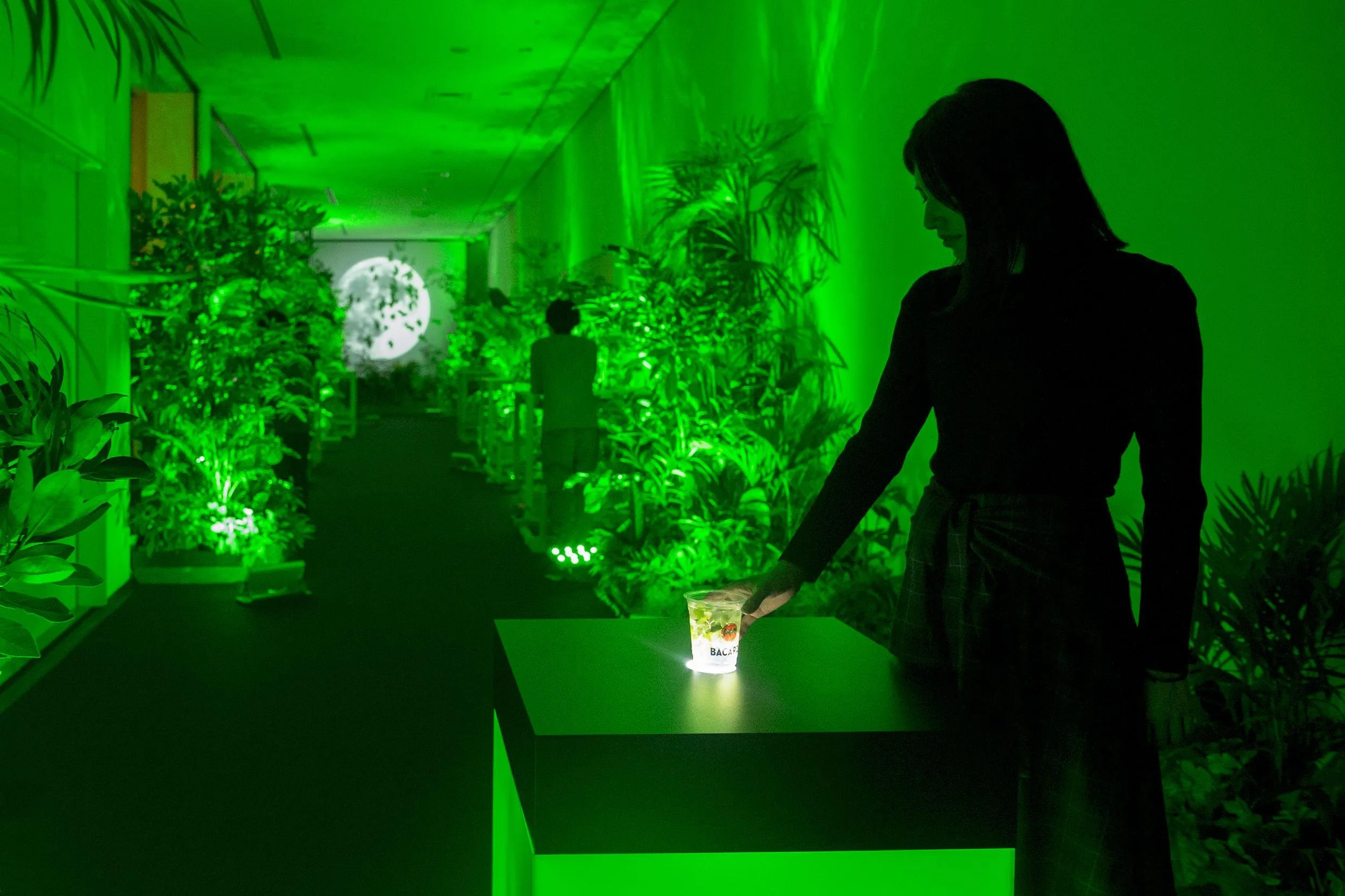 Experience an interactive light bar surrounded by bats and trees. When you put the drink on the high table, 25m-high trees turn to the light color of the drink, and the space is filled with colored light. You can experience it even without purchasing a drink.