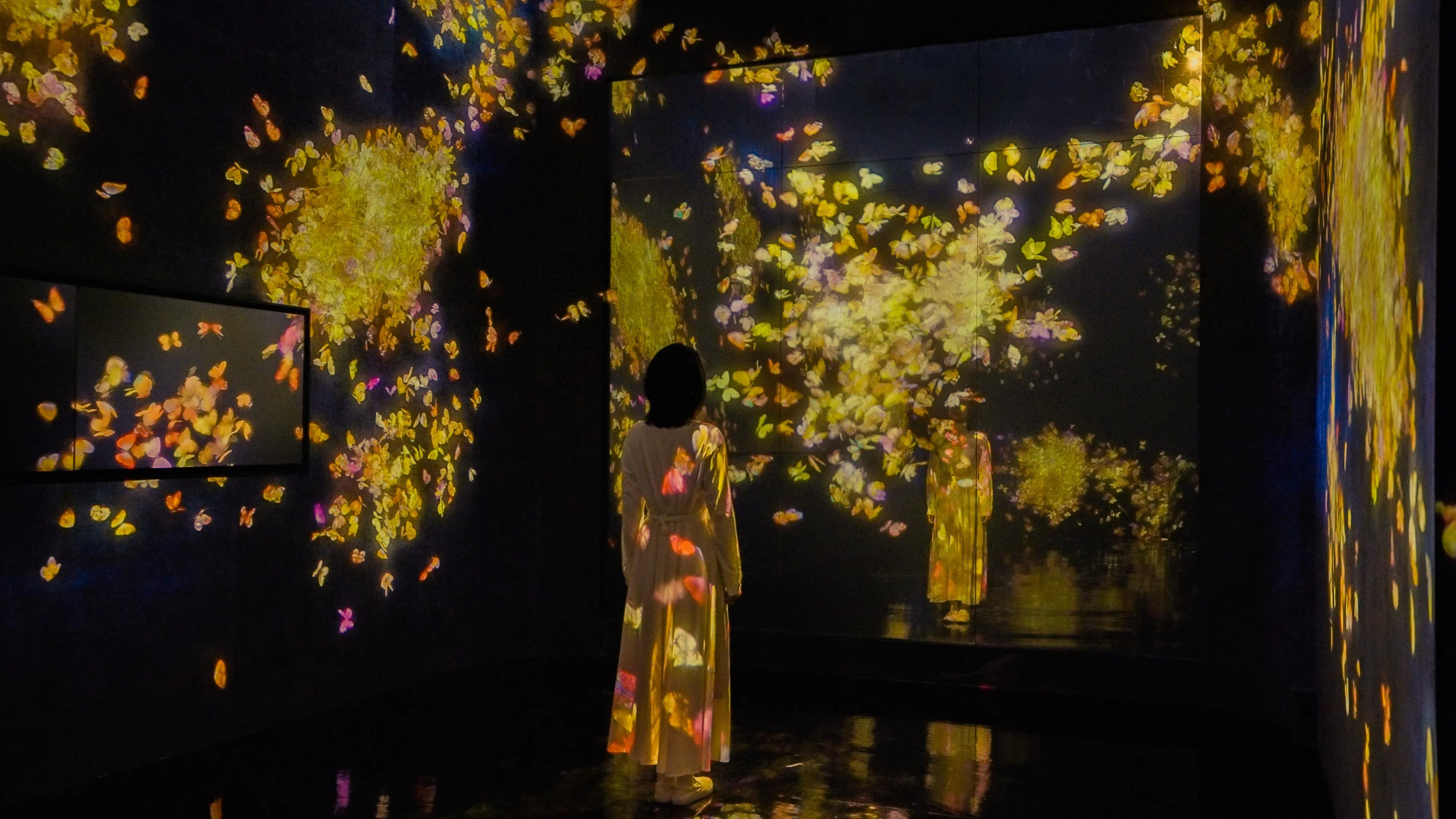 When no one is in the Butterfly House space, it is completely dark and nothing exists. When people enter the Butterfly House space, butterflies emerge from their bodies, and flutter from their feet to the floor. If people touch the butterflies they scatter.