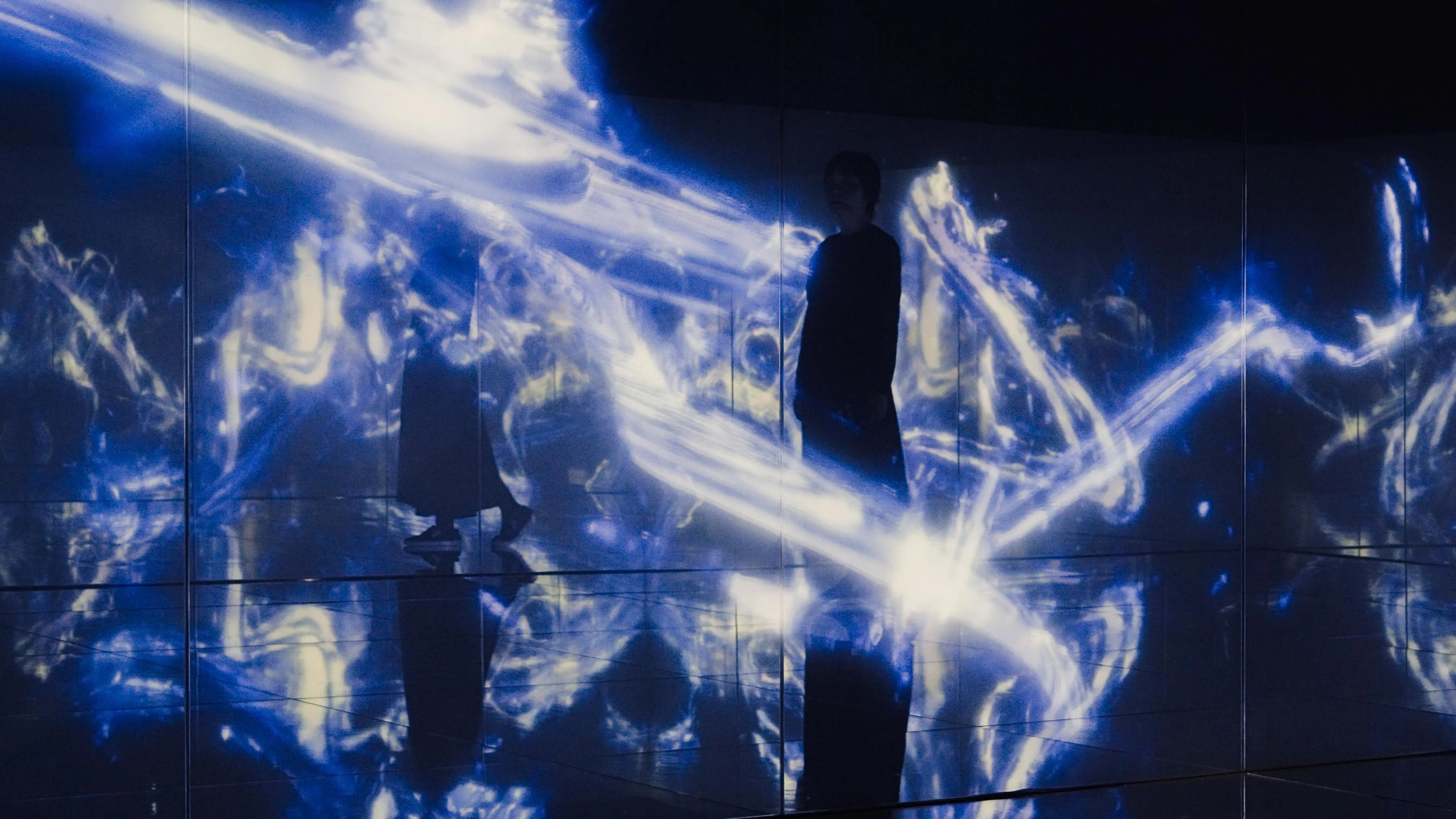 Spatial Calligraphy is a form of calligraphy drawn in space that teamLab has been exploring since it was founded. The artwork reconstructs calligraphy in three-dimensional space to express the depth, speed, and power of the brush stroke, and that calligraphy is then flattened using the logical structure of space that teamLab calls Ultrasubjective Space. The calligraphy shifts between two and three dimensions.