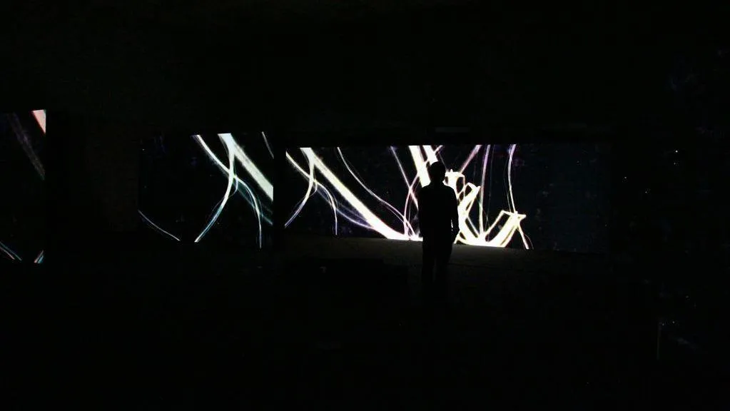 This artwork explores Japanese spatial awareness. It exists in a three-dimensional space that we call ultrasubjective space. The Japanese mythical bird Yatagarasu,* rendered in light, flies around the space leaving trails of light in its path, creating spatial calligraphy. As the crows chase and are chased by one another through the air, they turn into flowers and eventually scatter.