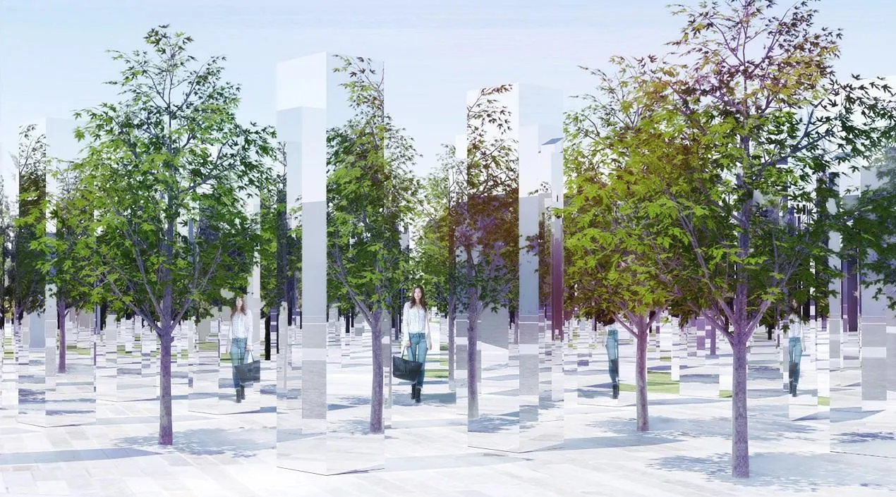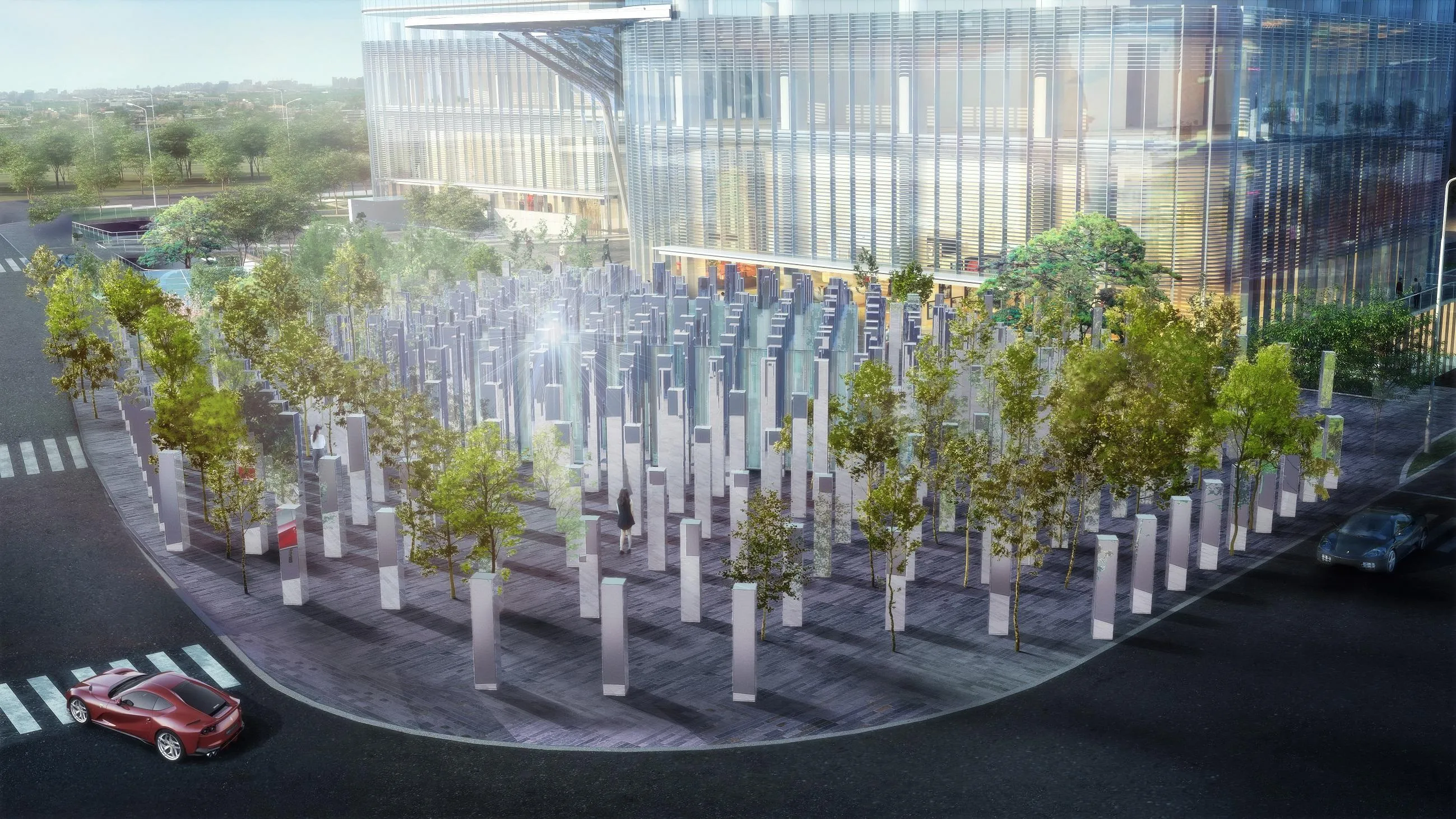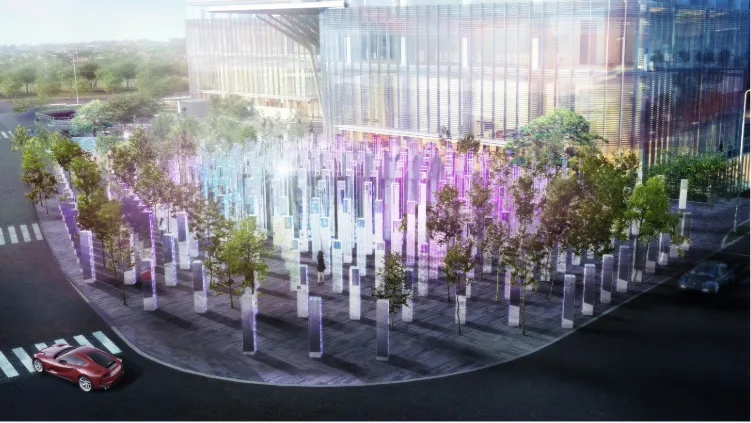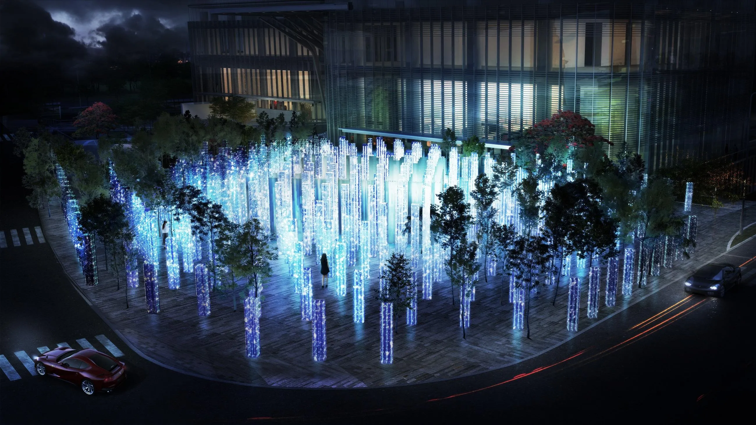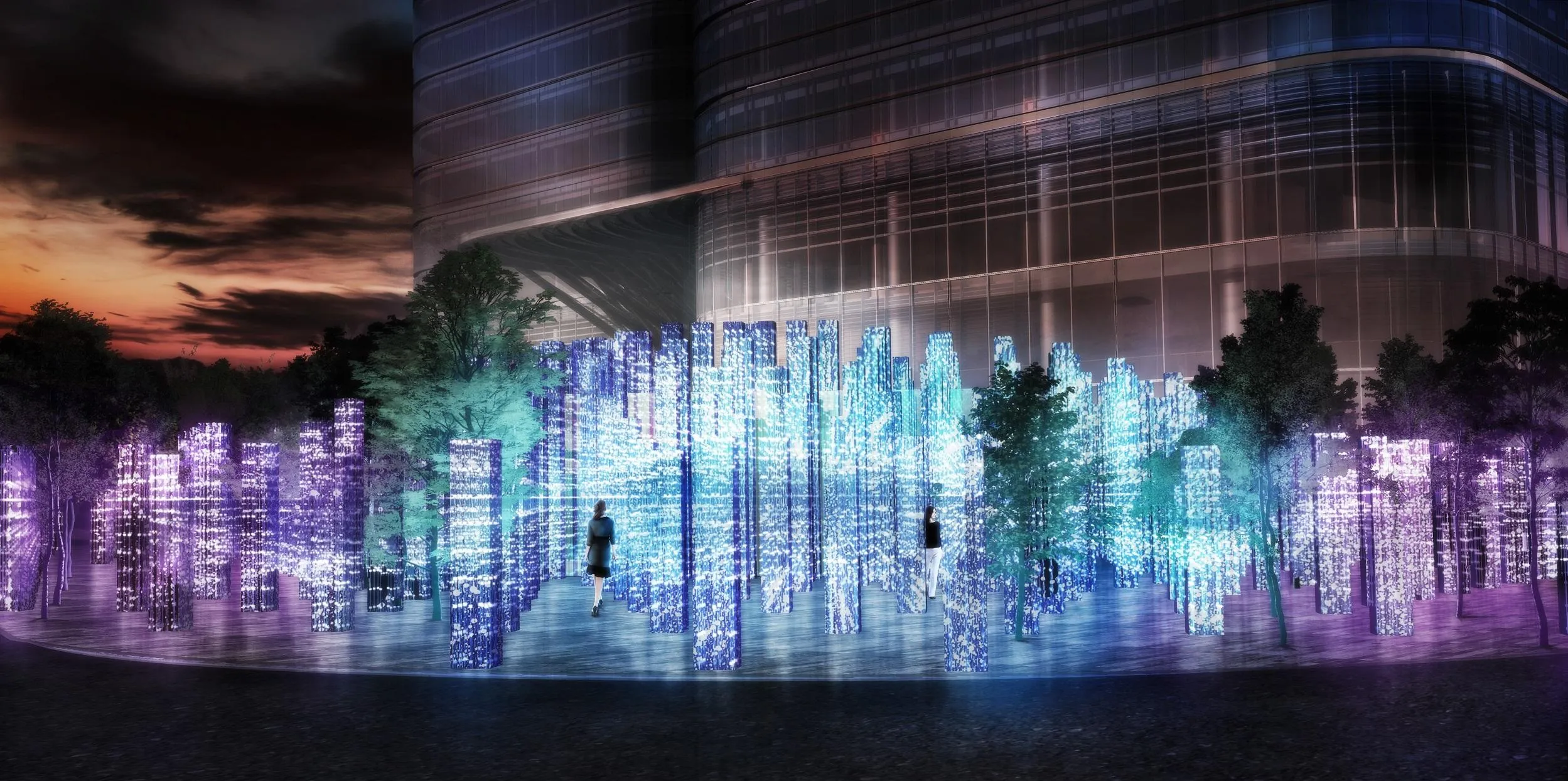 "Crystal Forest Square" (under planning) is made up of a group of crystal pillars made of a collection of points of light, and the set of points of light by a group of crystal pillars creates one solid object. Because the three-dimensional object is made of light, it functions interactively and we can control it digitally.