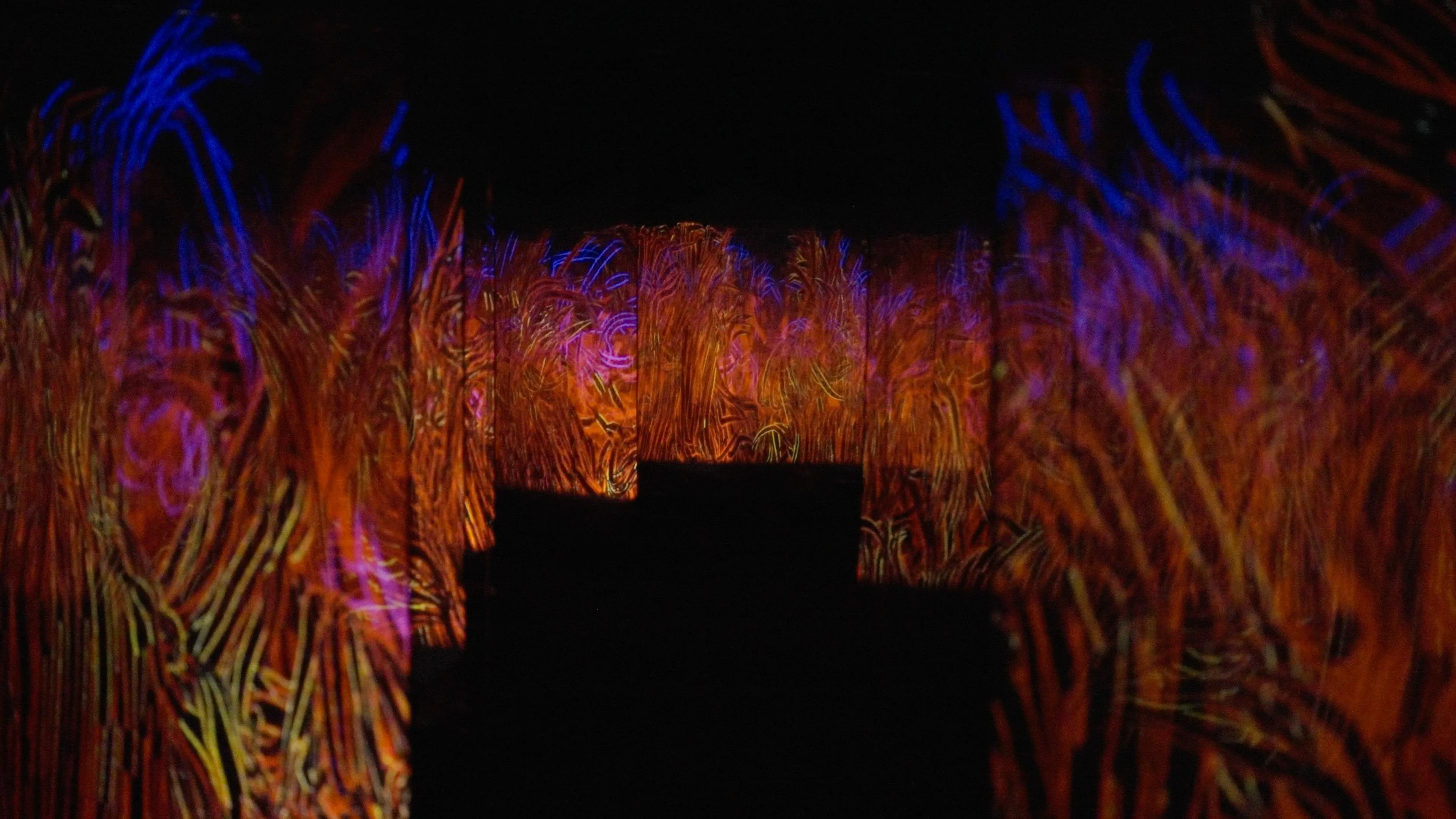 To the viewer, the other people engulfed in flames exist in the world of the artwork, and when the viewer is seen by others as engulfed in flames, they also exist in the space of the artwork.