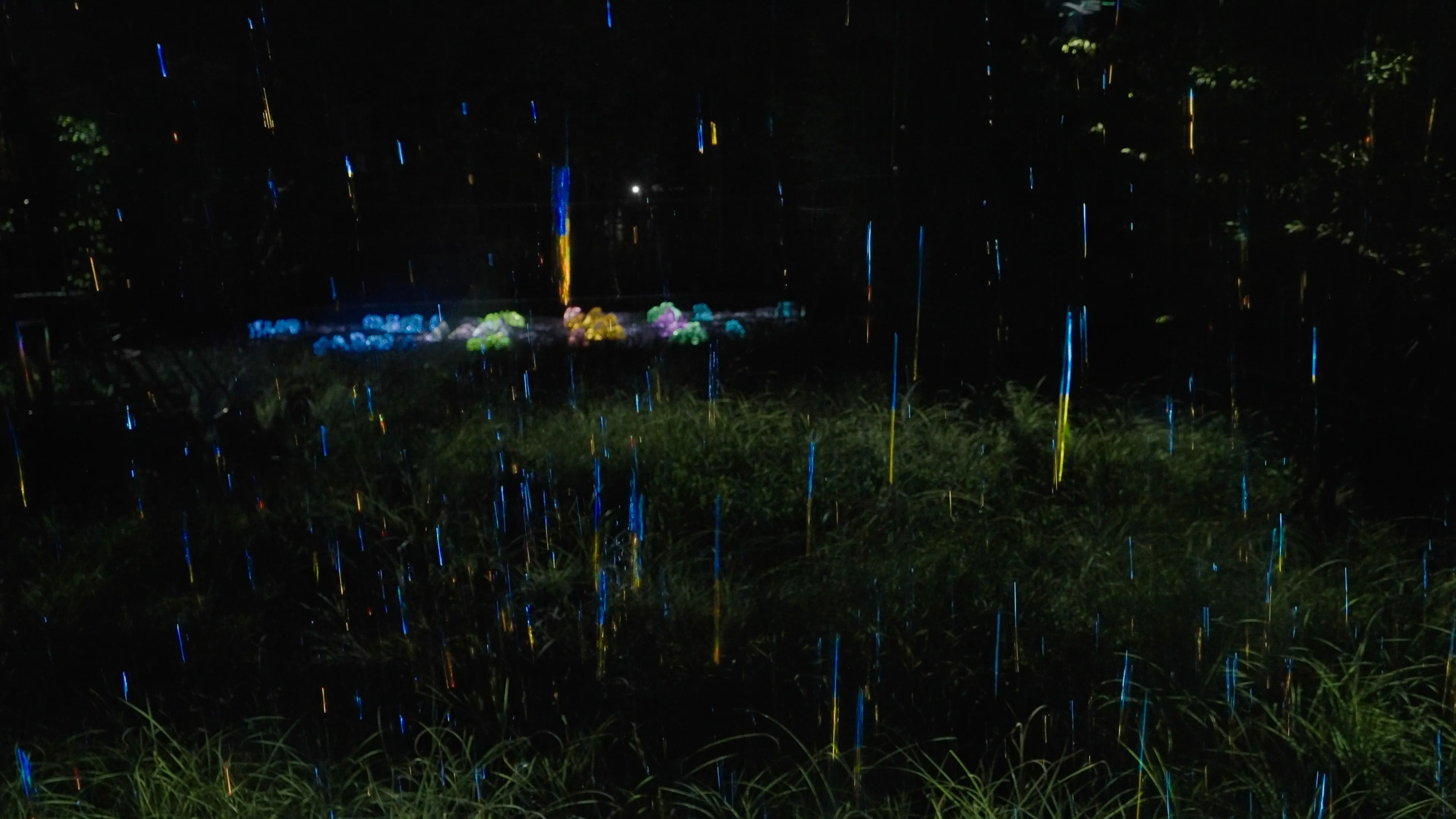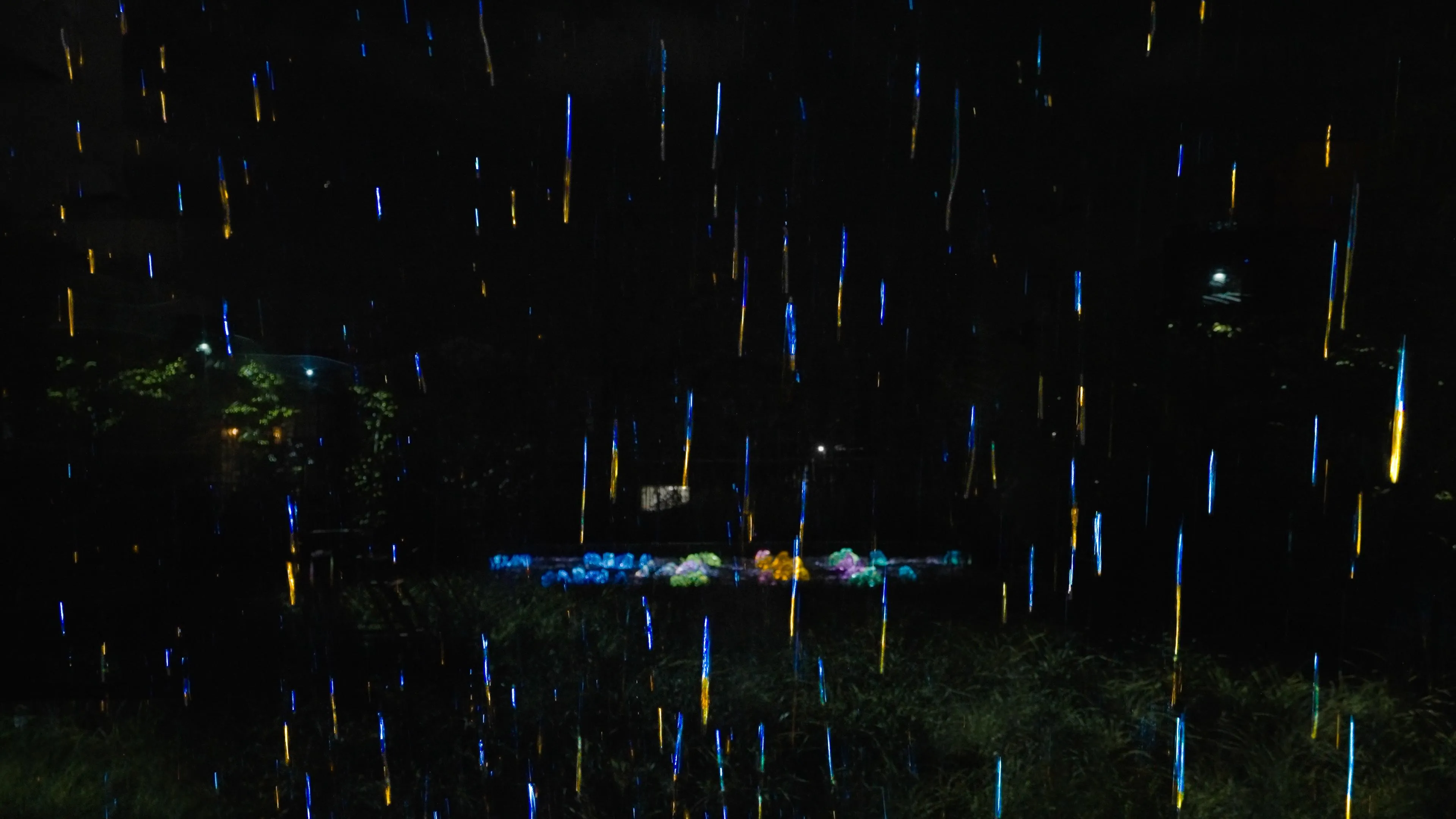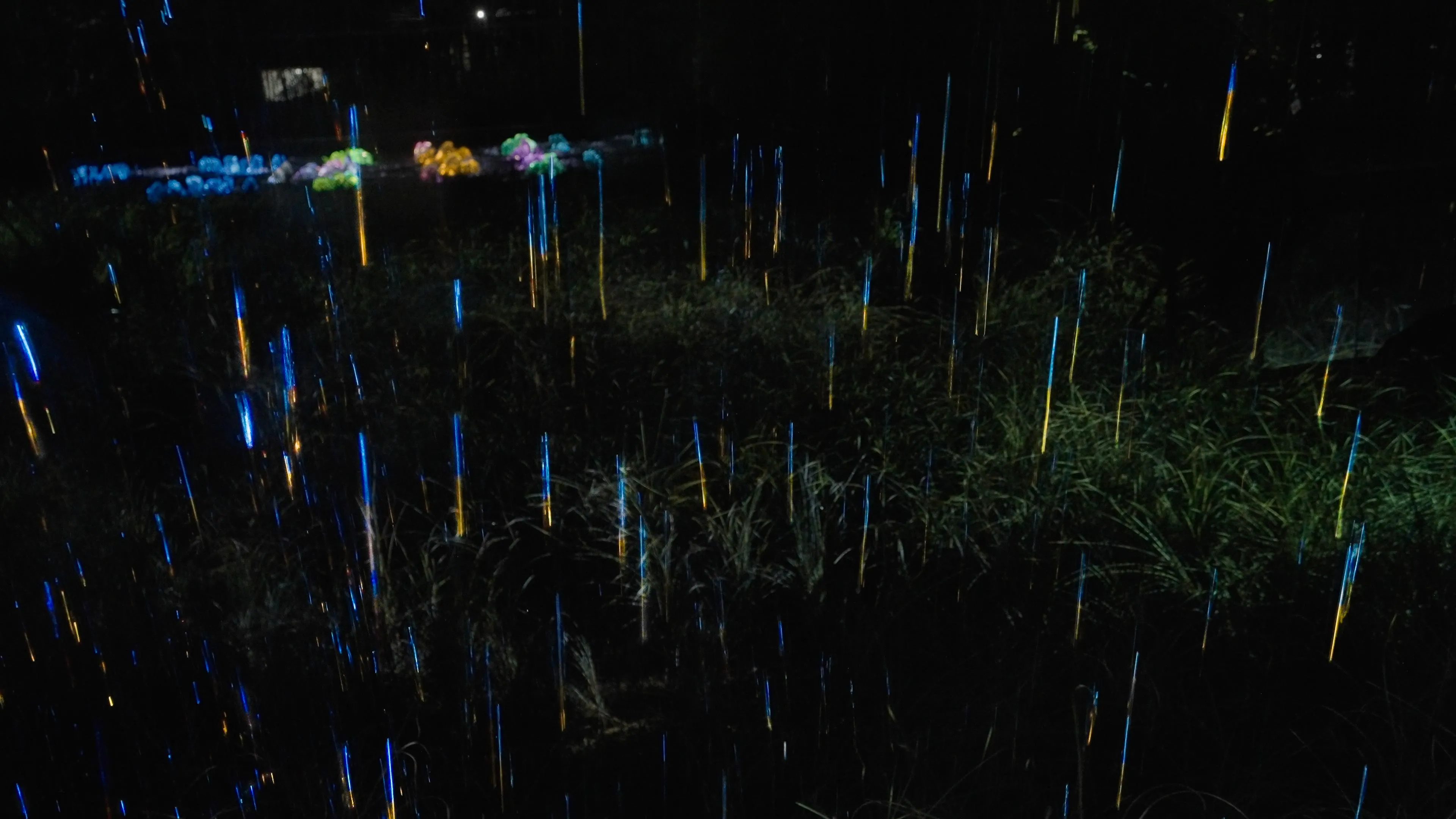 On a night of heavy rain, the falling rain over the grassland becomes an artwork.