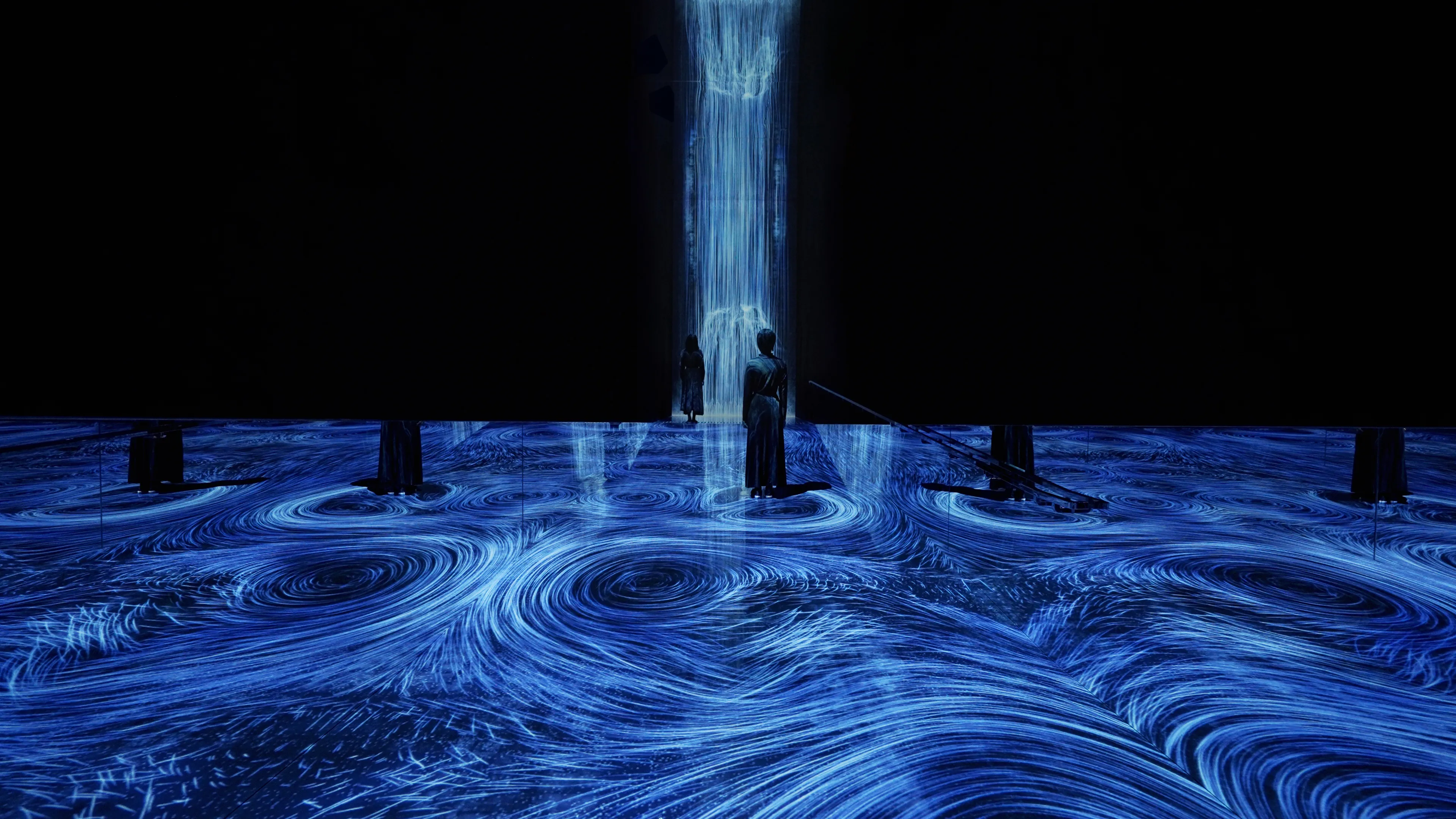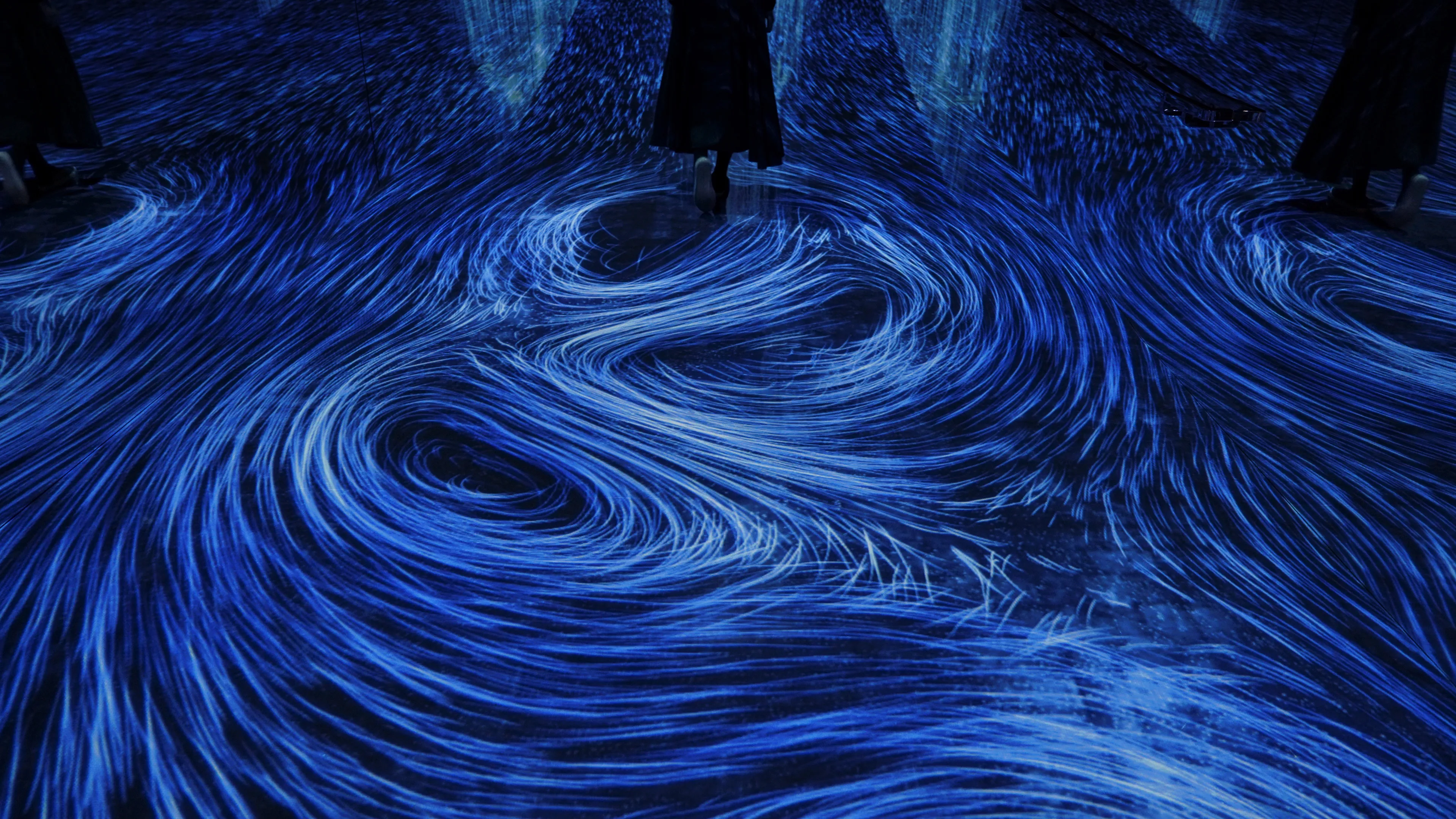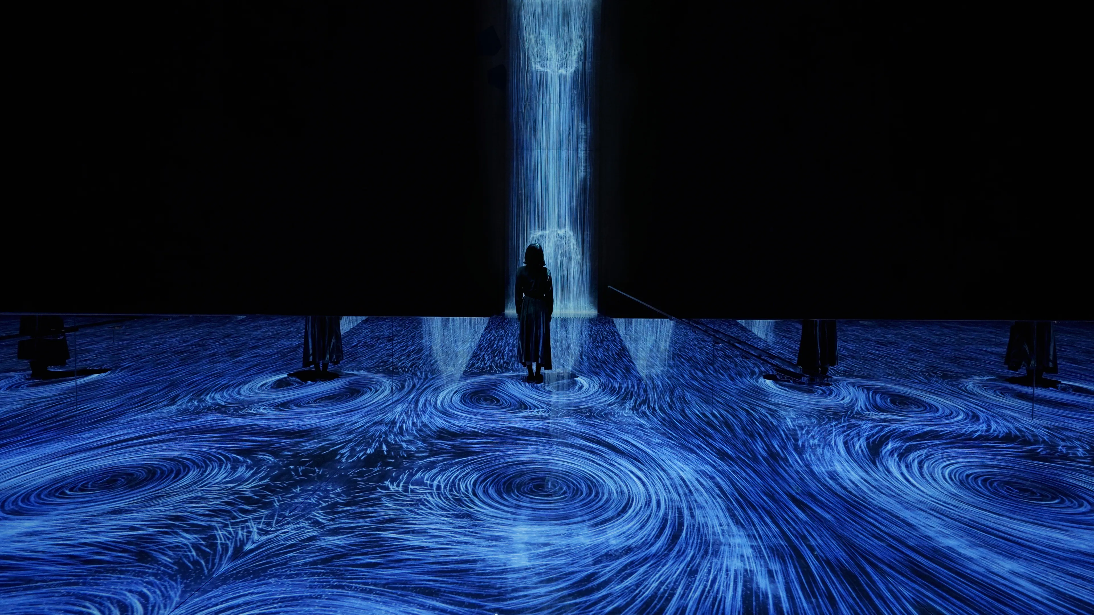 Water is depicted as a continuum of countless water particles, and the interactions between the particles are calculated to create a three-dimensional simulation of their movement. The vortices create lines from the trails of these particles. The collection of three-dimensional lines are then cut out using what teamLab calls Ultrasubjective Space. In contrast to space that is created through, or cut out by, lenses and perspective, Ultrasubjective Space does not fix the viewer’s viewpoint and in turn frees their body. The floor and walls that the vortices are seen on do not become a boundary between the viewer and the artwork, and the artwork space becomes continuous with the space in which the viewer’s body exists.
