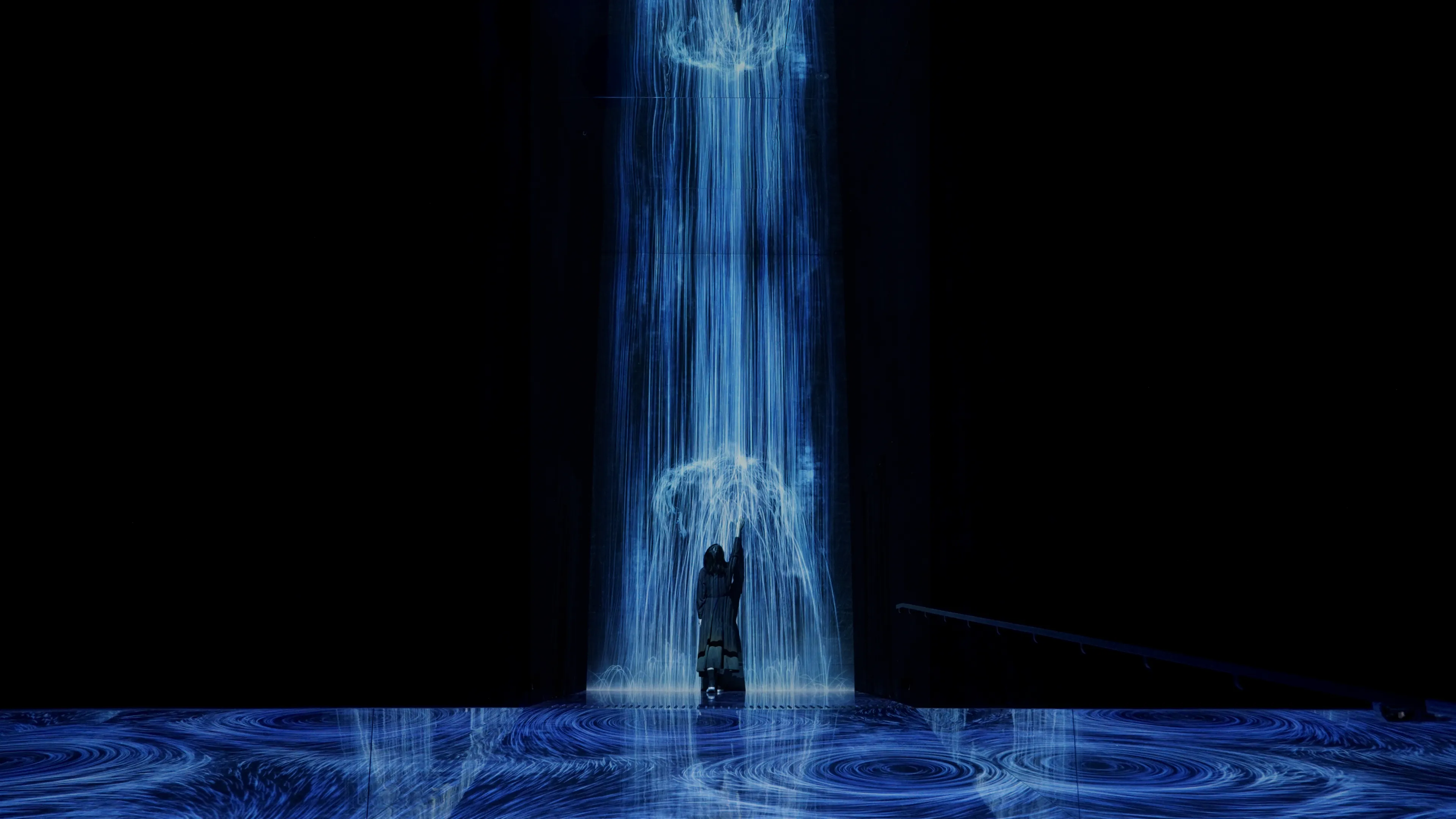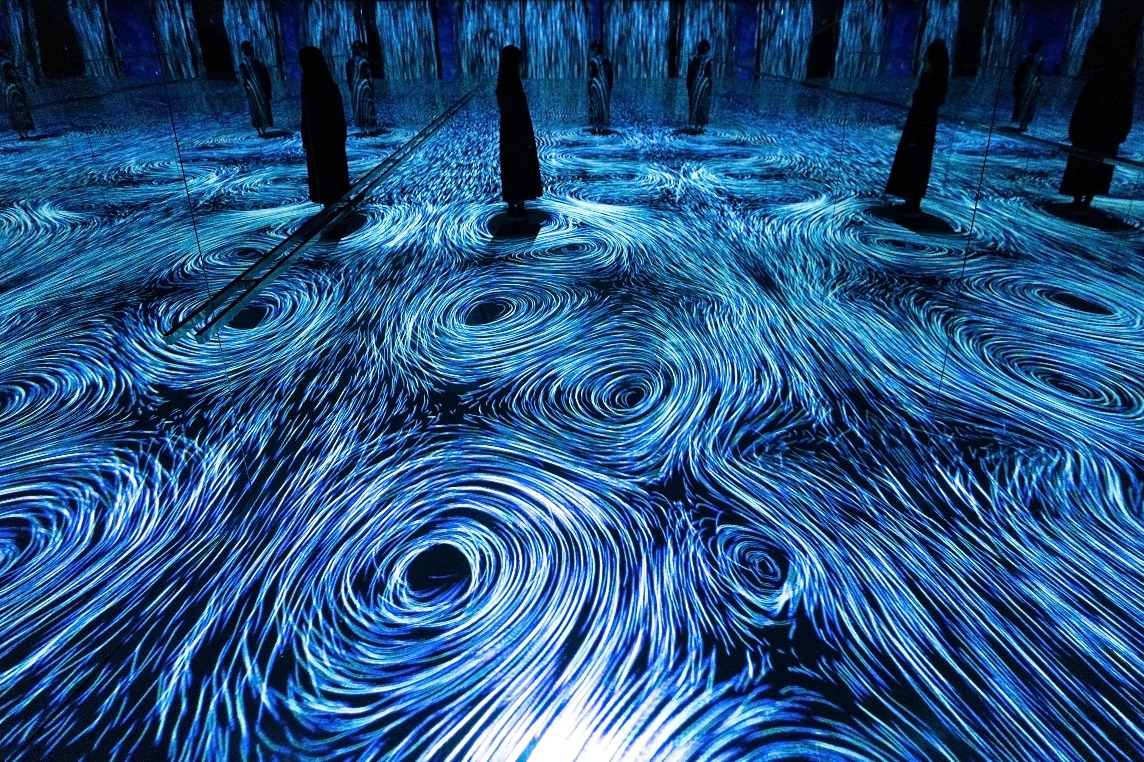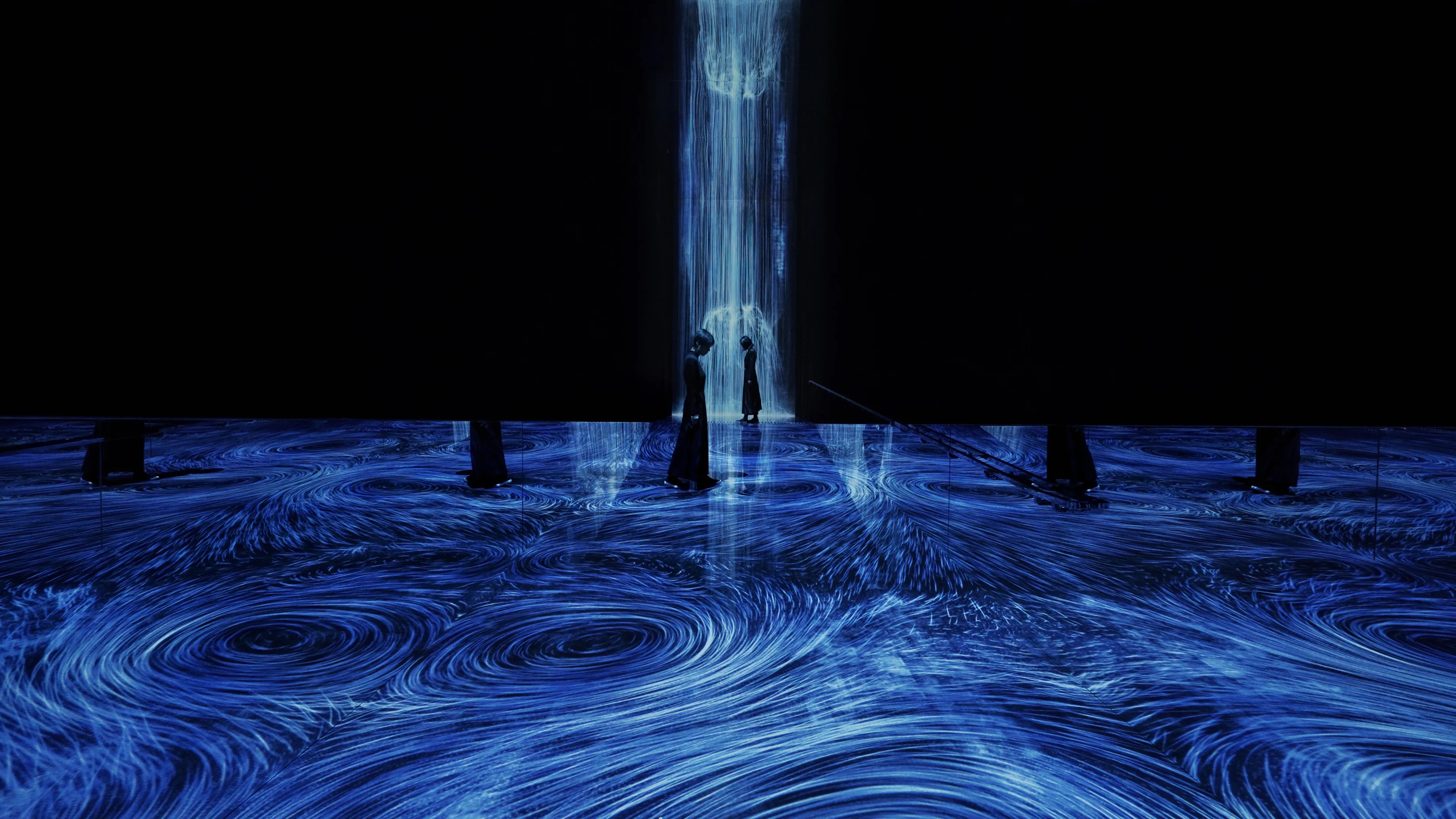 Water is depicted as a continuum of countless water particles, and the interactions between the particles are calculated to create a three-dimensional simulation of their movement. The vortices create lines from the trails of these particles. The collection of three-dimensional lines are then cut out using what teamLab calls Ultrasubjective Space. In contrast to space that is created through, or cut out by, lenses and perspective, Ultrasubjective Space does not fix the viewer’s viewpoint and in turn frees their body. The floor and walls that the vortices are seen on do not become a boundary between the viewer and the artwork, and the artwork space becomes continuous with the space in which the viewer’s body exists.