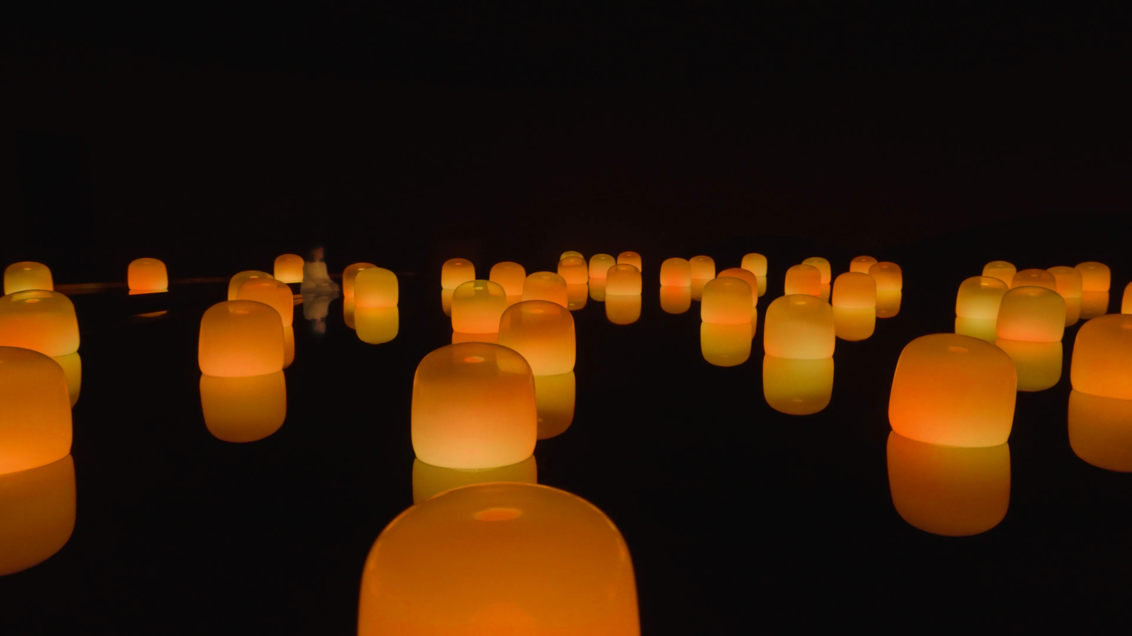 Each Floating Lamp on the water glows with its own rhythm. Over time they mutually influence nearby lamps and Tea in Spontaneous Order, starting a spontaneous order phenomenon, and the rhythms of their flickering become closer to each other. When people push the lamps, their rhythm changes. Then, again a spontaneous order occurs with nearby lamps and Tea in Spontaneous Order.