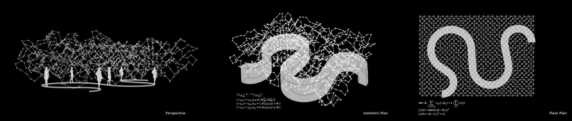 The seemingly random arrangement of lamps in the space is mathematically derived such that, starting from any lamp, a line continuously drawn to the nearest lamp results in a single, connected path of light that passes through every lamp exactly once, like a unicursal stroke.