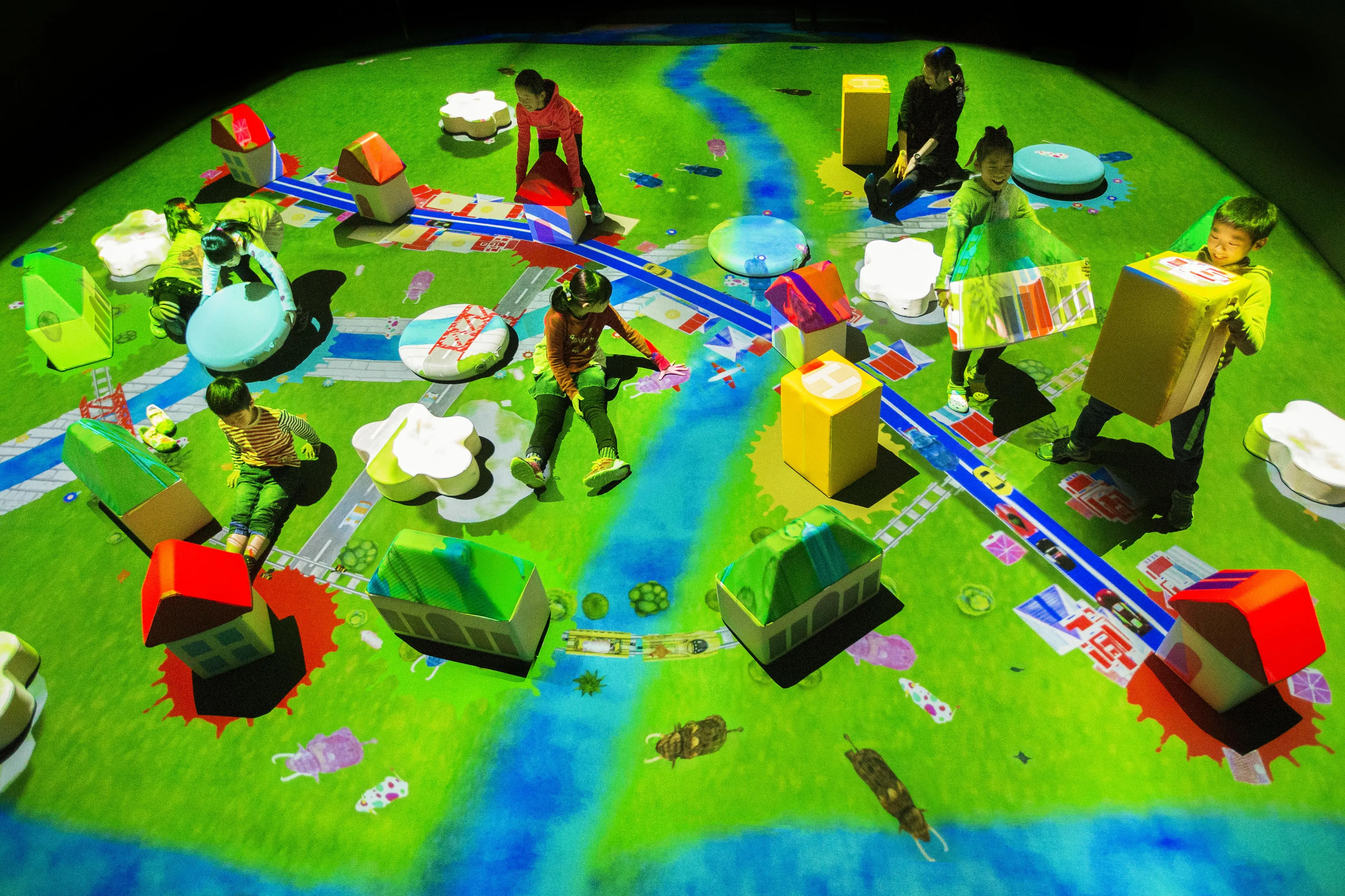 Place giant blocks shaped like houses, stations, buildings to make a town.2