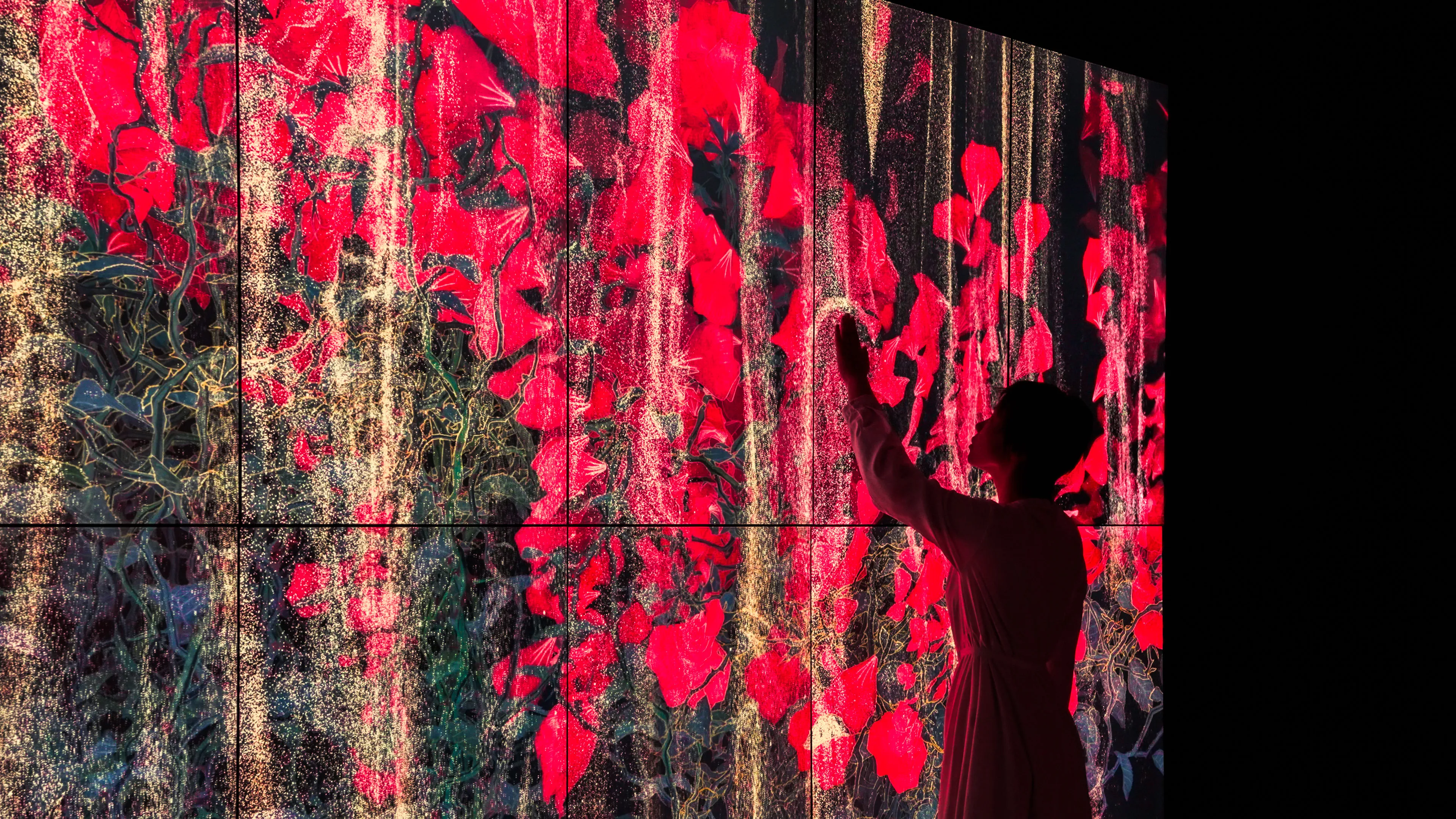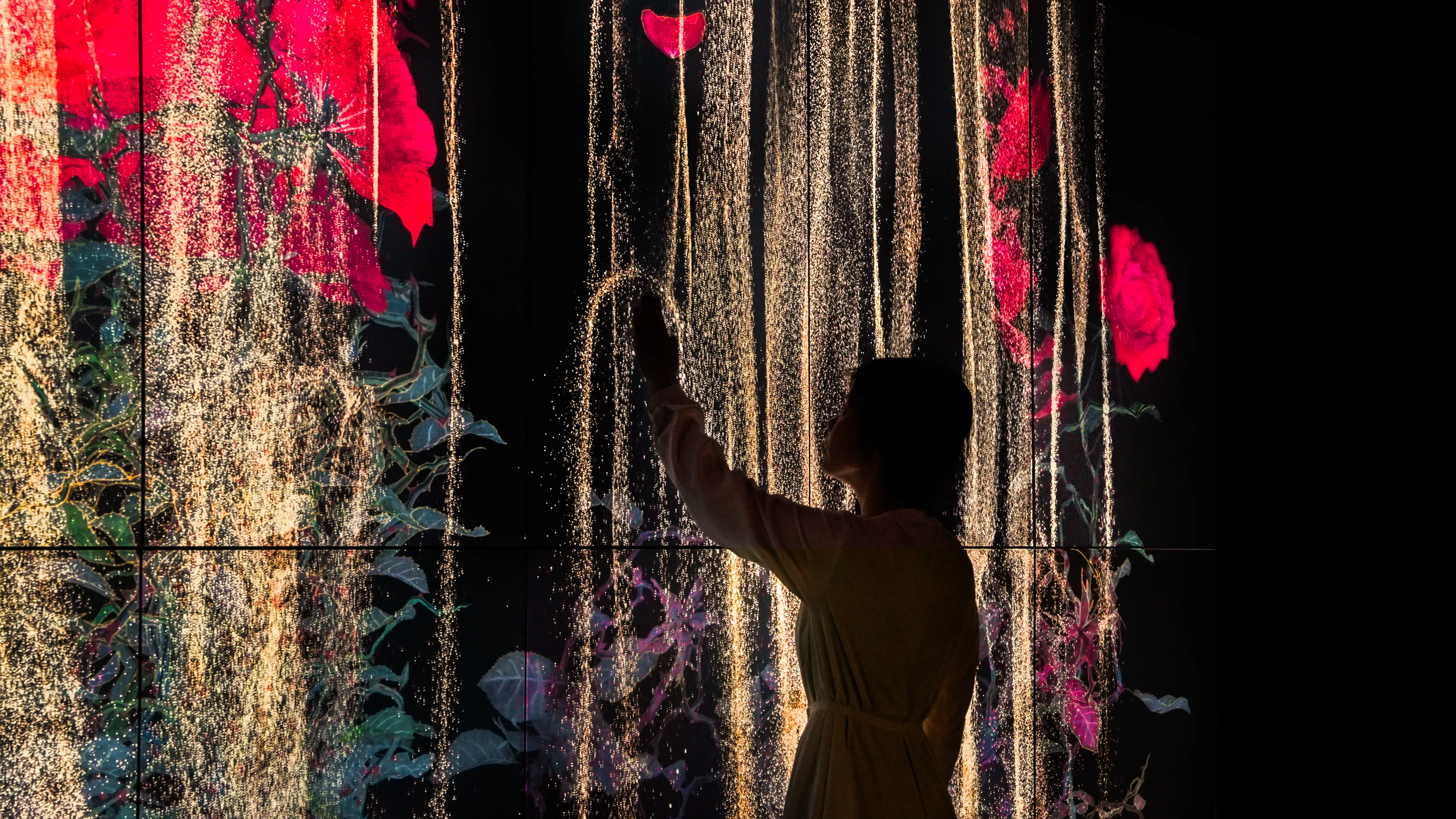 The space of the artwork is created with what teamLab refers to as Ultrasubjective Space. In contrast to spaces that are created through, or in other words cut out by, lenses and perspective, Ultrasubjective Space does not fix the viewer’s viewpoint and in turn frees the body. The wall that the flowers are seen on does not become a boundary between the viewer and the artwork, and the artwork space is continuous with the space of the viewer’s body.
