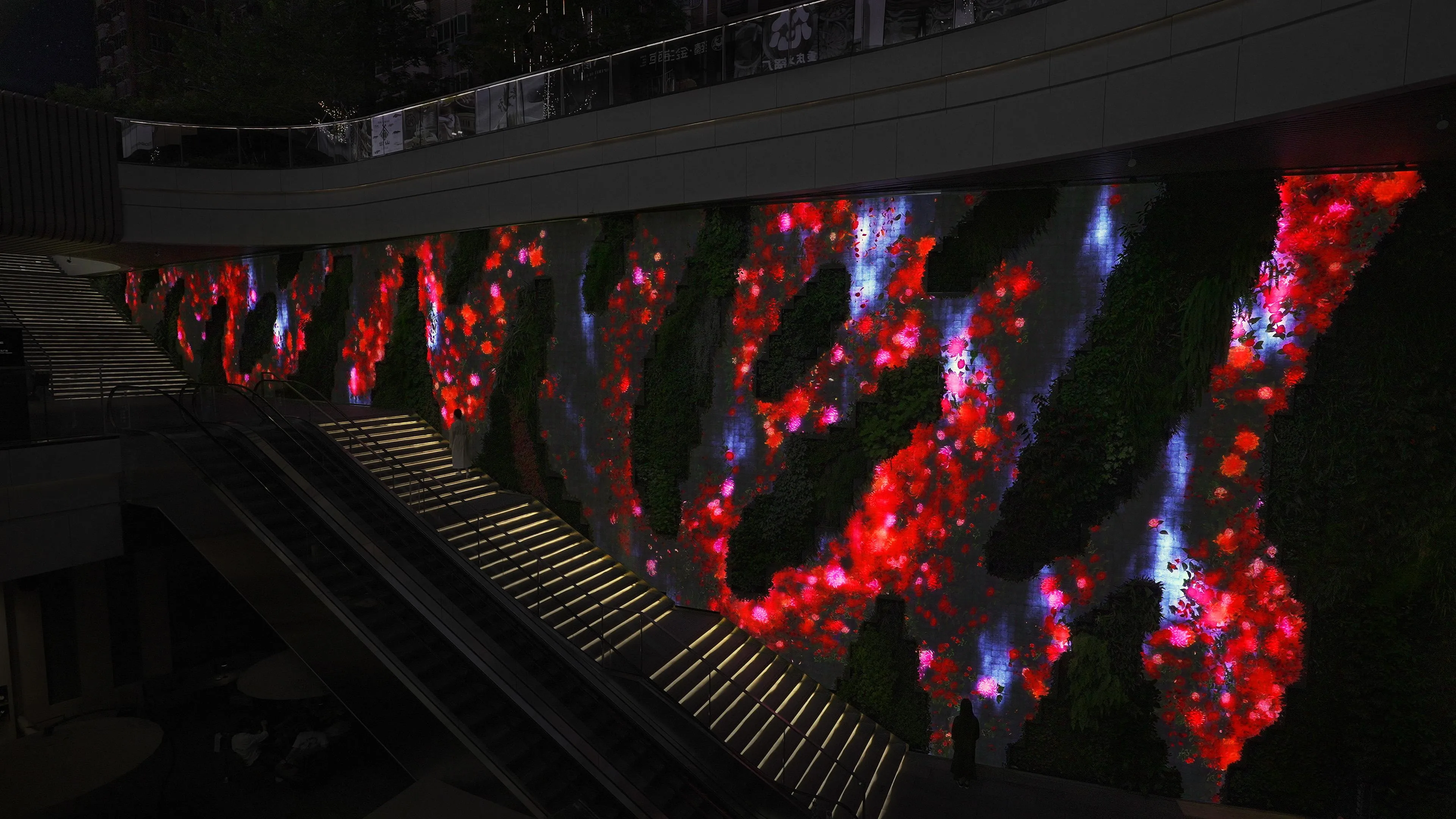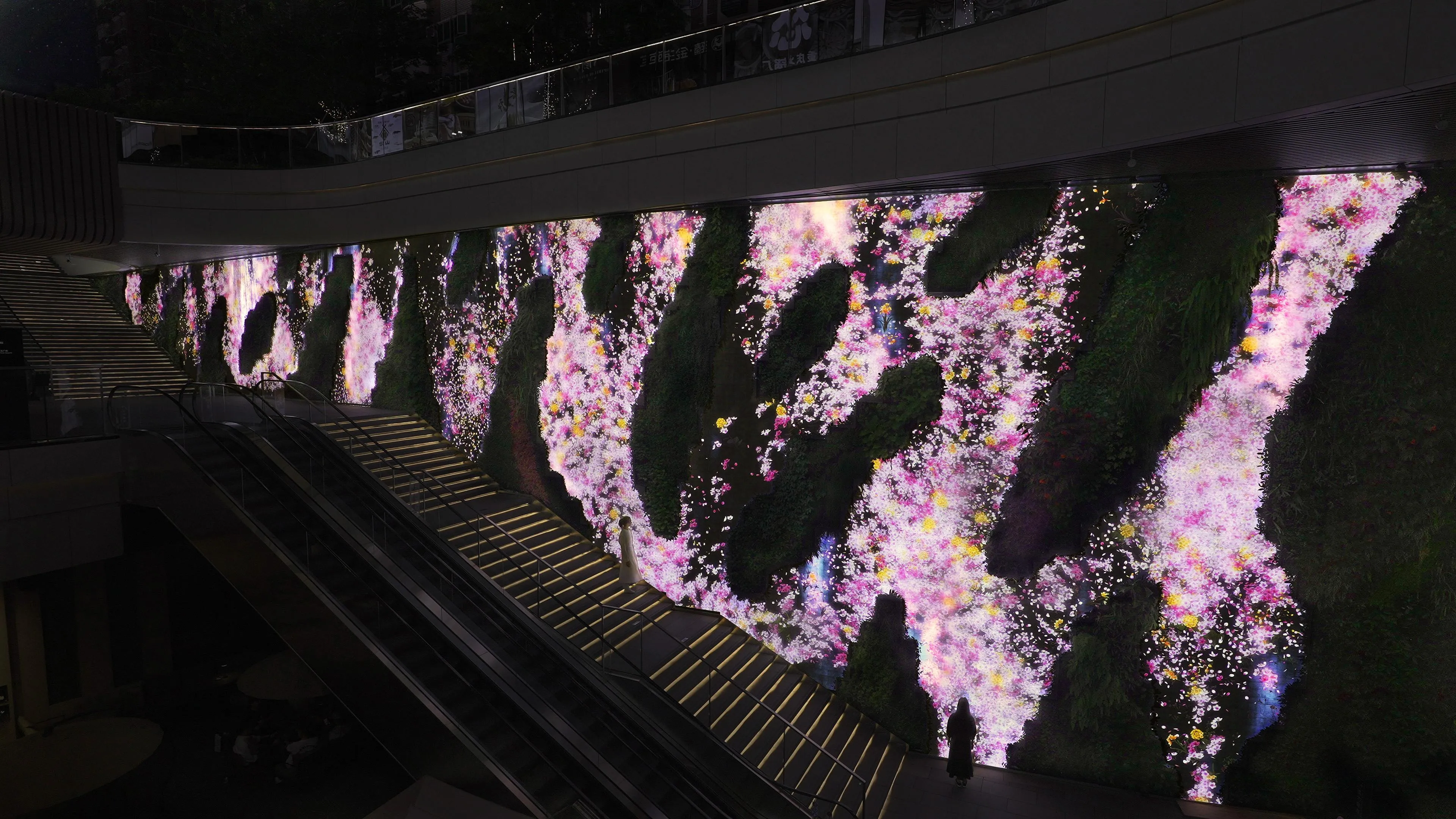 Patrick Blanc + teamLab, 2022, Interactive Digital Installation, LED, Plants, W45700 mm H10600 mm, Sound: Hideaki Takahashi, teamLab