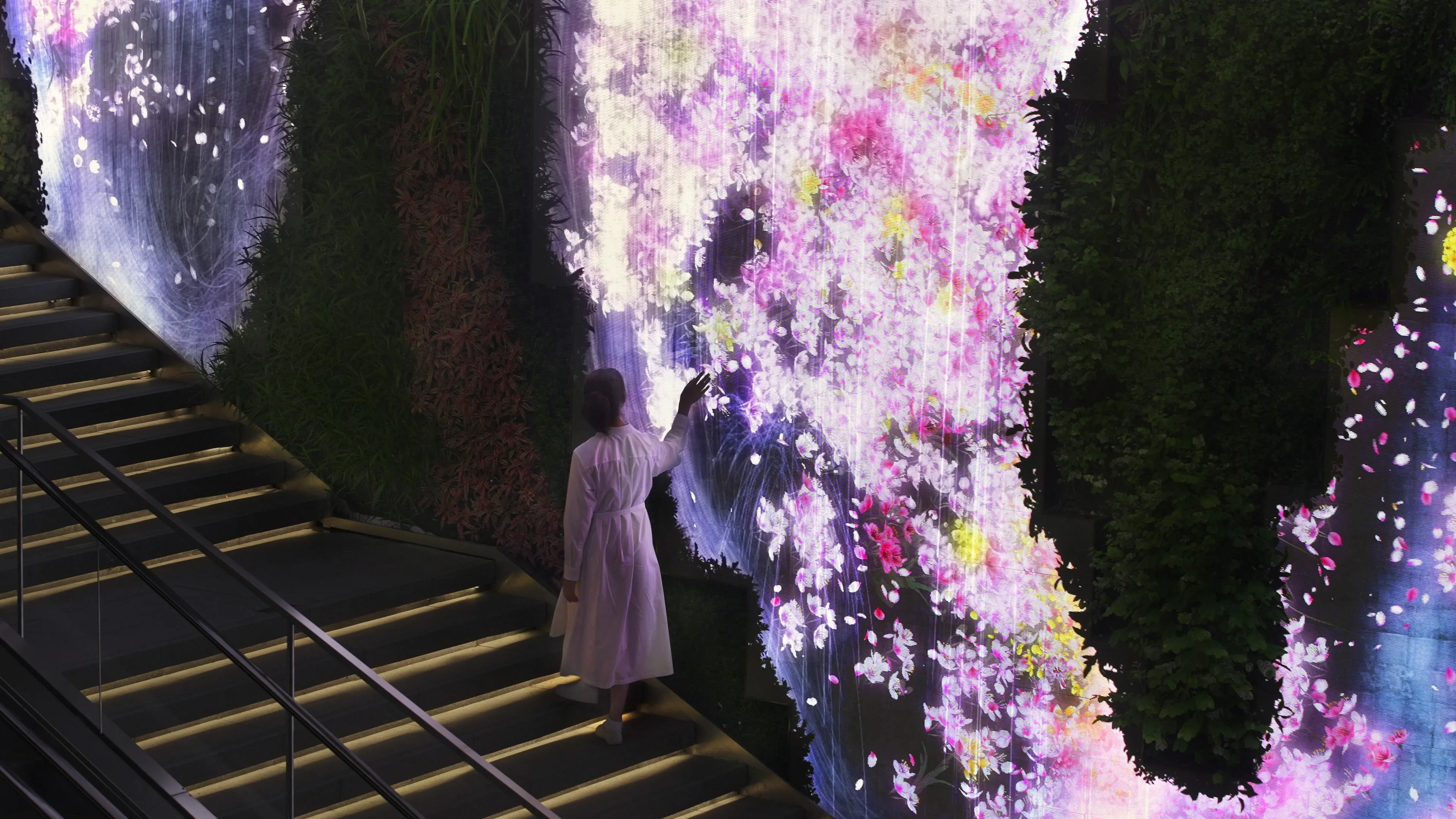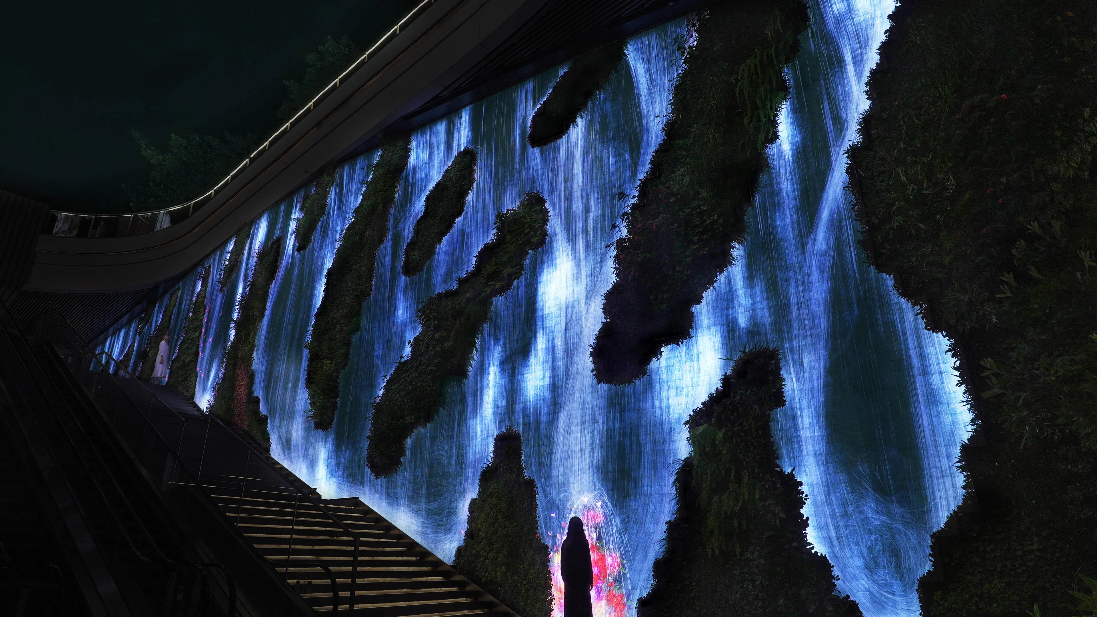 teamLab's waterfall flows and flowers bloom in Patrick Blanc's vertical garden.