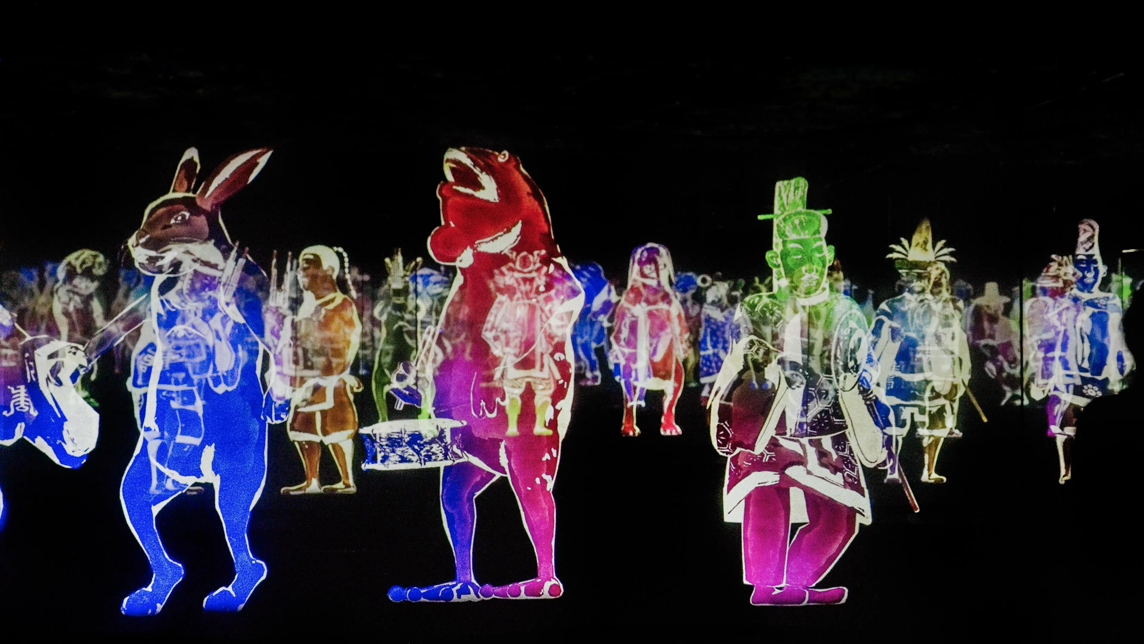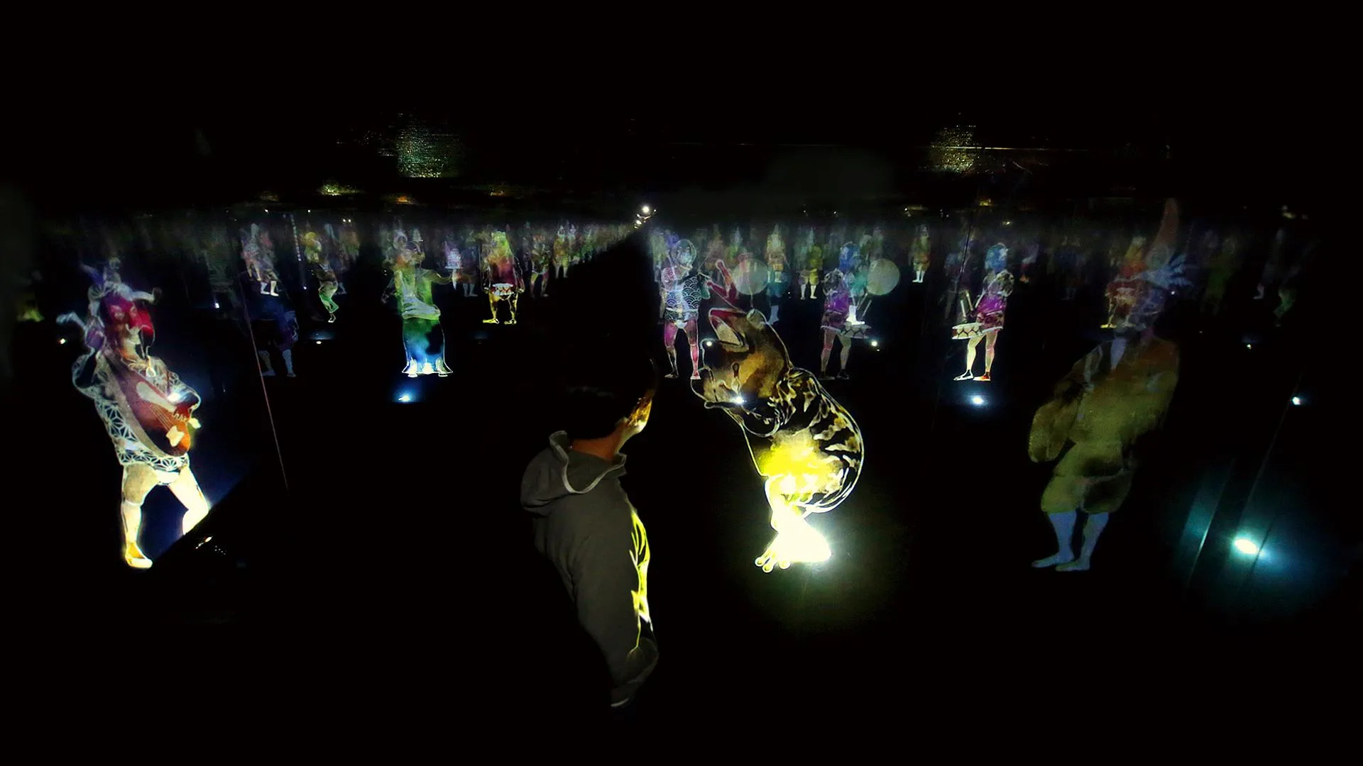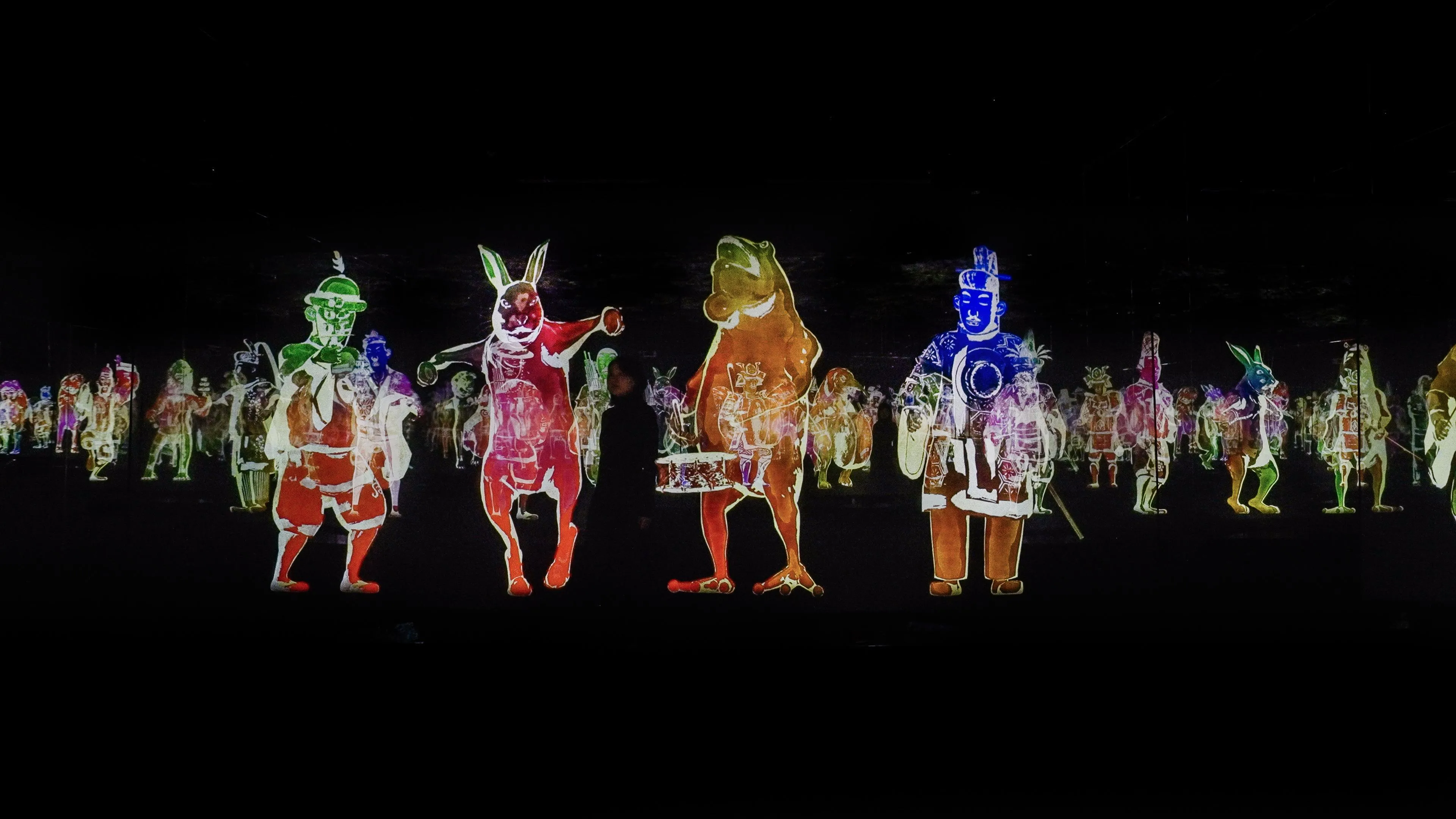 Peace Can Be Realized Even Without Order (2013) is an interactive digital installation composed of holographic numbers. As the self-evident title states, the presentation tells the story of how despite disorder caused by external events, peace is gradually restored with time. Existing independently from the others surrounding it, holographic figures play instruments and dance, affected by the sounds coming from neighboring holograms. When a visitor steps across the threshold of the installation, the holographic figures respond by pausing their performance. As the first figure stills, the signal to ‘cease’ is relayed and spread to each other figure. After the visitor passes through the installation, the holographic figures return to playing music and dancing. It is the visitor’s entrance that causes the disruption of harmony. teamLab stated that “…the speed at which people can connect with other people has accelerated, and the influence of connections to other people has become more important…and perhaps in these unordered connections there is a way to find peace.”