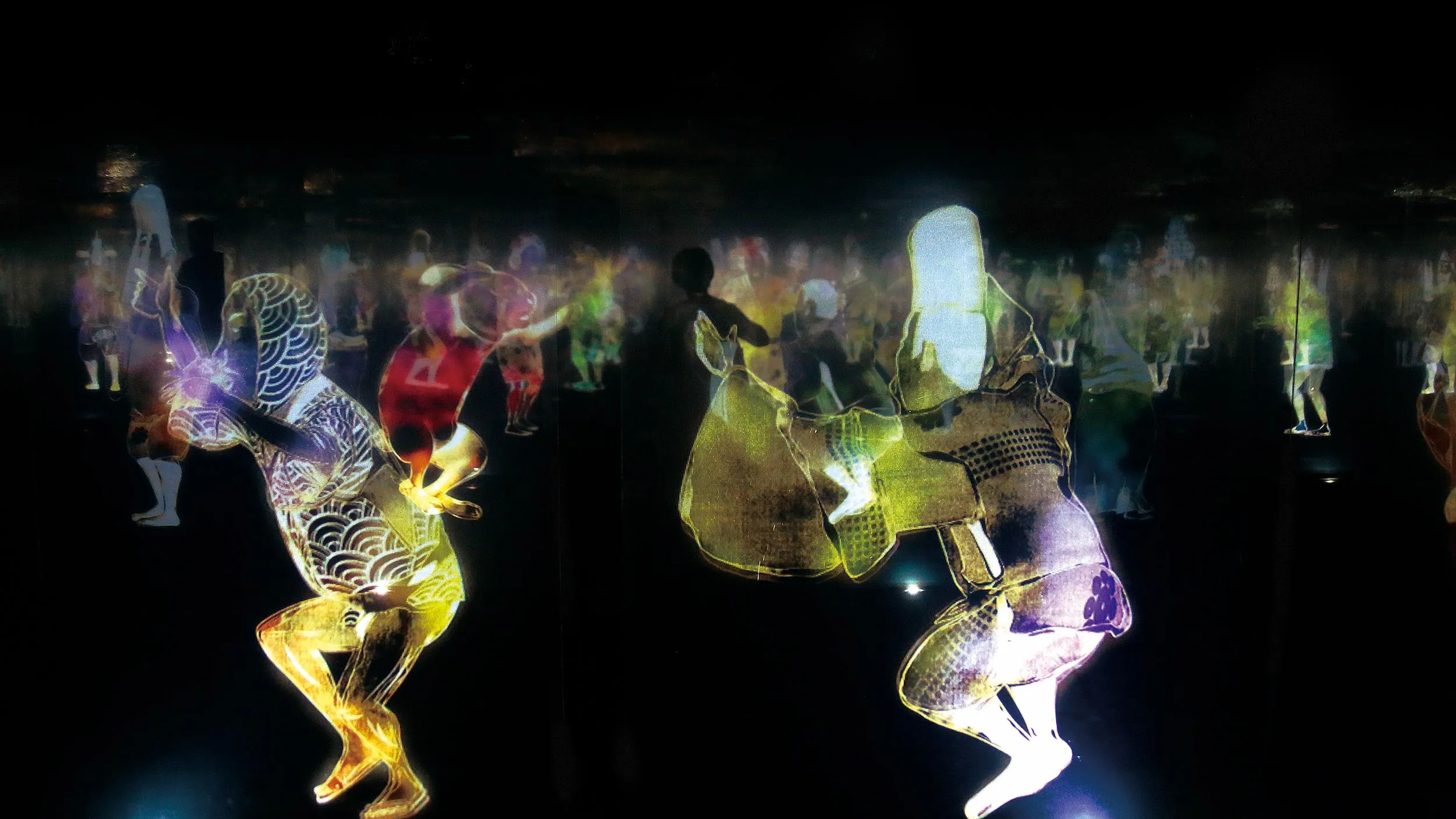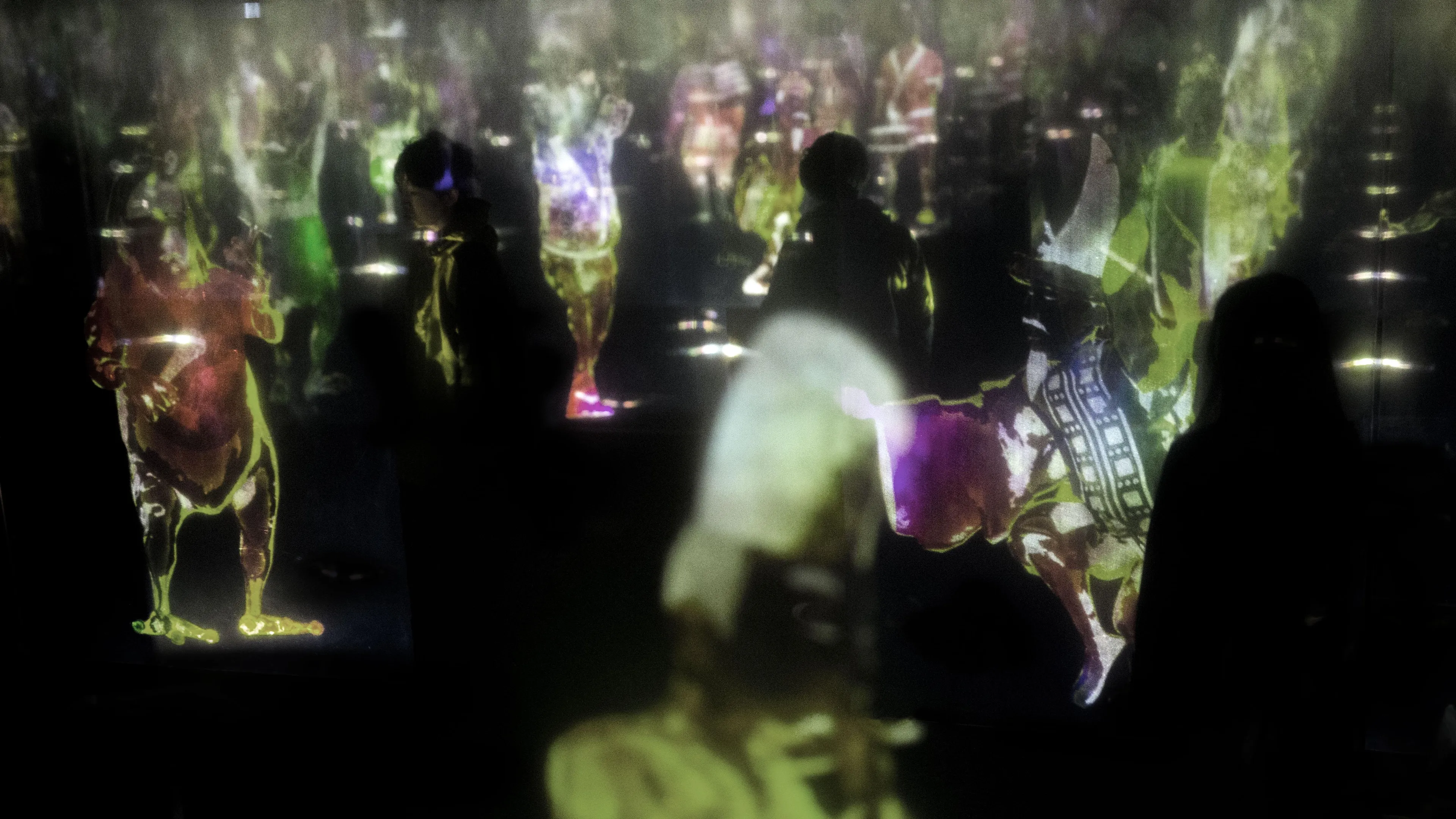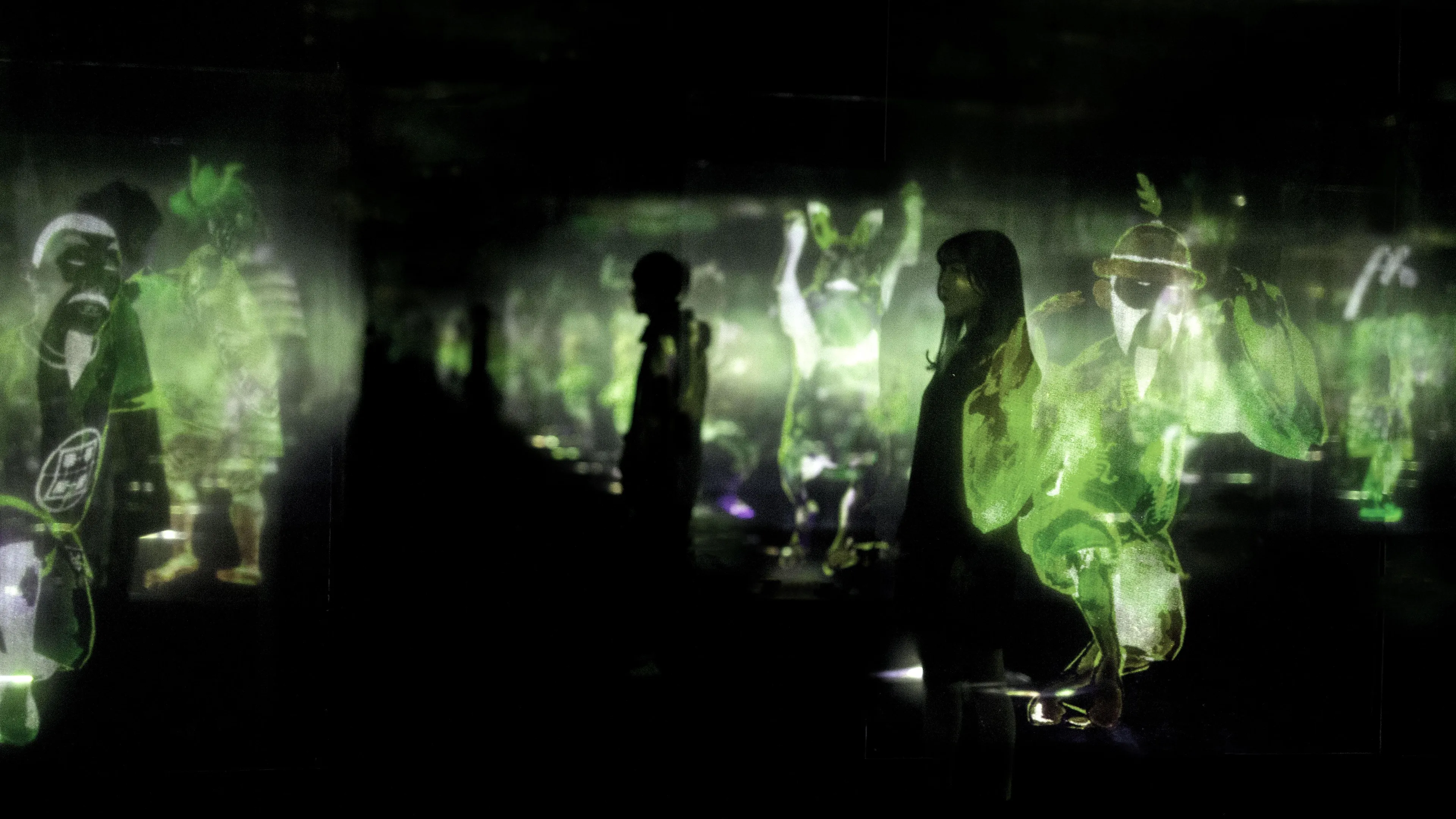 To the viewer, the other people who overlap with the figures exist in the world of the artwork, and when seen by others as overlapping with the figures, the viewer also exists in the space of the artwork.