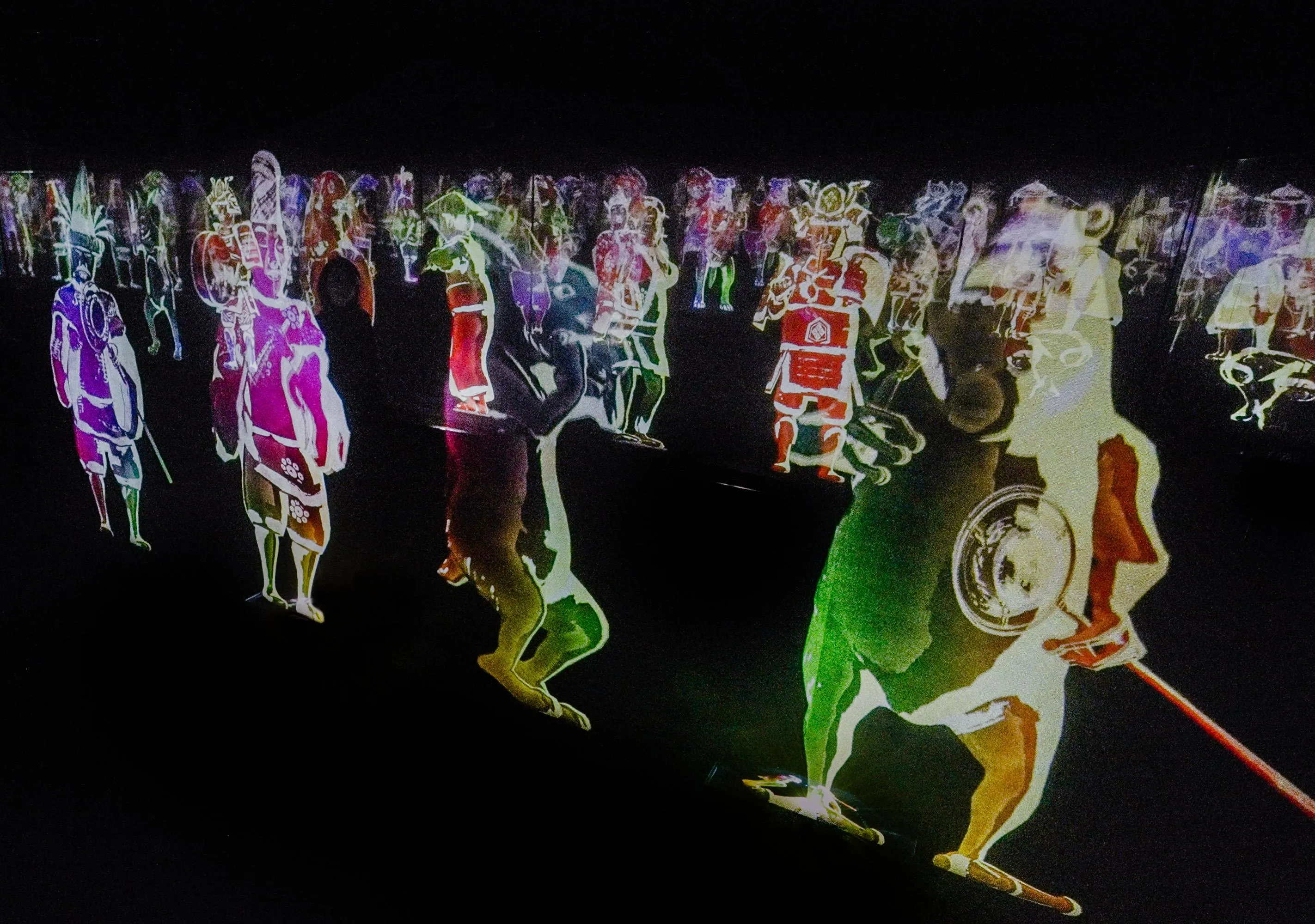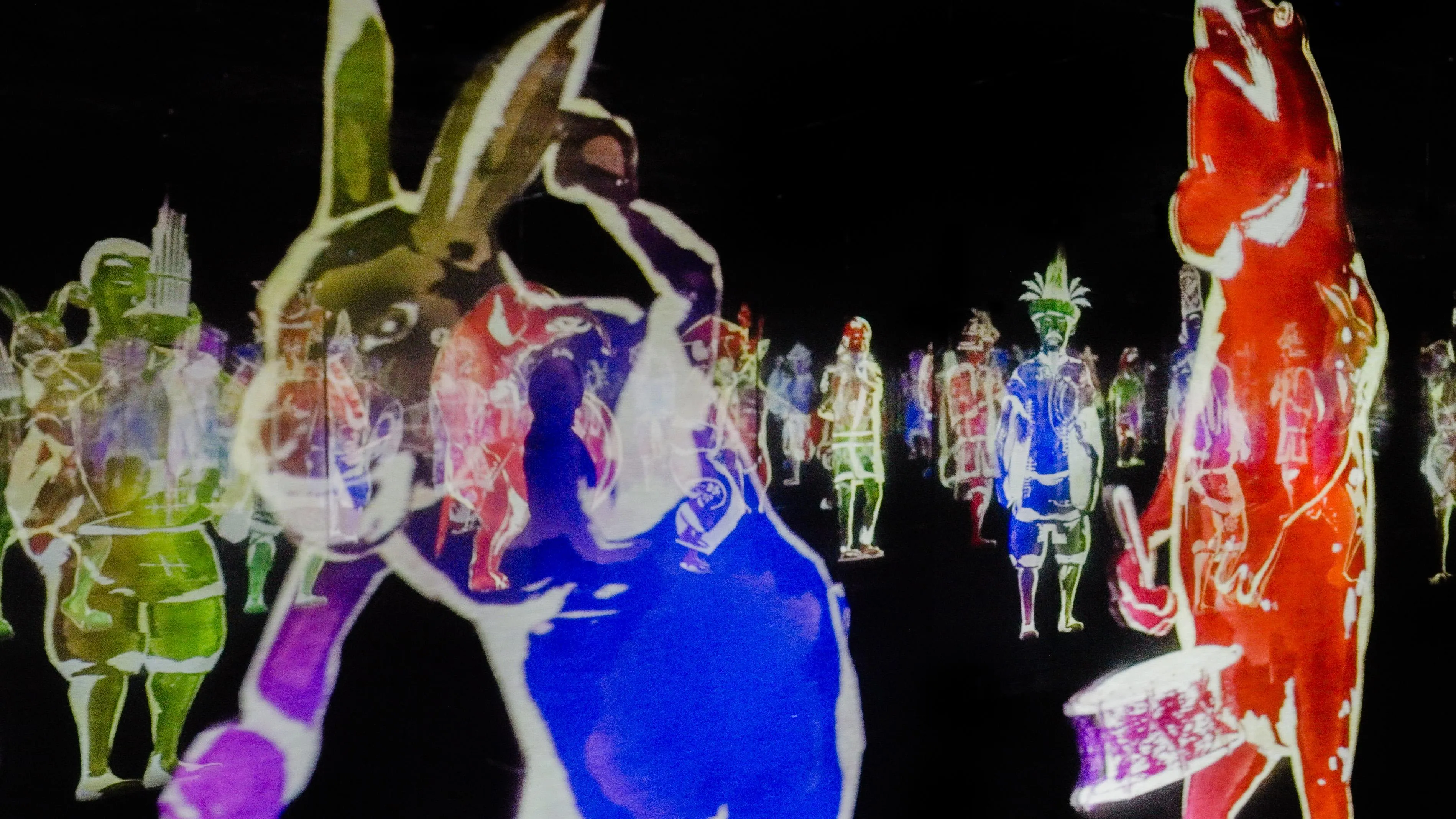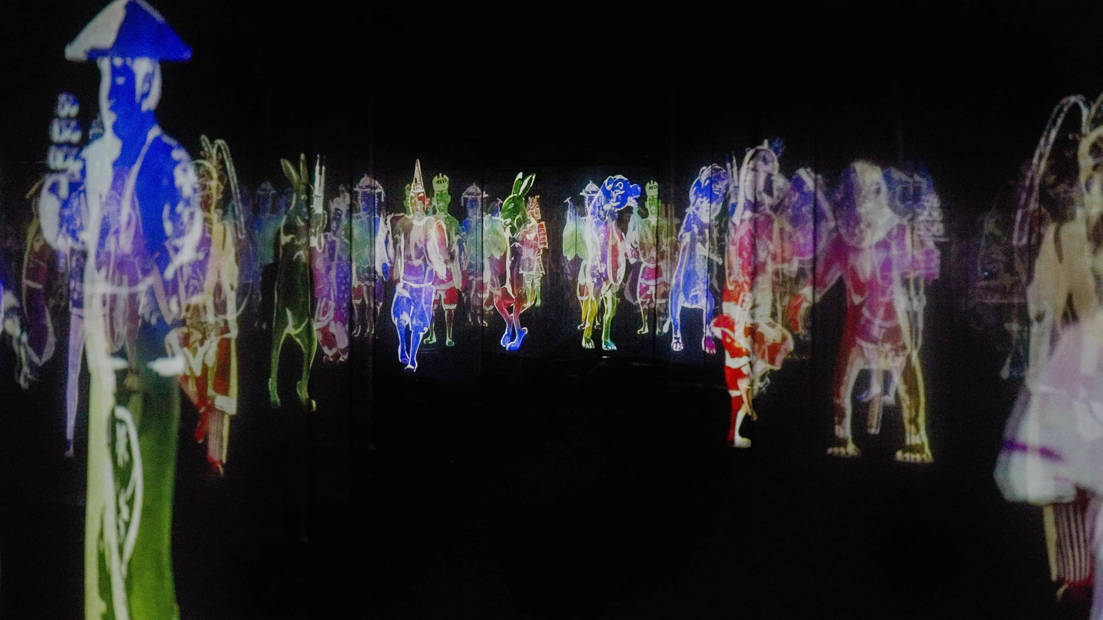 To the viewer, the other people who overlap with the figures exist in the world of the artwork, and when seen by others as overlapping with the figures, the viewer also exists in the space of the artwork.