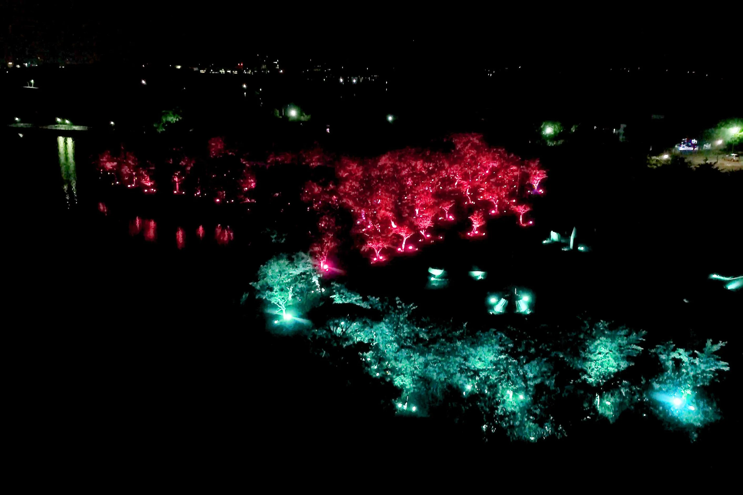 When people pass by or approach the trees and sculpture, the color of the light changes and the new color resonates out. The light of that tree or sculpture then radiates out and is transmitted to nearby trees. The resonating light of the trees or sculpture will again be passed on, and the color will continue to resonate to the nearby trees and sculpture.