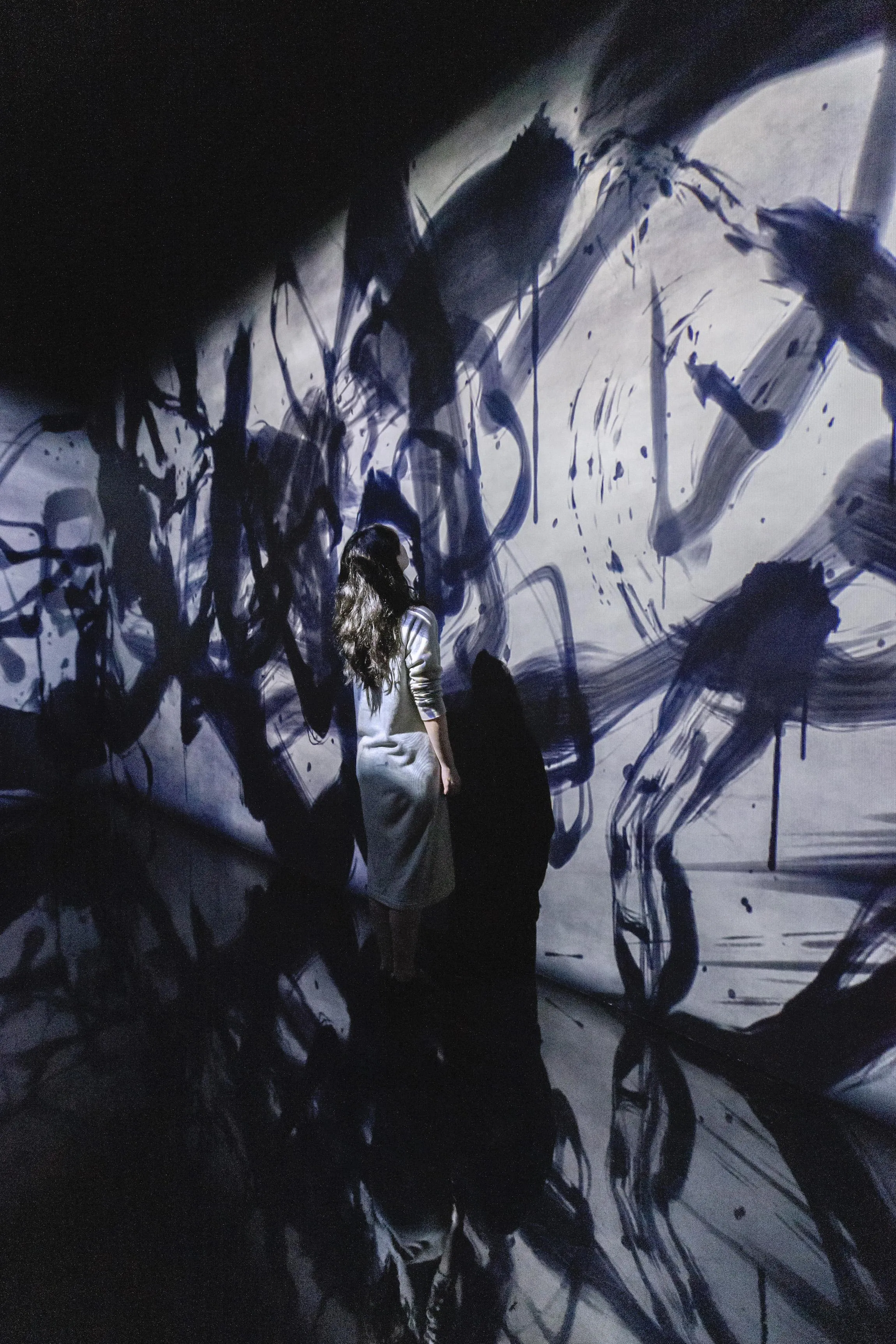 Spatial Calligraphy is a form of calligraphy drawn in space that teamLab has been exploring since it was founded. The artwork reconstructs calligraphy in three-dimensional space to express the depth, speed, and power of the brush stroke, and that calligraphy is then flattened using the logical structure of space that teamLab calls Ultrasubjective Space. The calligraphy shifts between two and three dimensions.