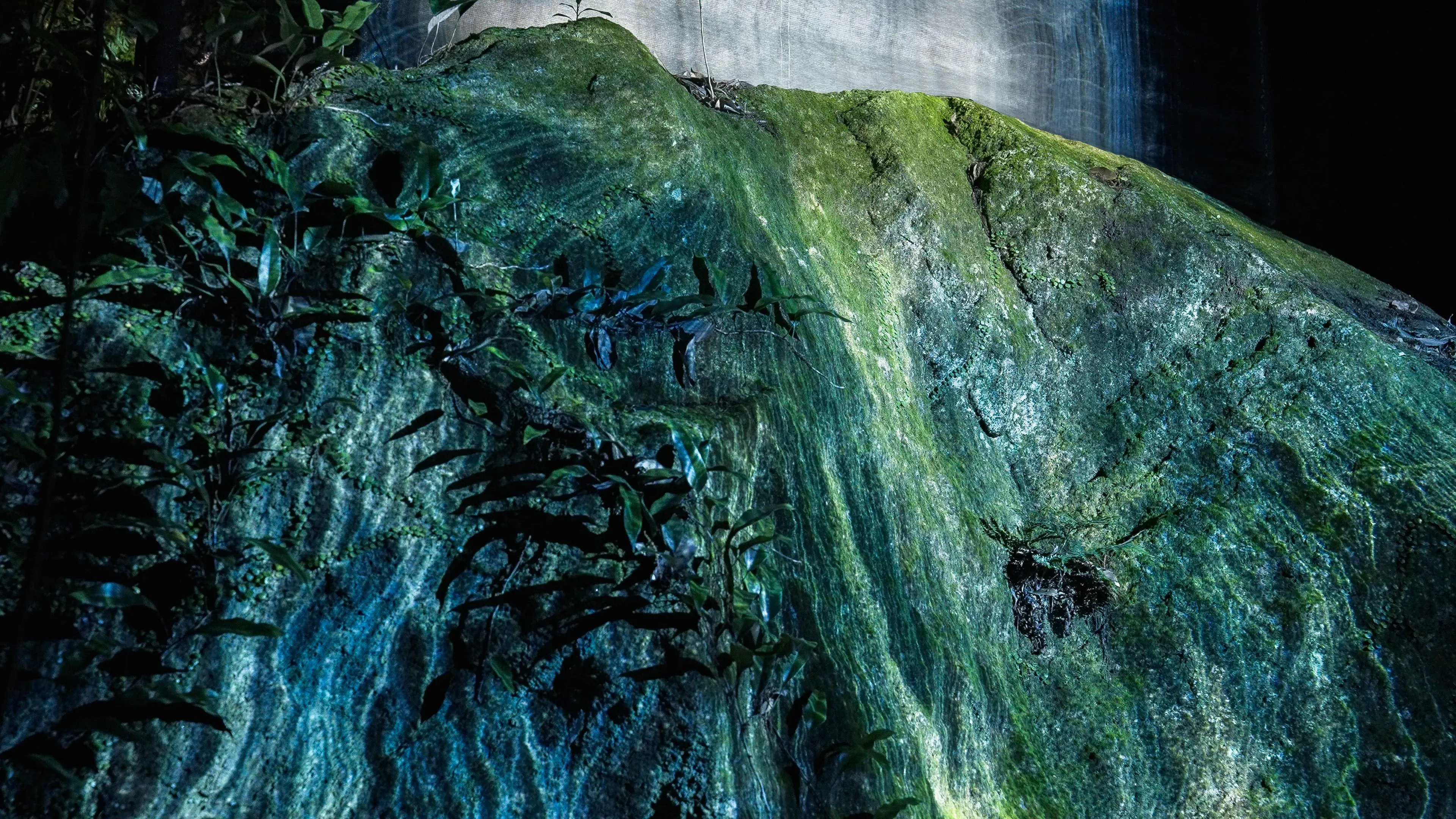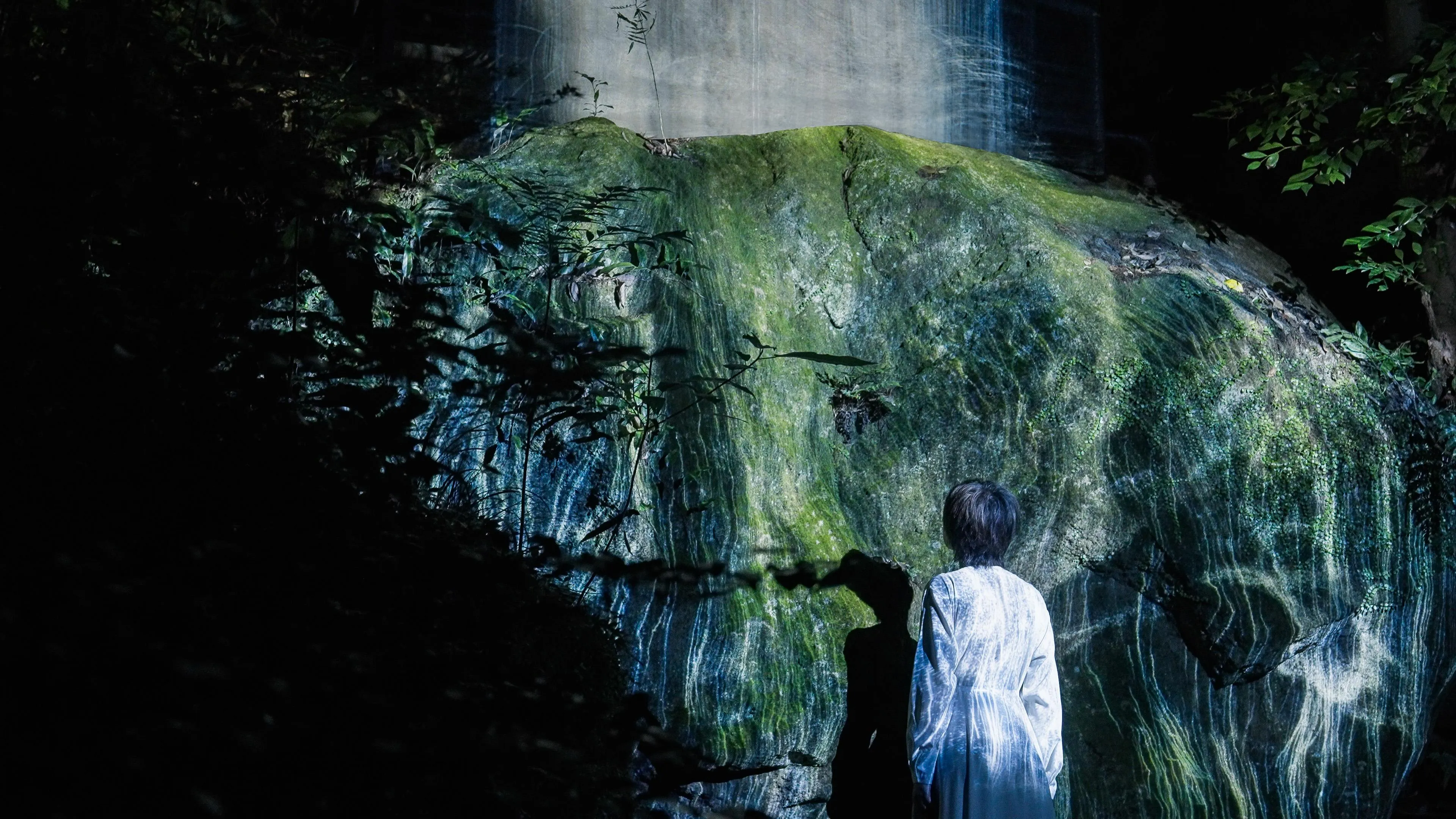 This artwork uses an actual giant rock. The giant rock (3m in height, 4.5m in width) was reproduced in a virtual three-dimensional space, water was simulated to fall onto it, and the simulated movement of that water on the form of the giant rock draws the waterfall.