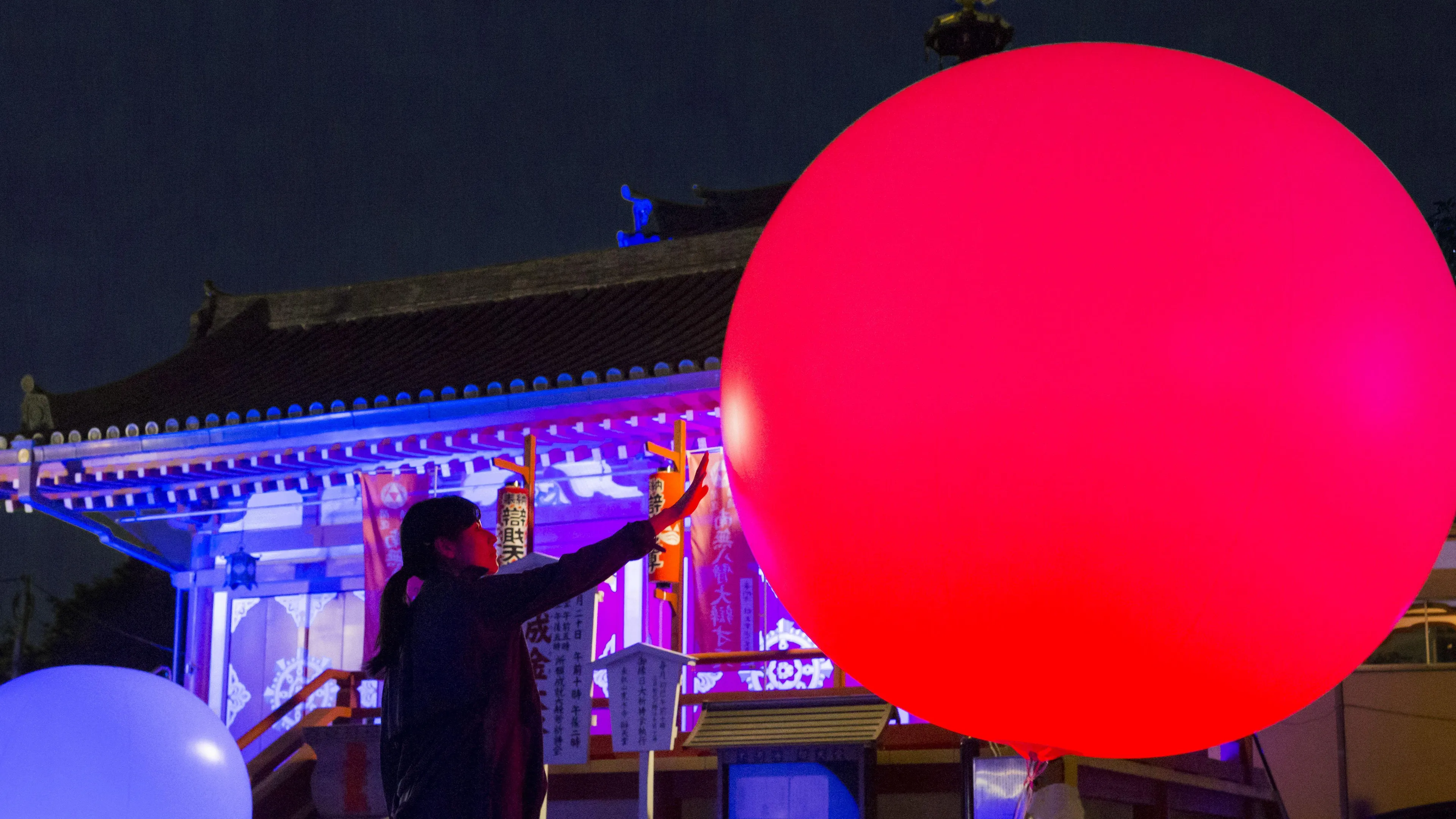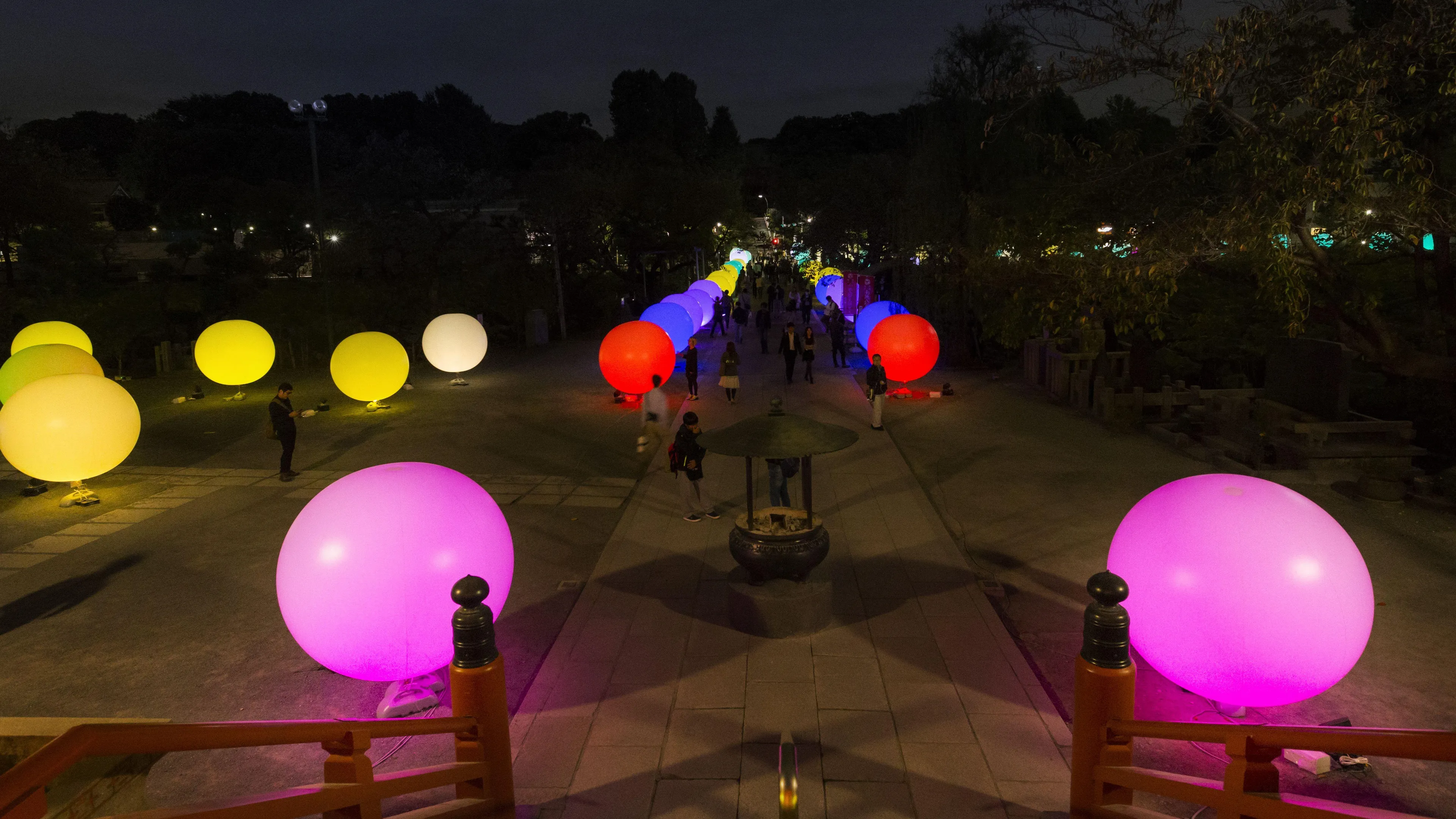 When the spheres of light are touched by a person or receive an impact, the color of their light changes, and they emit a musical tone unique to their new color. The color and tone then resonates out to the spheres around them, and the lights of Shinobazu Benten-do temple  change in concert to emit the same color and tone.
