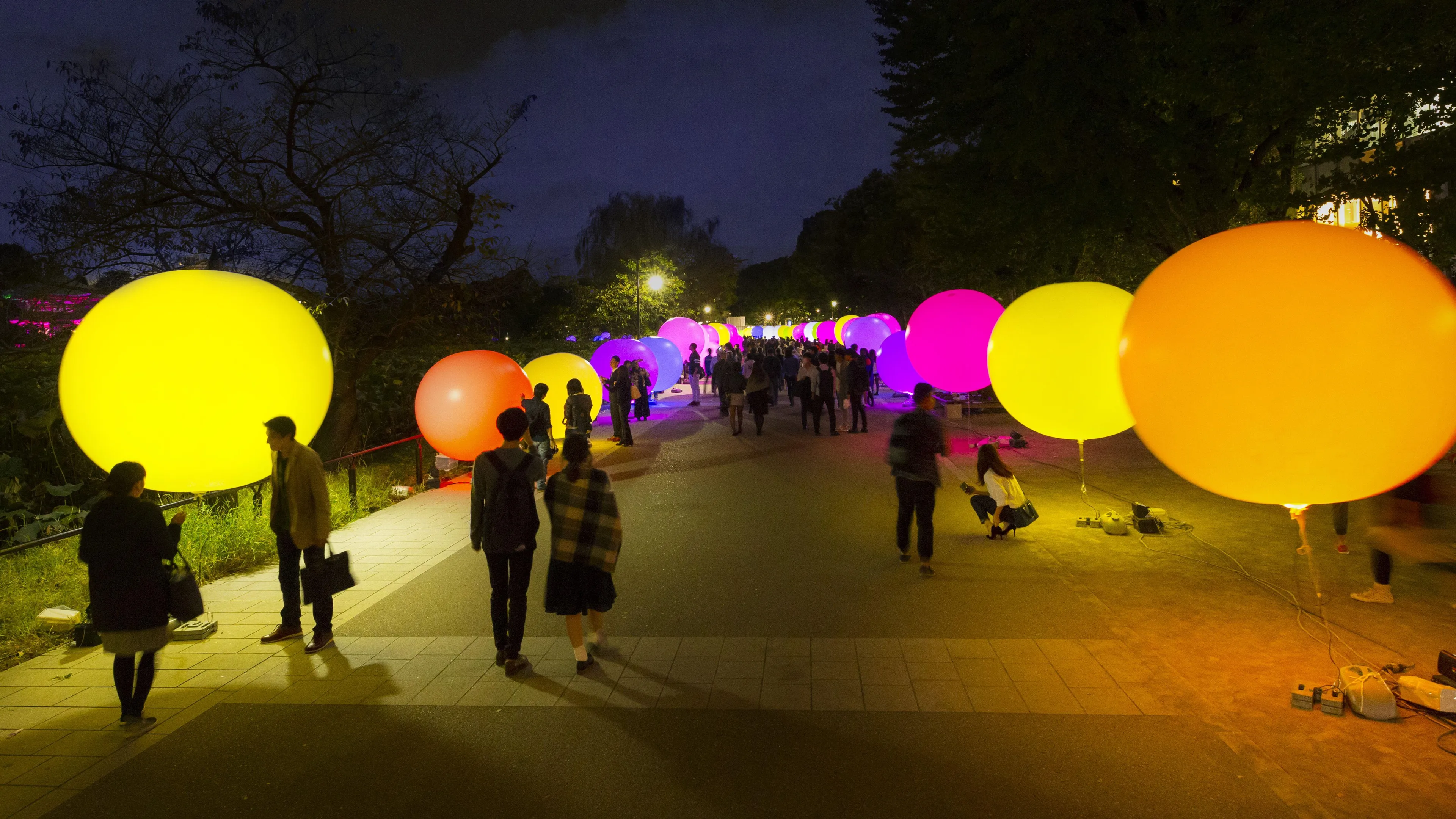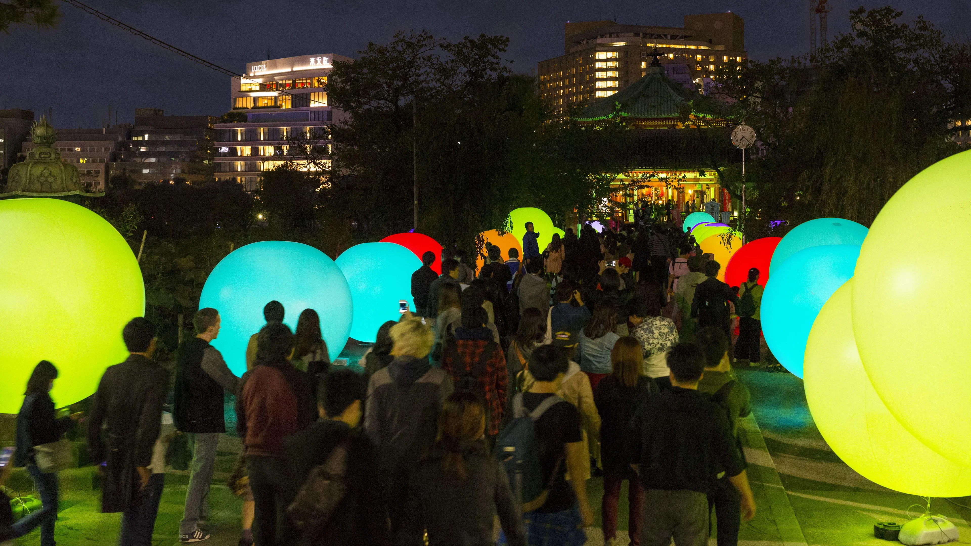 Spheres of light float along the tree lined path joining Ueno Park to Kiyomizu-do temple. They move on their own, shining brightly, then disappearing—as if they are softly breathing.