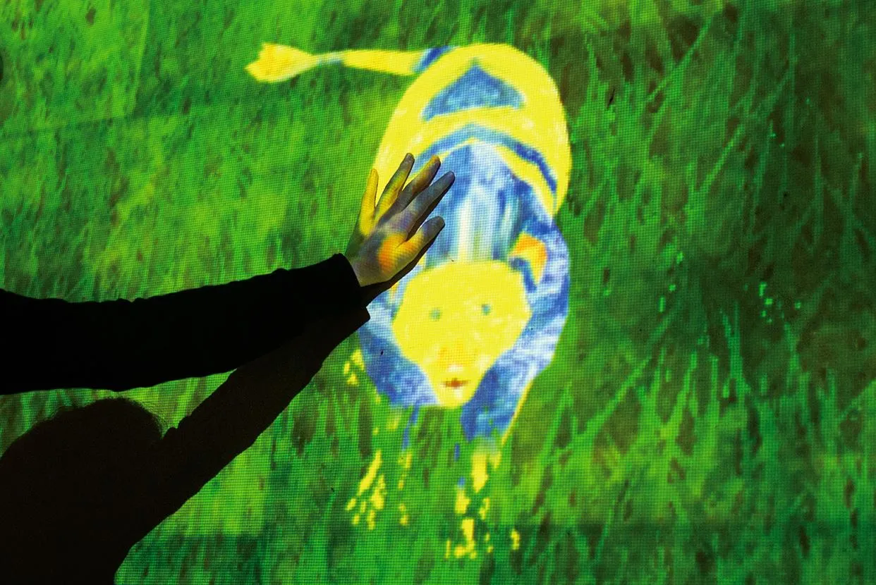 Color images of people or animals and see them move on a large screen in front of you. Gradually, the people begin to form relationships with one another. If you touch the people or animals they become surprised and respond with a variety of actions.