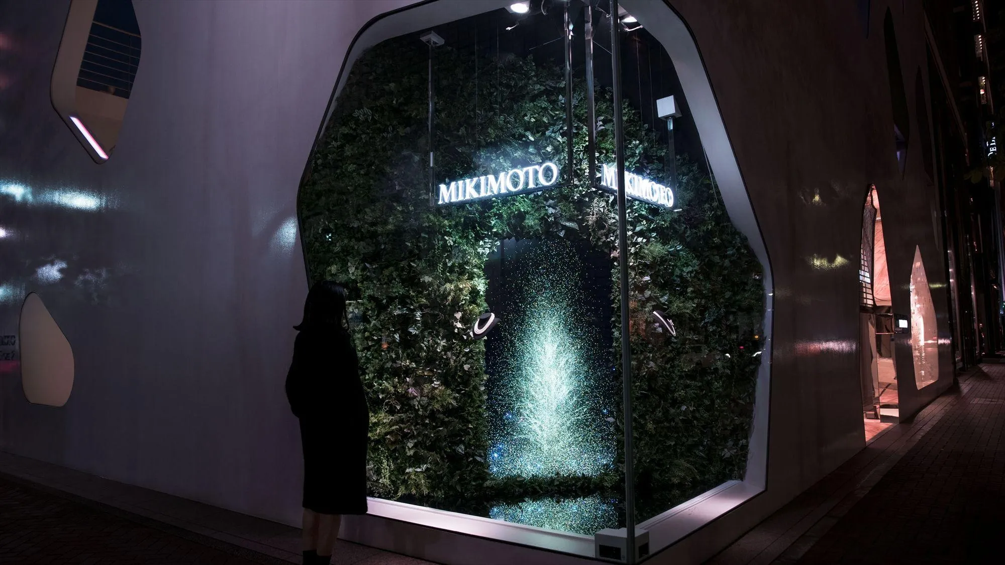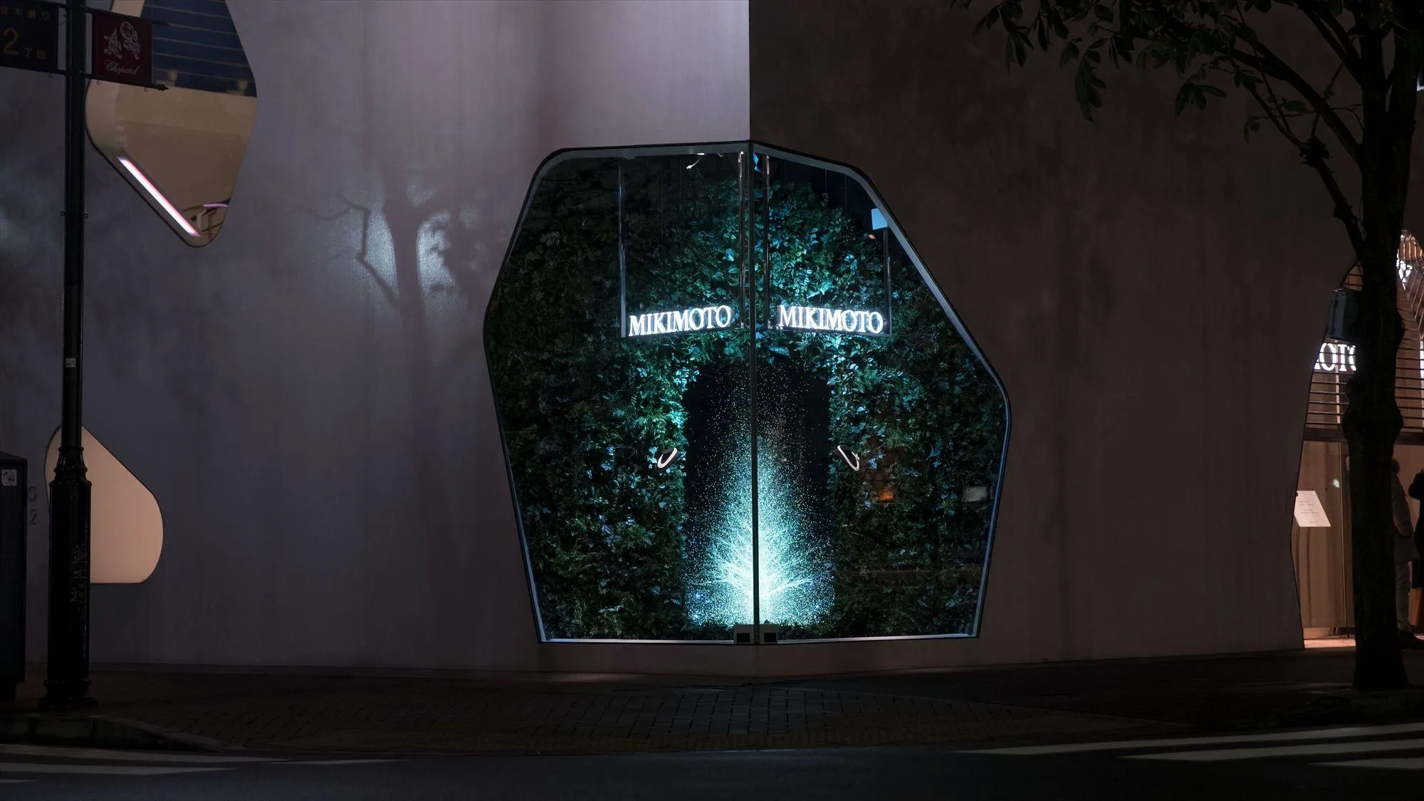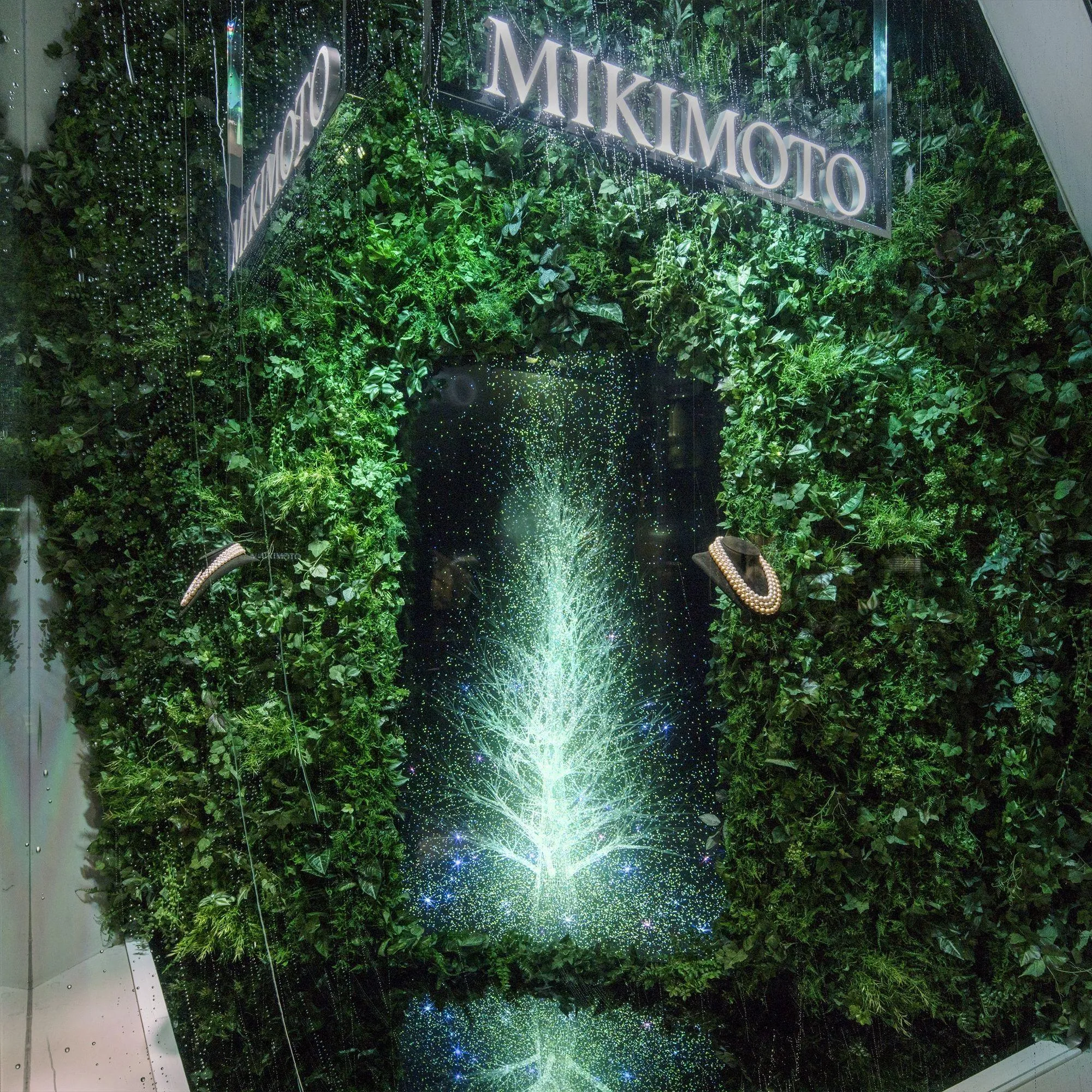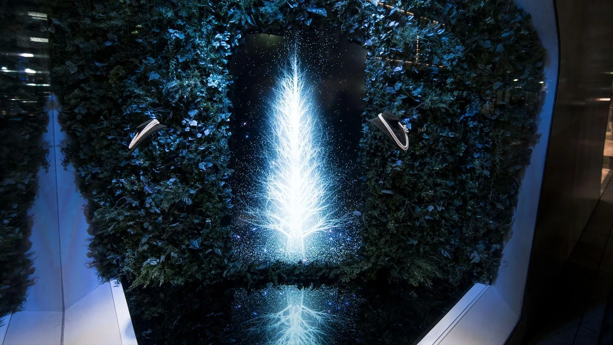 チームラボが描く“光の珠の散らばる木”。ミキモト銀座2丁目本店のショーウィンドウ