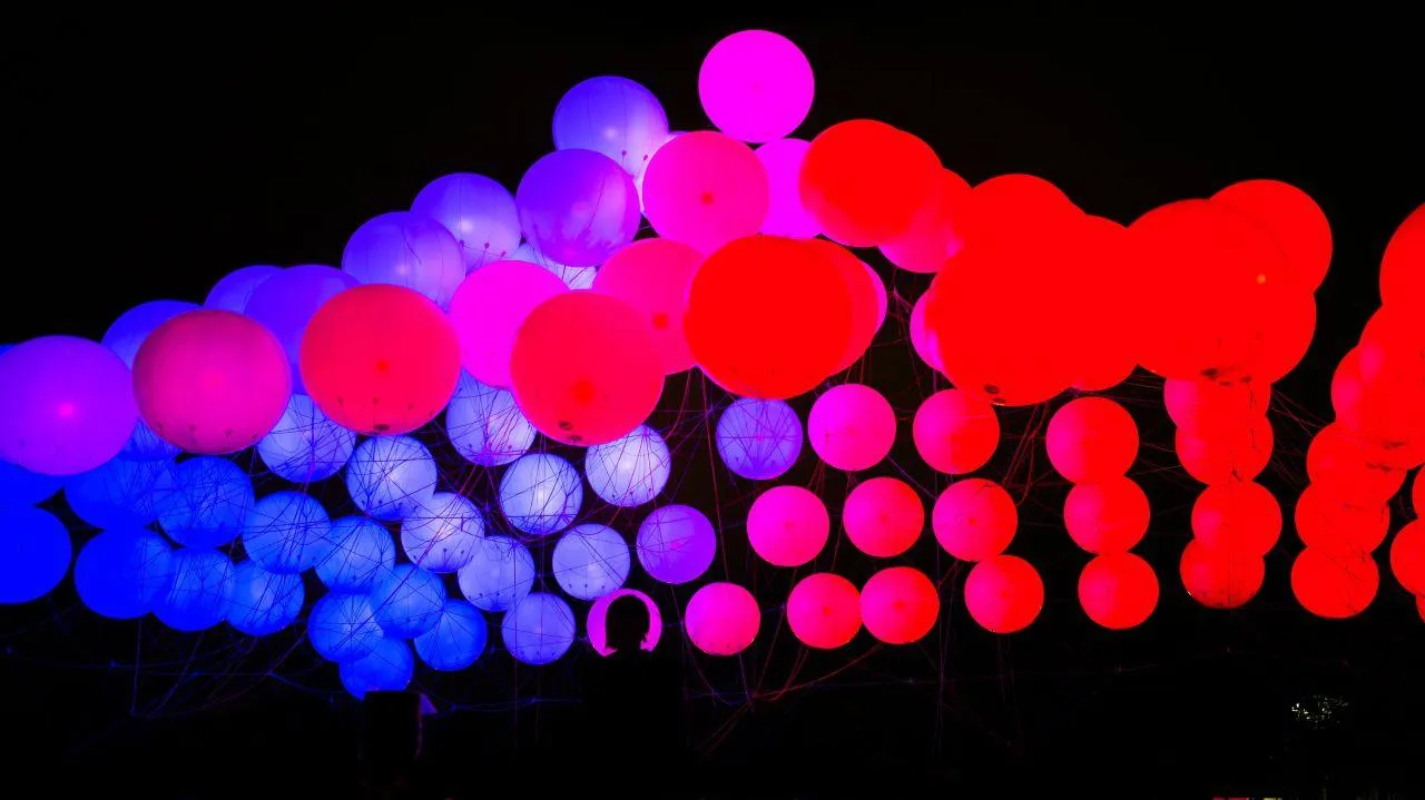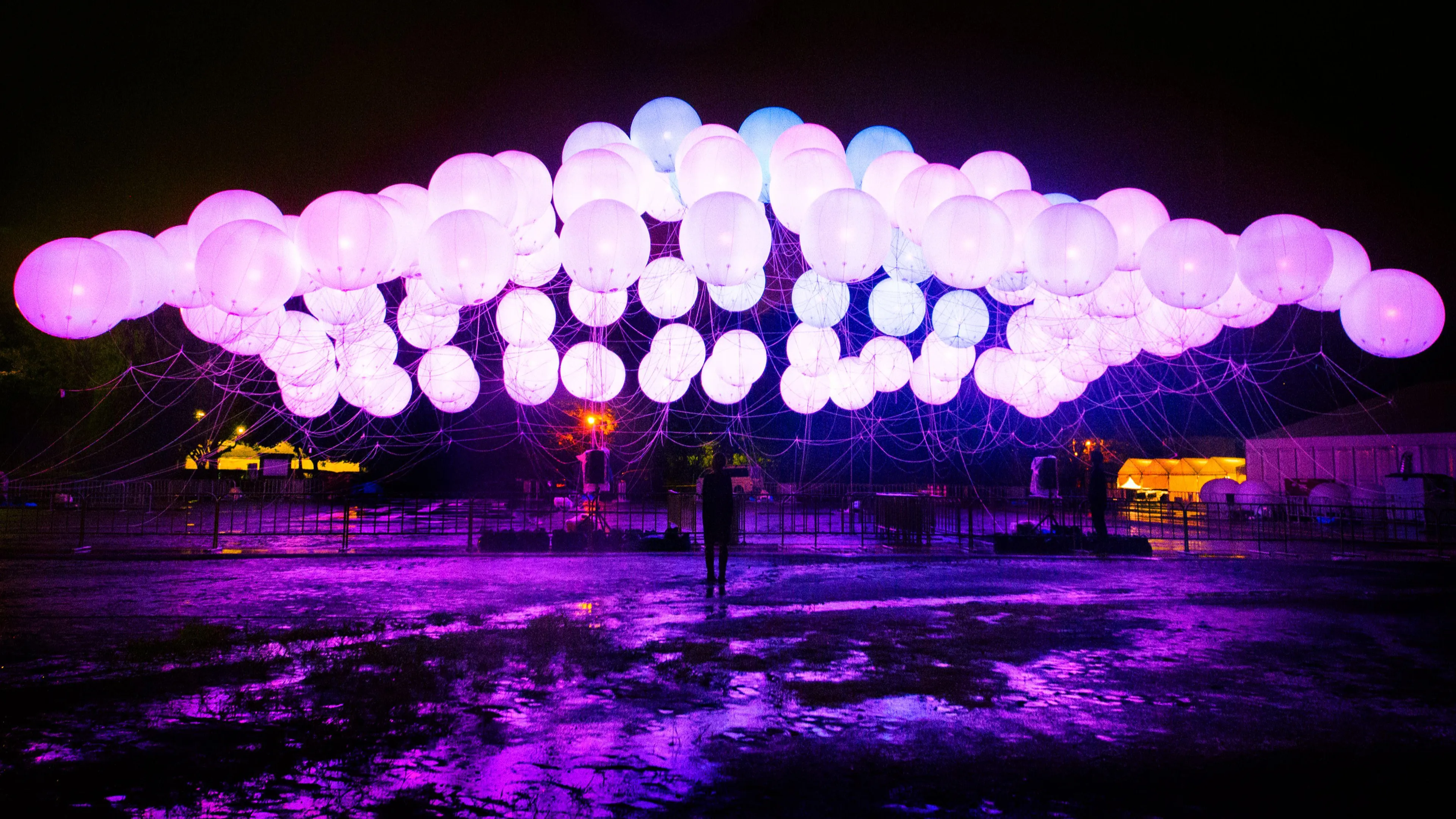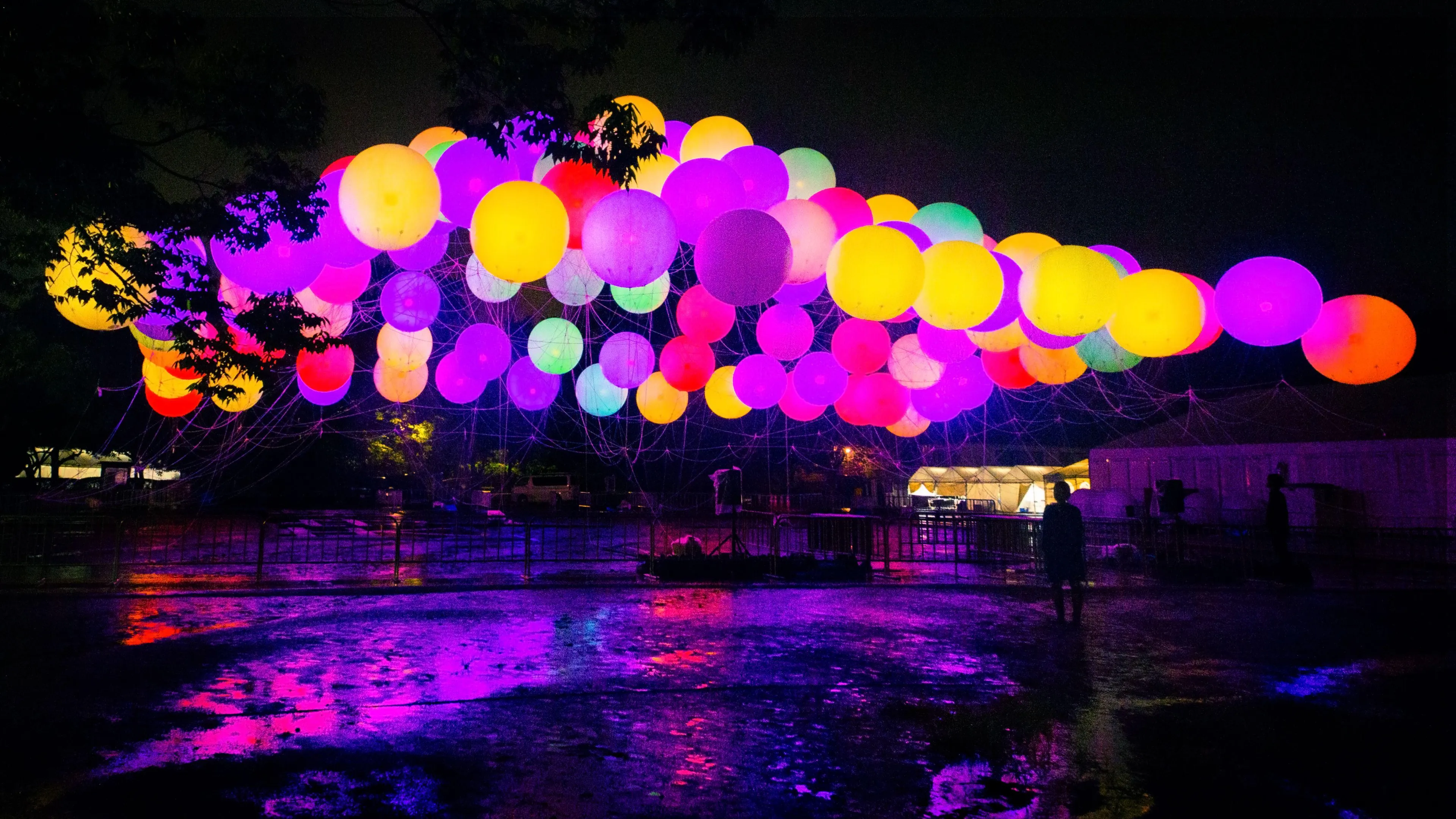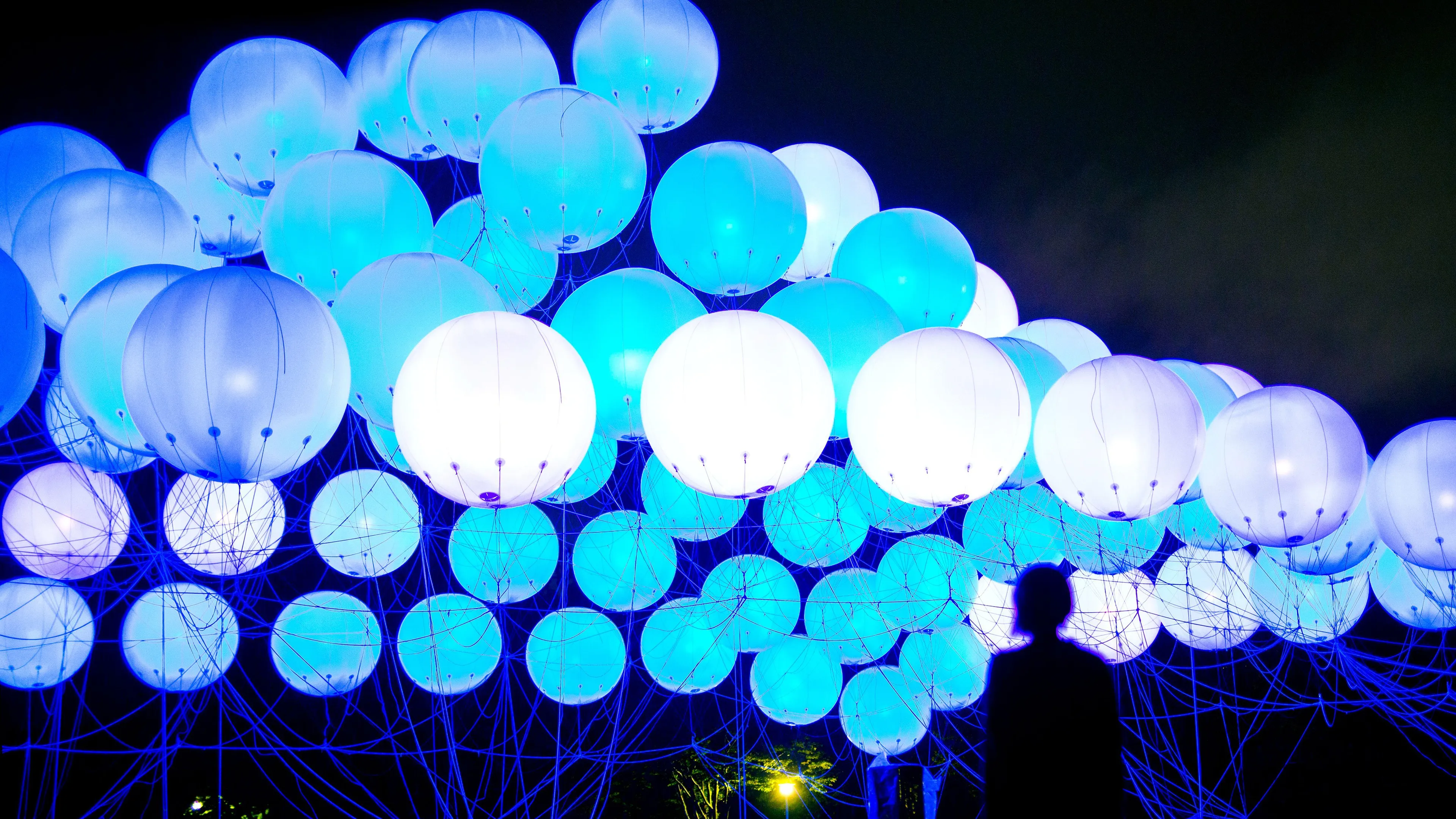 A gridded network of 108 white balloons, or “globes,” floats in mid-air, creating a pyramid shape that resembles the roof of a house. The floating spheres change color when touched and emit a sound “unique to that color,” according to teamLab’s description. The surrounding balloons then echo the same sound and color in a rippling effect that alters the entire color of the piece.