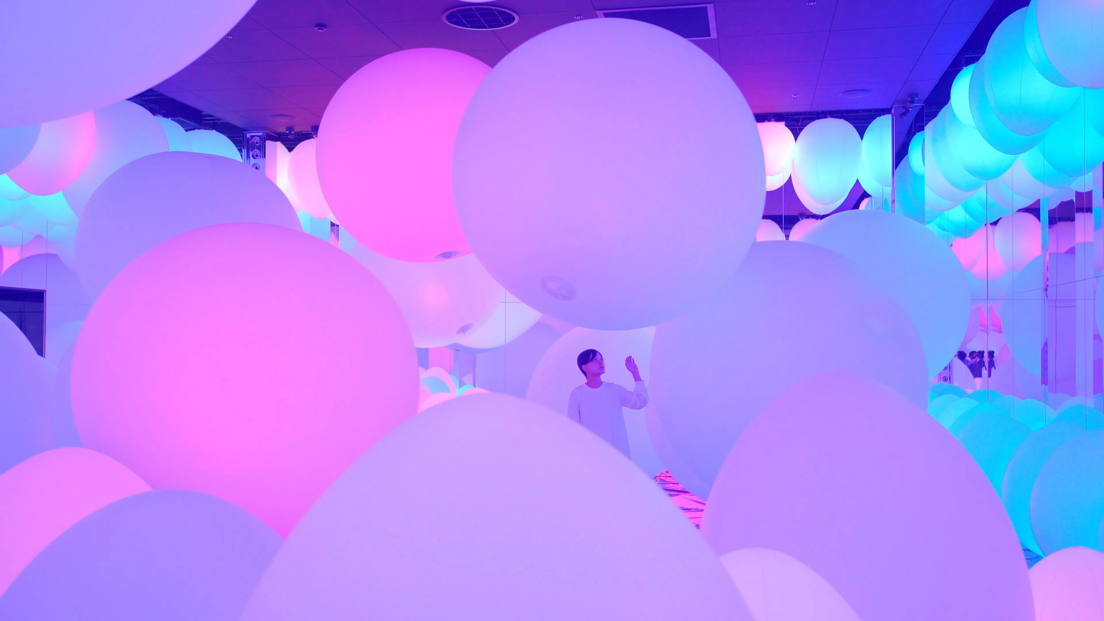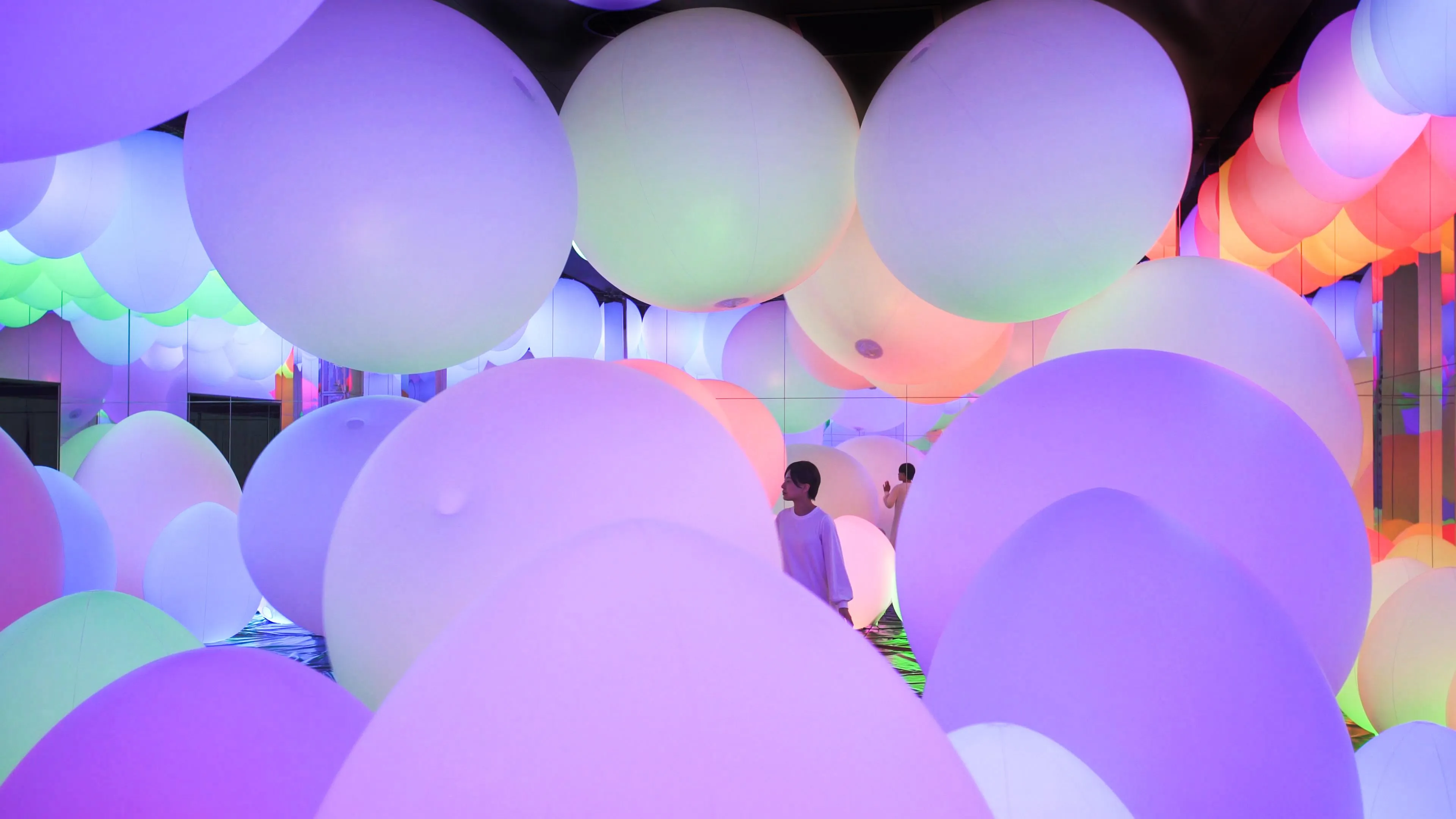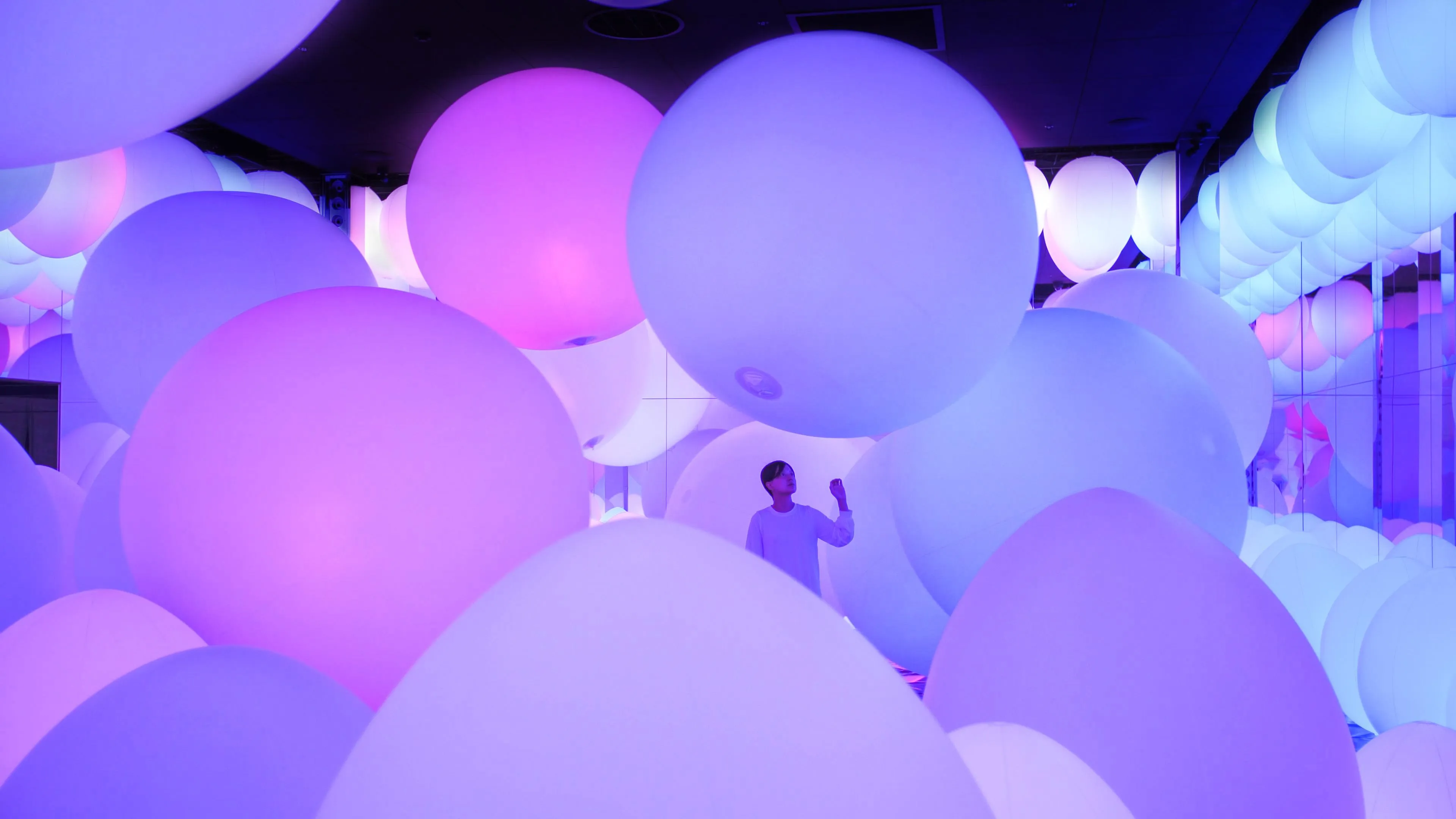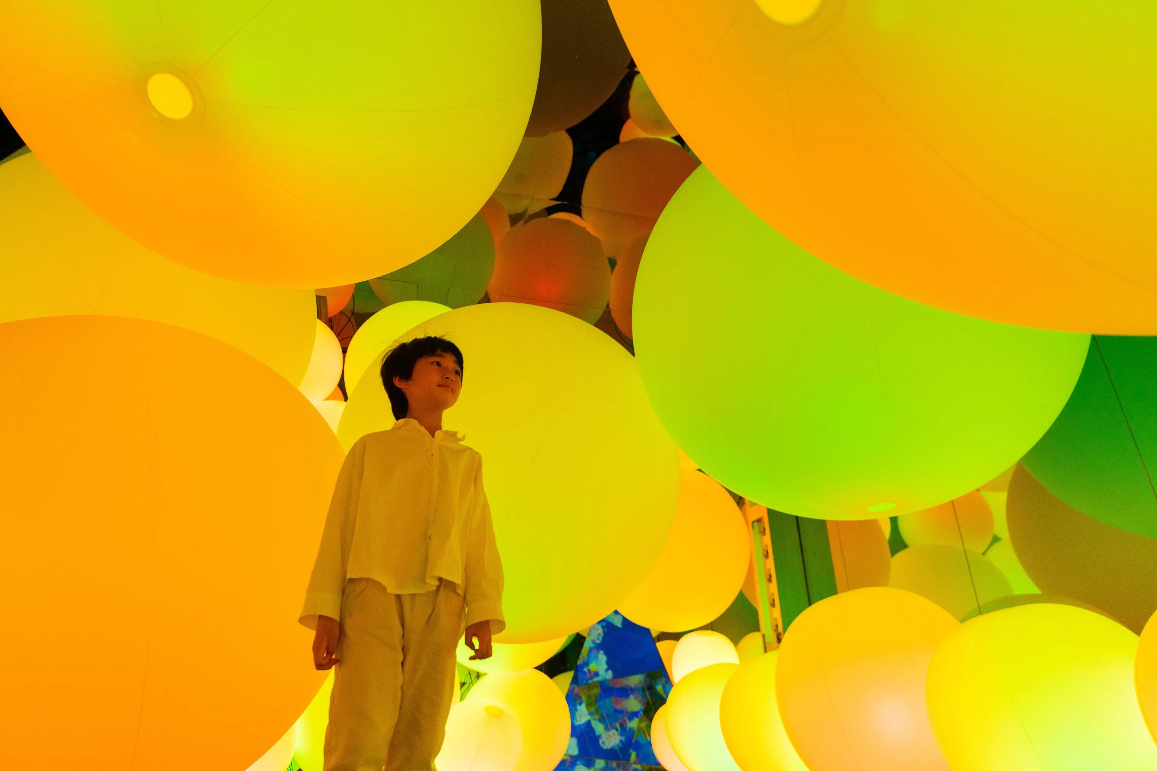 Typhoon light balls float between the floor and the ceiling within the confines of the space, as though transcending the concept of mass. When a person touches a typhoon light ball, its color changes, and it emits a sound tone unique to that color. One after another, the surrounding balls successively change to the same color and emit the same tone.