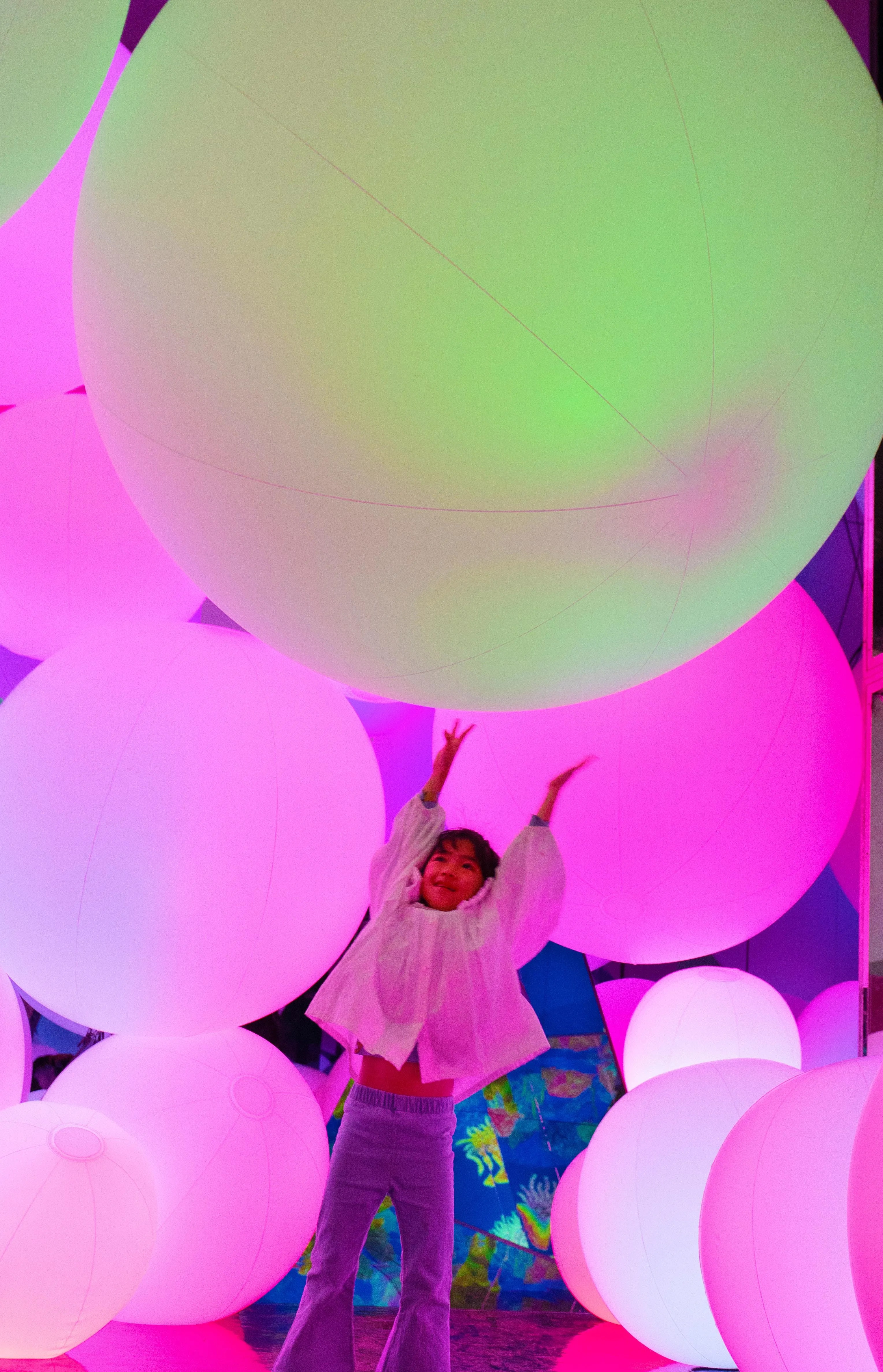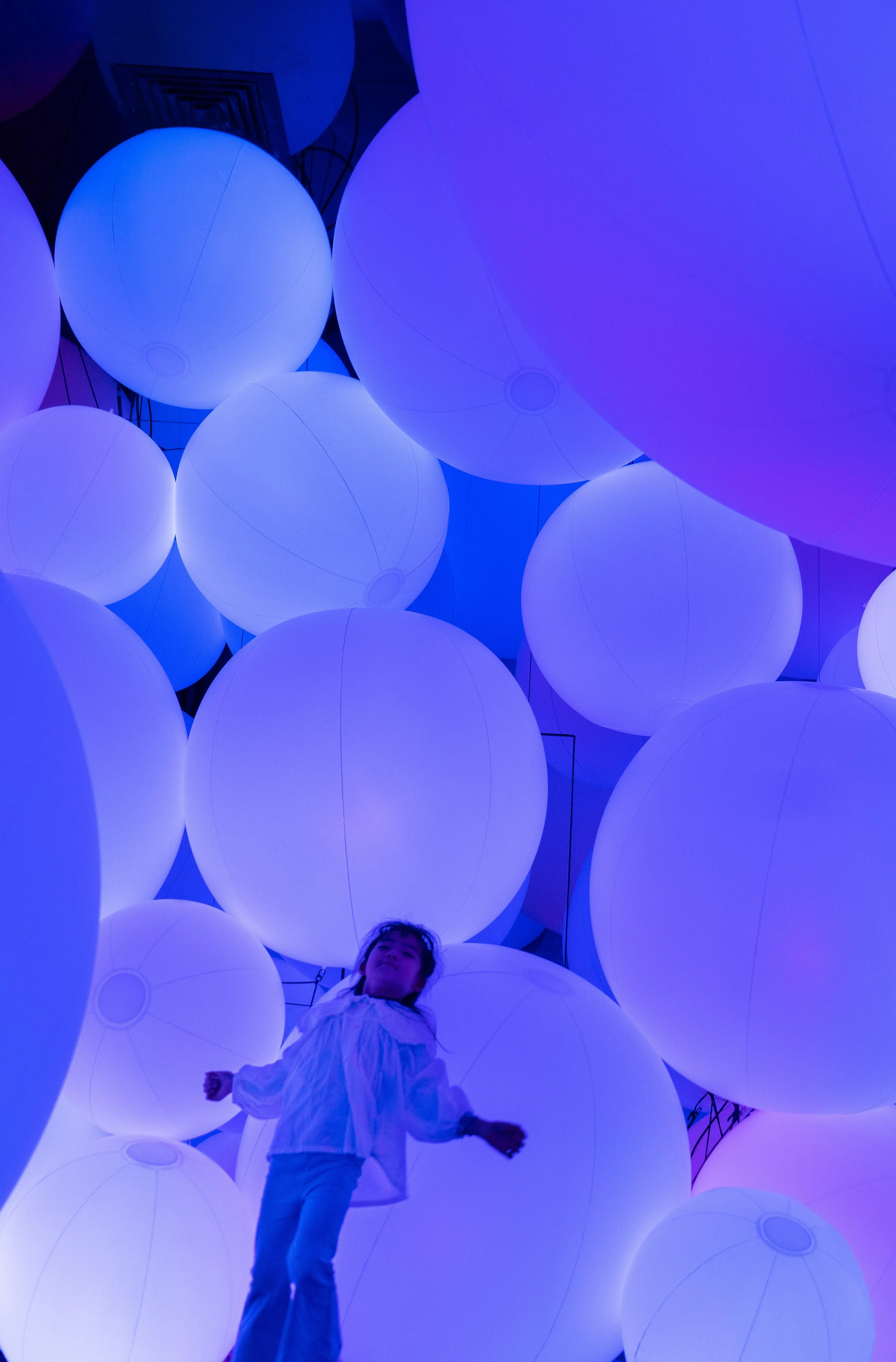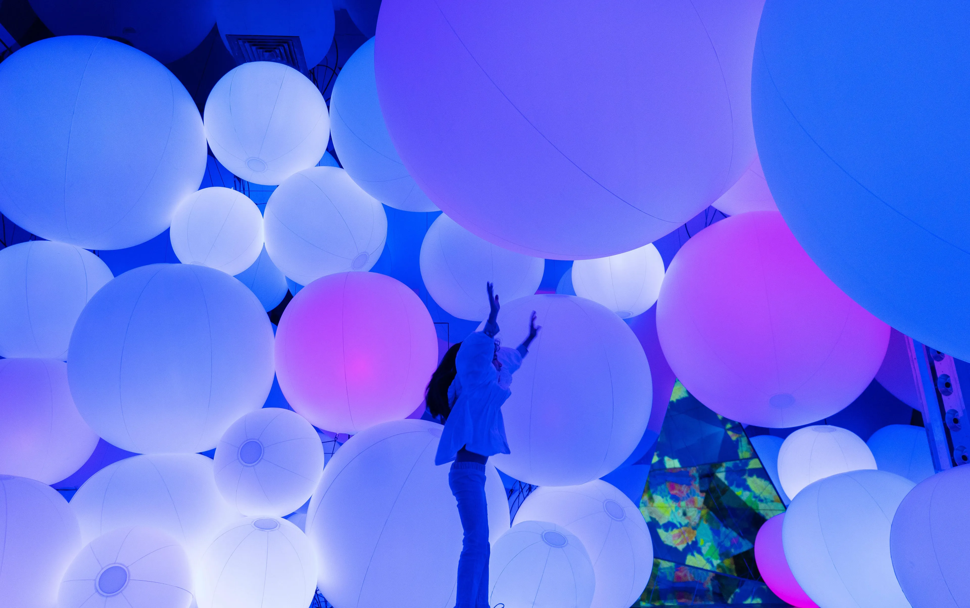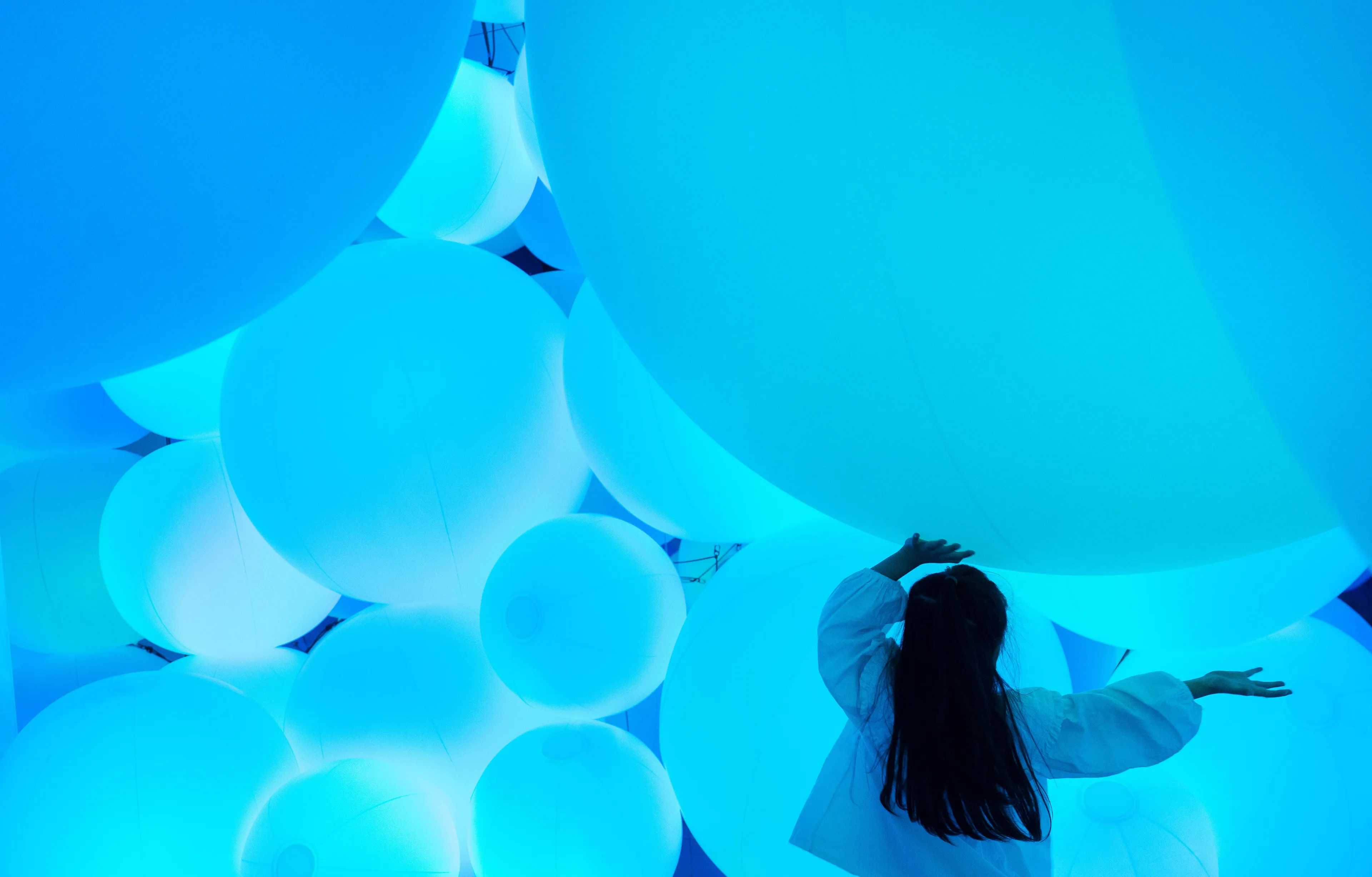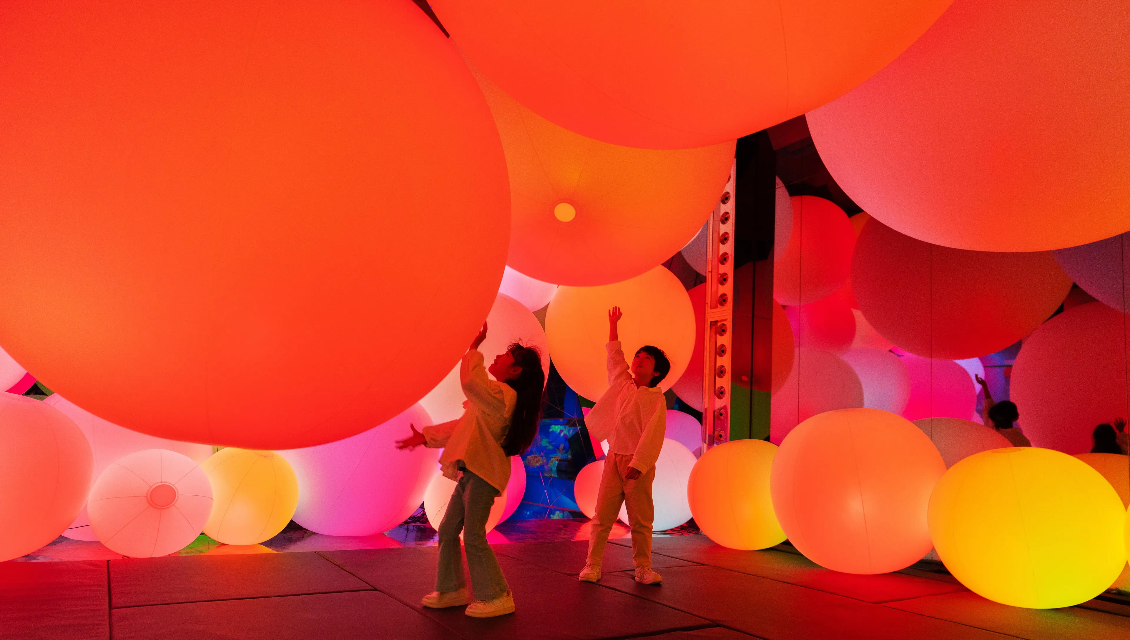 Typhoon light balls float between the floor and the ceiling within the confines of the space, as though transcending the concept of mass. When a person touches a typhoon light ball, its color changes, and it emits a sound tone unique to that color. One after another, the surrounding balls successively change to the same color and emit the same tone.