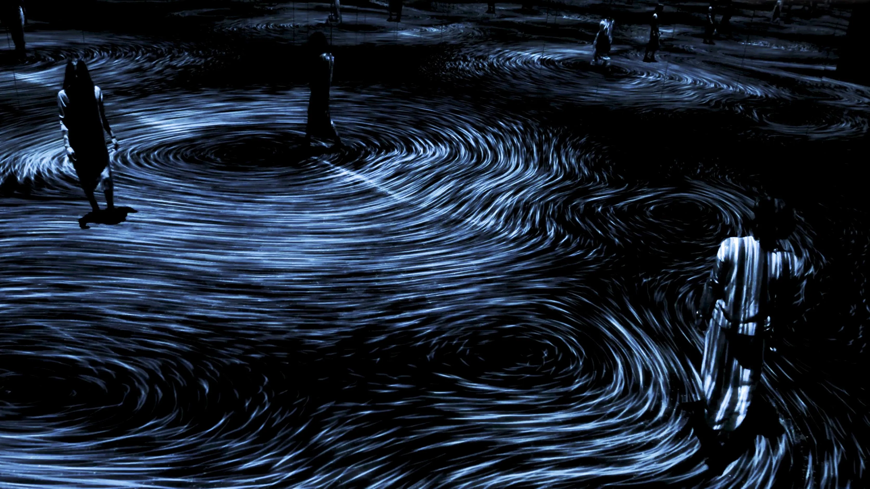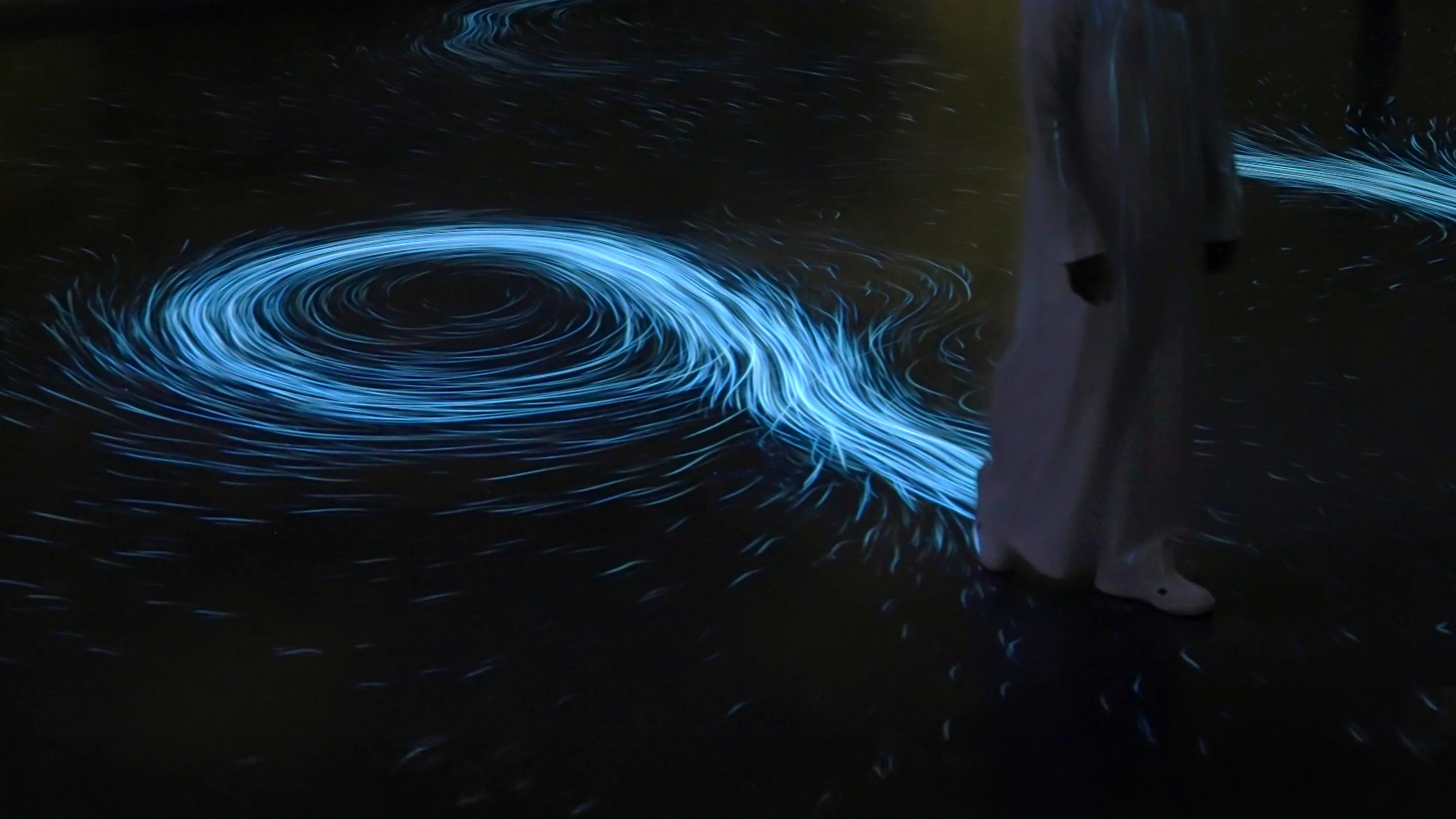 The flow in the artwork is expressed as a continuum of particles, and lines are drawn in three-dimensional space according to the trajectories of those particles. The accumulation of lines that represent the work are then flattened according to what teamLab calls Ultrasubjective Space.