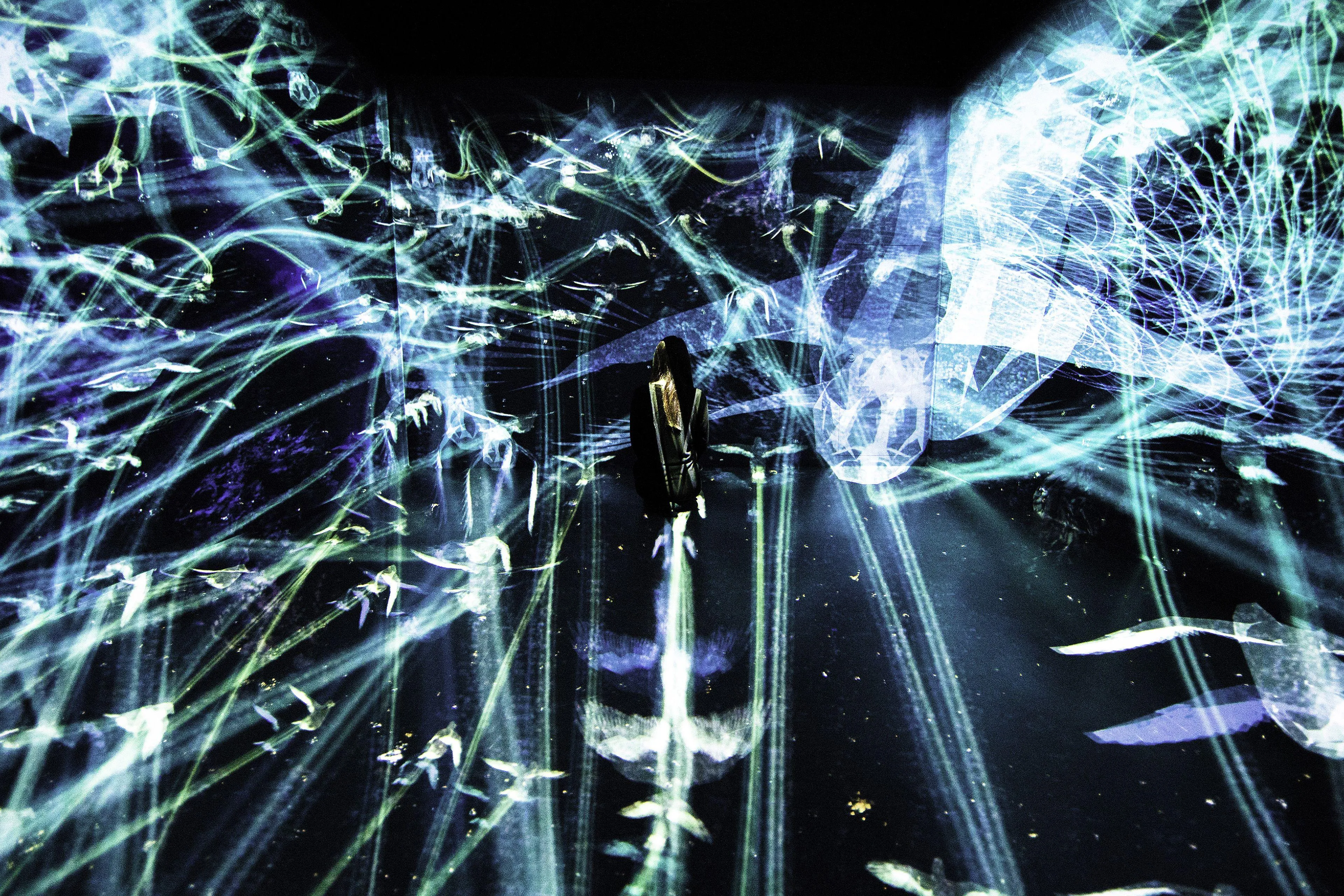 四方と下方が全て映像に囲われたインタラクティブデジタルインスタレーション作品。