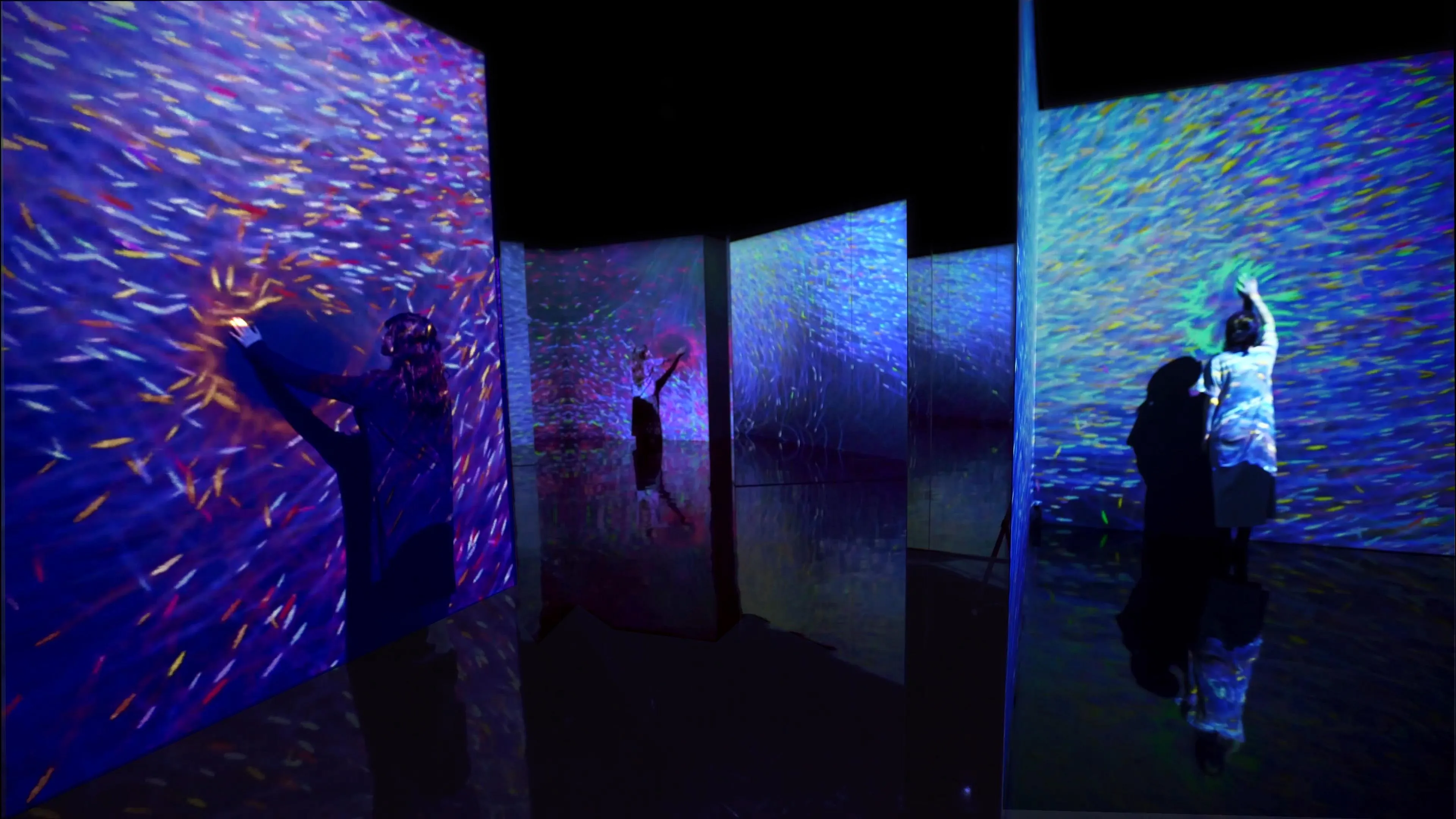 The artwork begins when the shoal of fish from The Way of the Sea enters the world below in teamLab Borderless. When the fish leave the world below, the artwork ends.