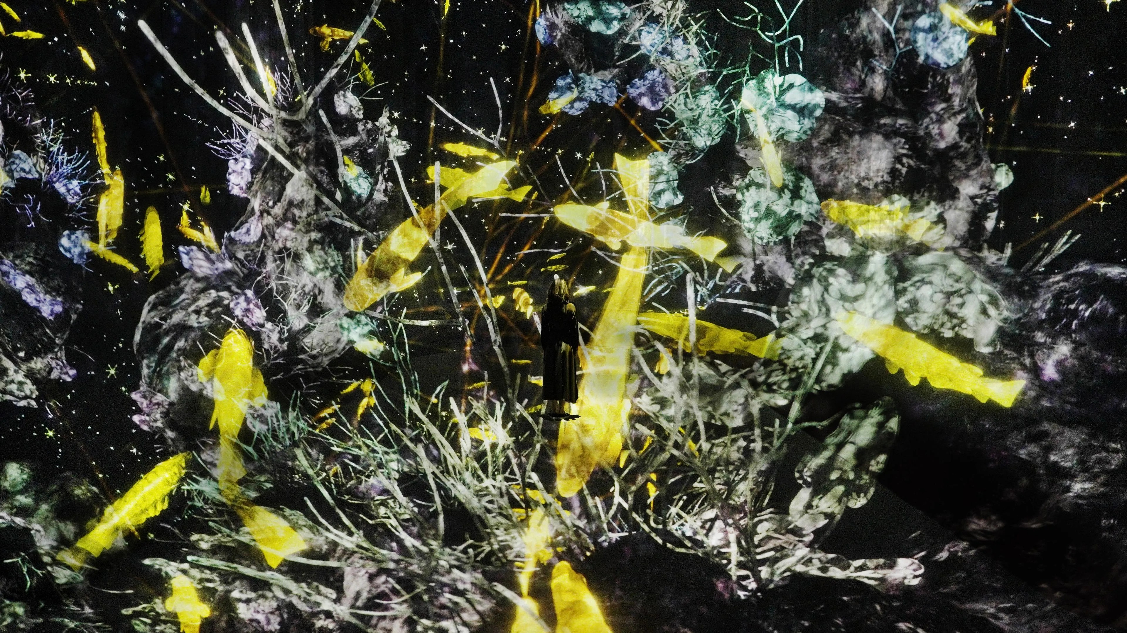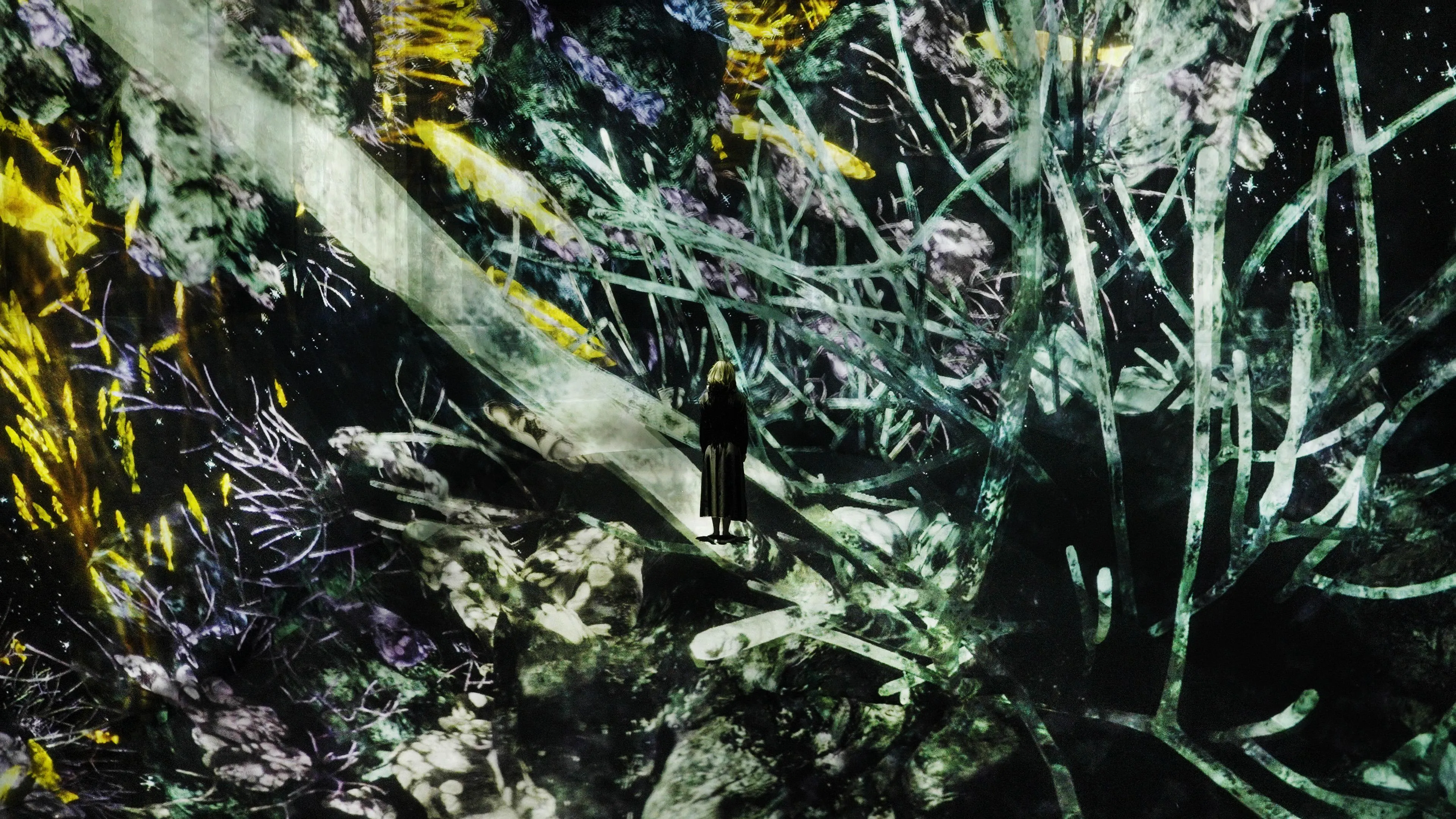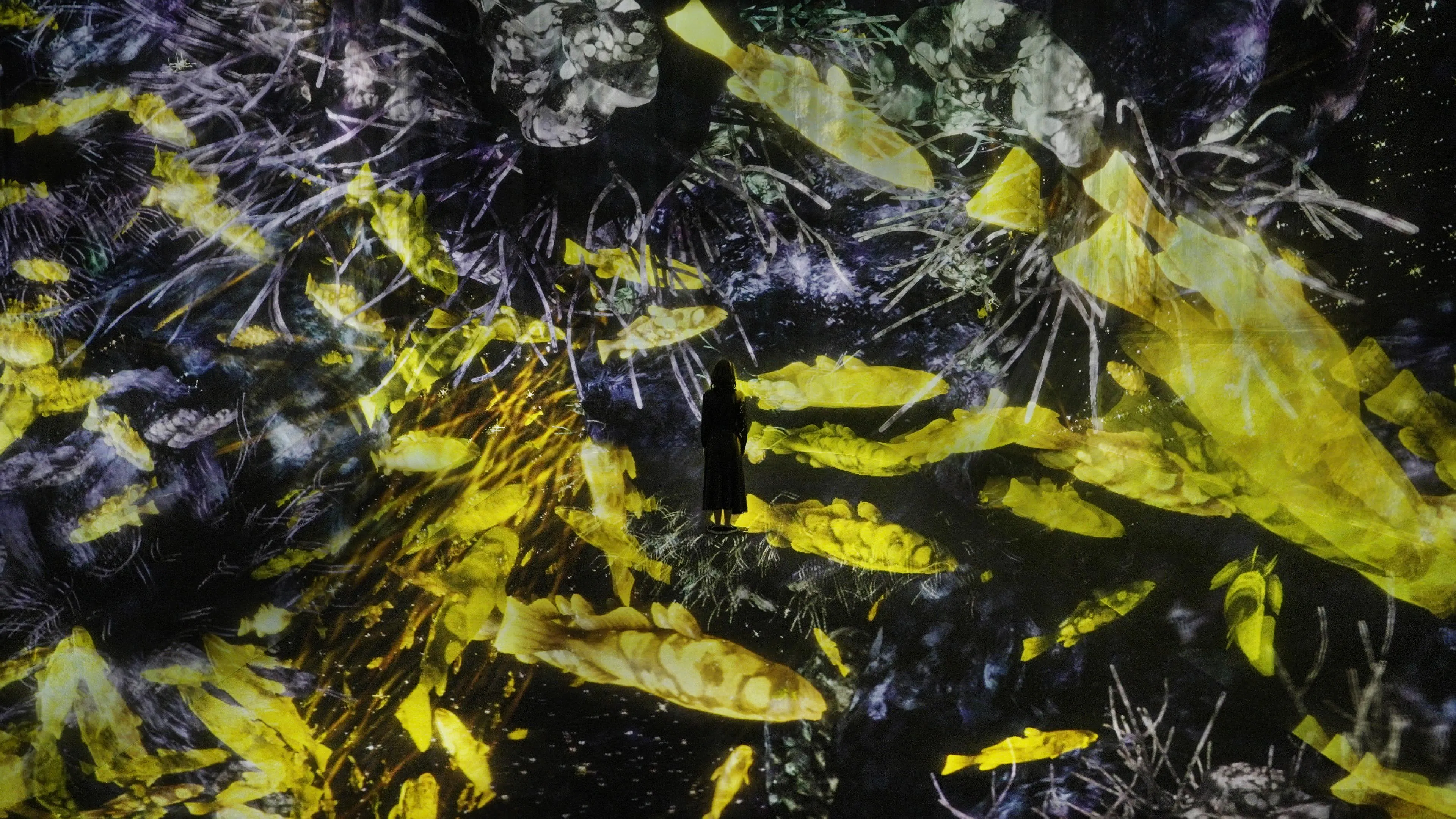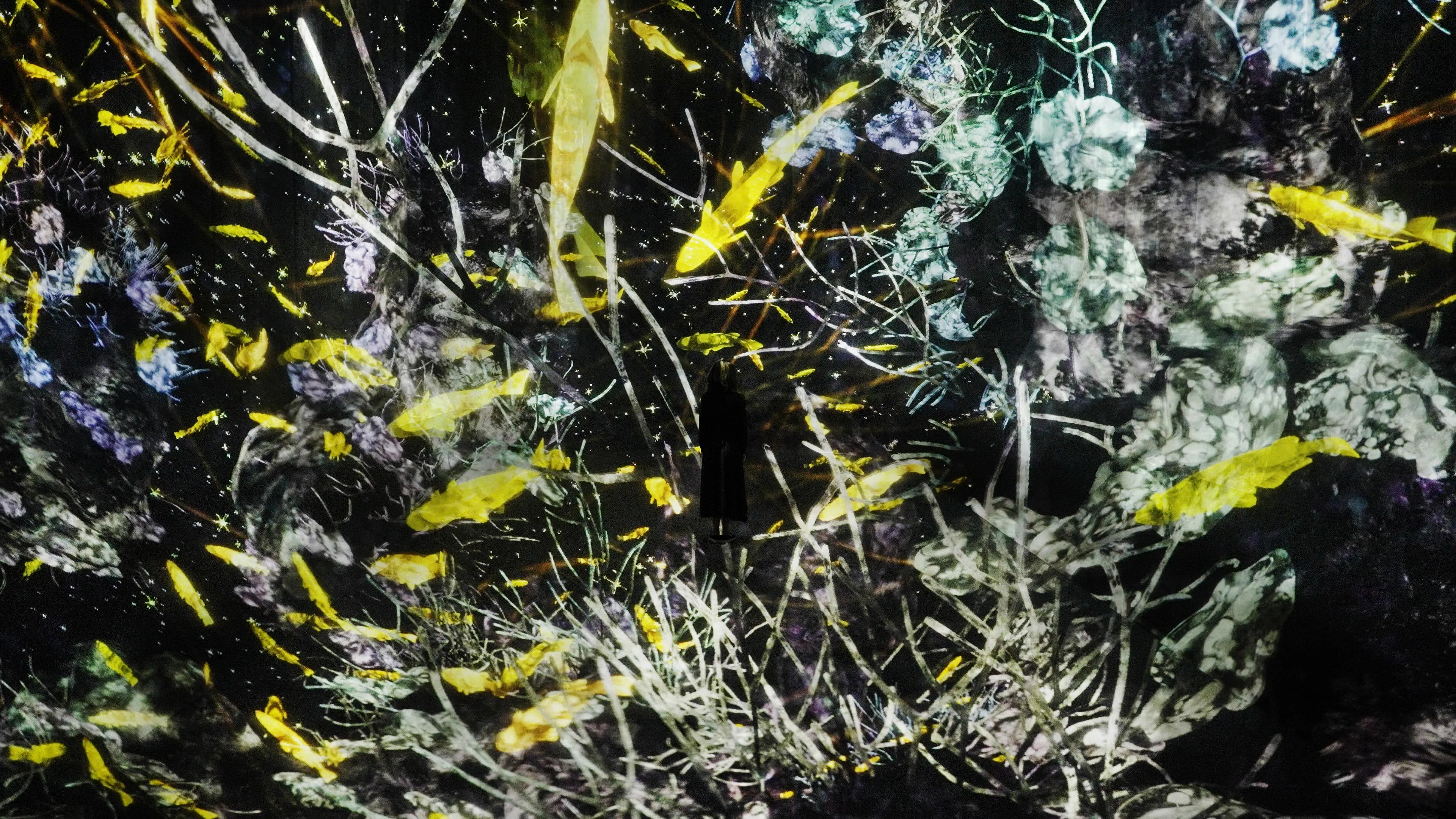 The movement of thousands of fish is beautiful and mysterious, appearing like a single giant life form. The physiological mechanism of the movement of the shoal is shrouded in mystery, but the fact that it feels like a living organism intuitively suggests that there is a high level of order in space and time. teamLab would like to search for a new spatio-temporal form that can have a strong existence and a sense of life even if the constituent elements are temporally and spatially distant from each other. teamLab believes that we can seek a new form that can be felt as the same existence as long as the same order is maintained, even though spatially the same form will never be the same again, and even though the size of the object varies greatly over time.