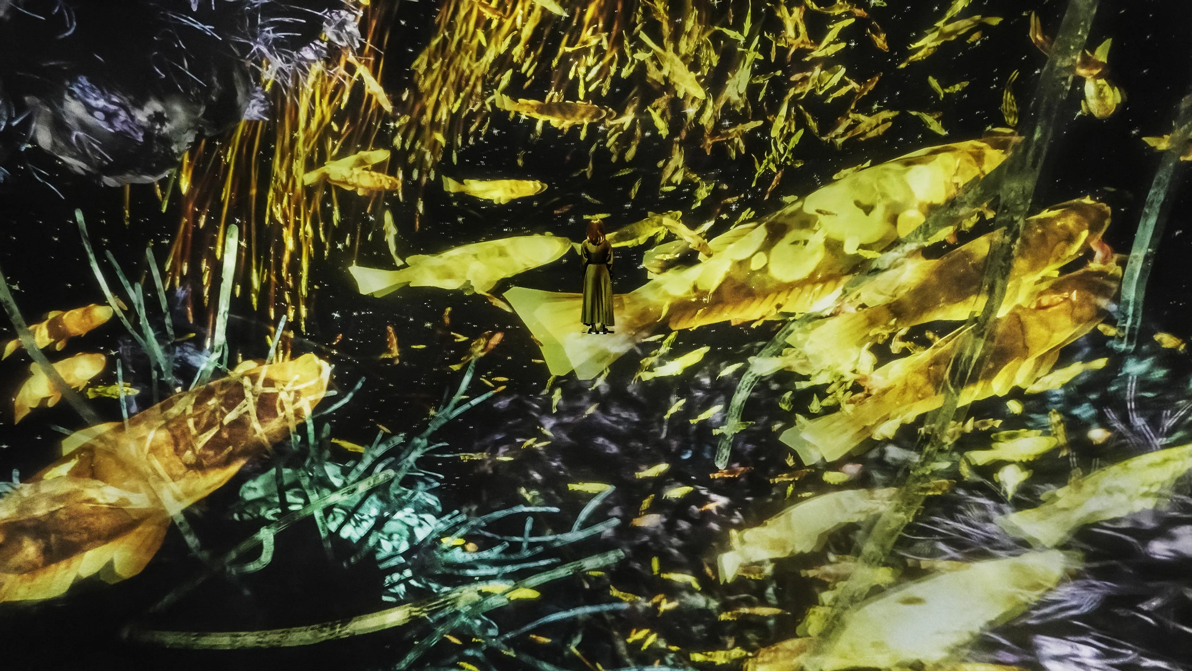 The shoal of fish rendered in light moves freely through the space, leaving trails of light. They sense people’s presence and try to avoid colliding with them.