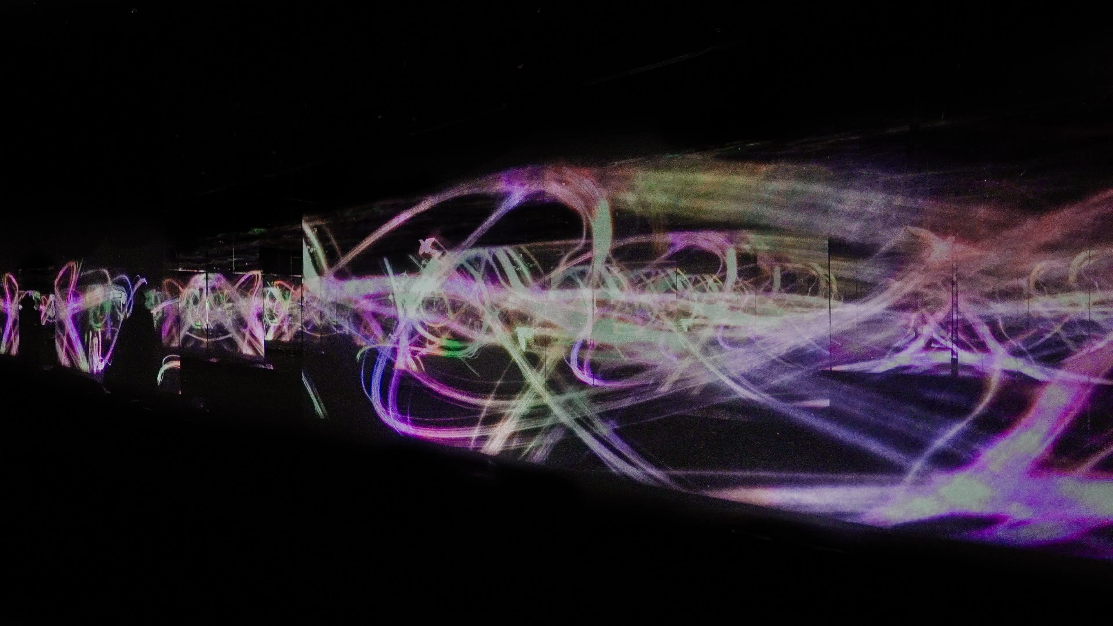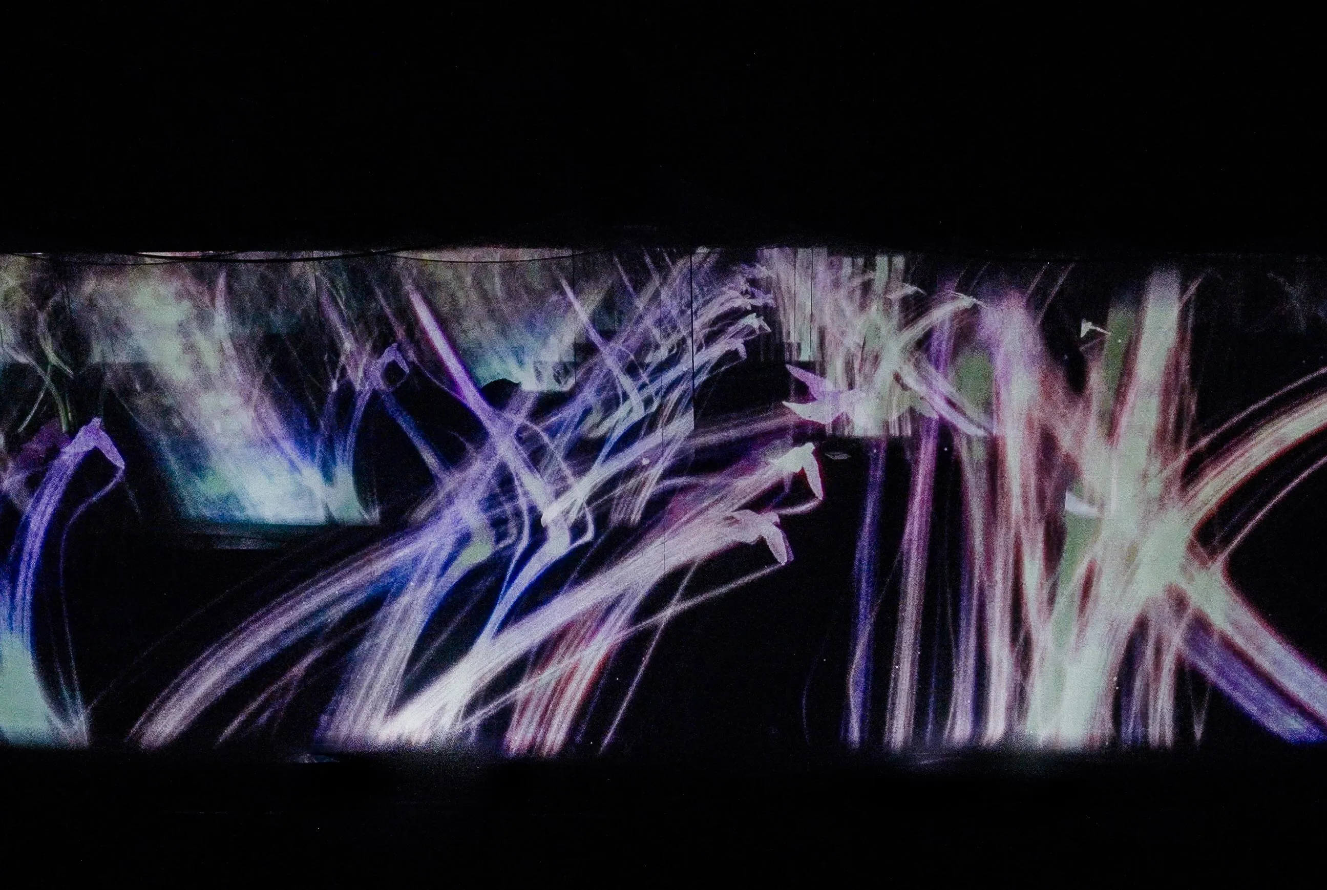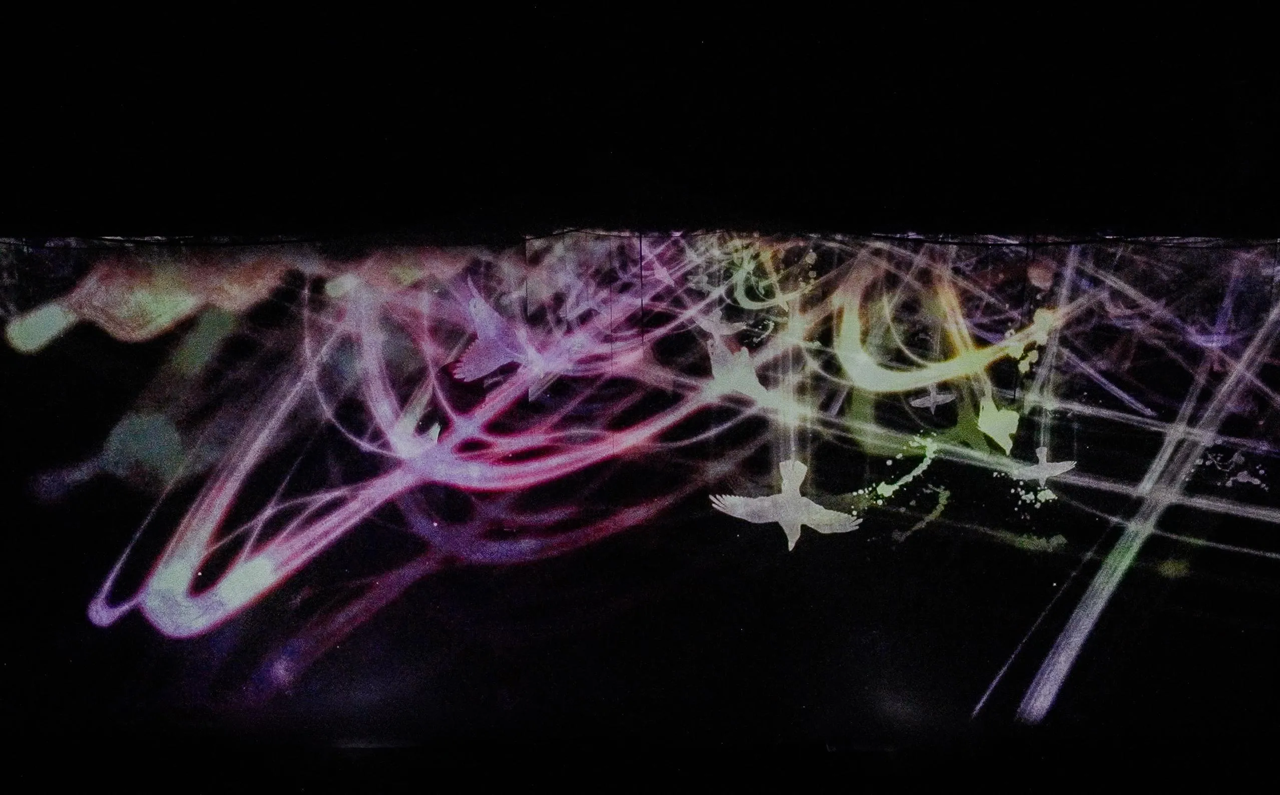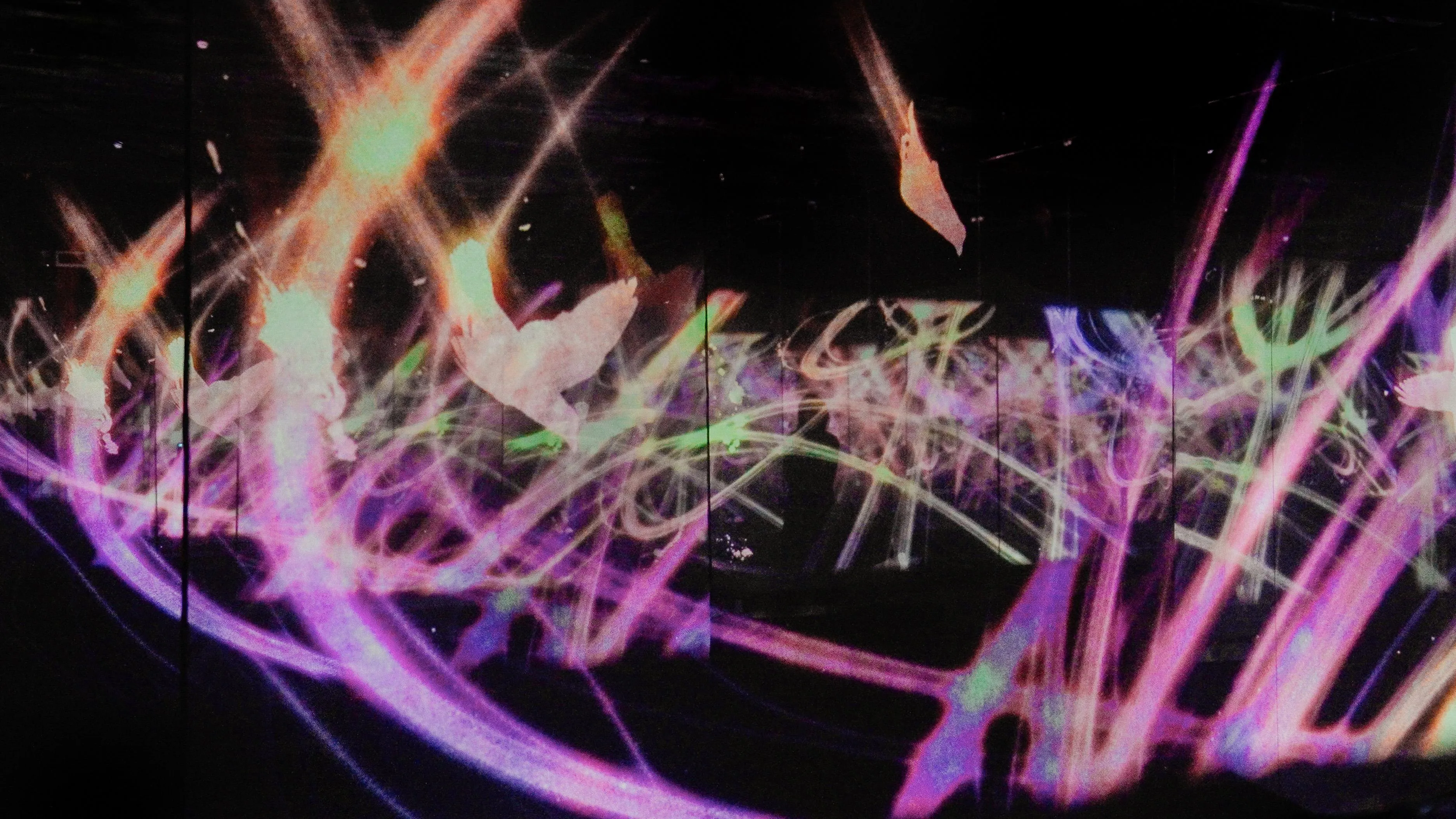 Flocks of mythical crows (Yatagarasu) rendered in light fly around the space leaving trails in their wake and forming Spatial Calligraphy. The chasing crows are eventually chased themselves, and form flowers when they crash into each other, scattering their petals.