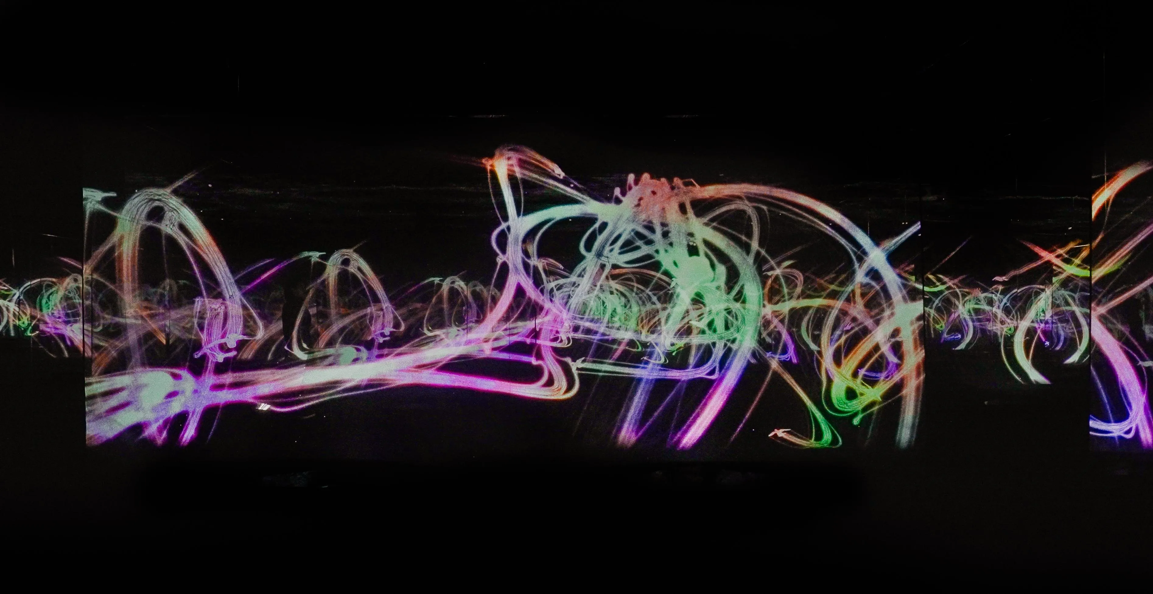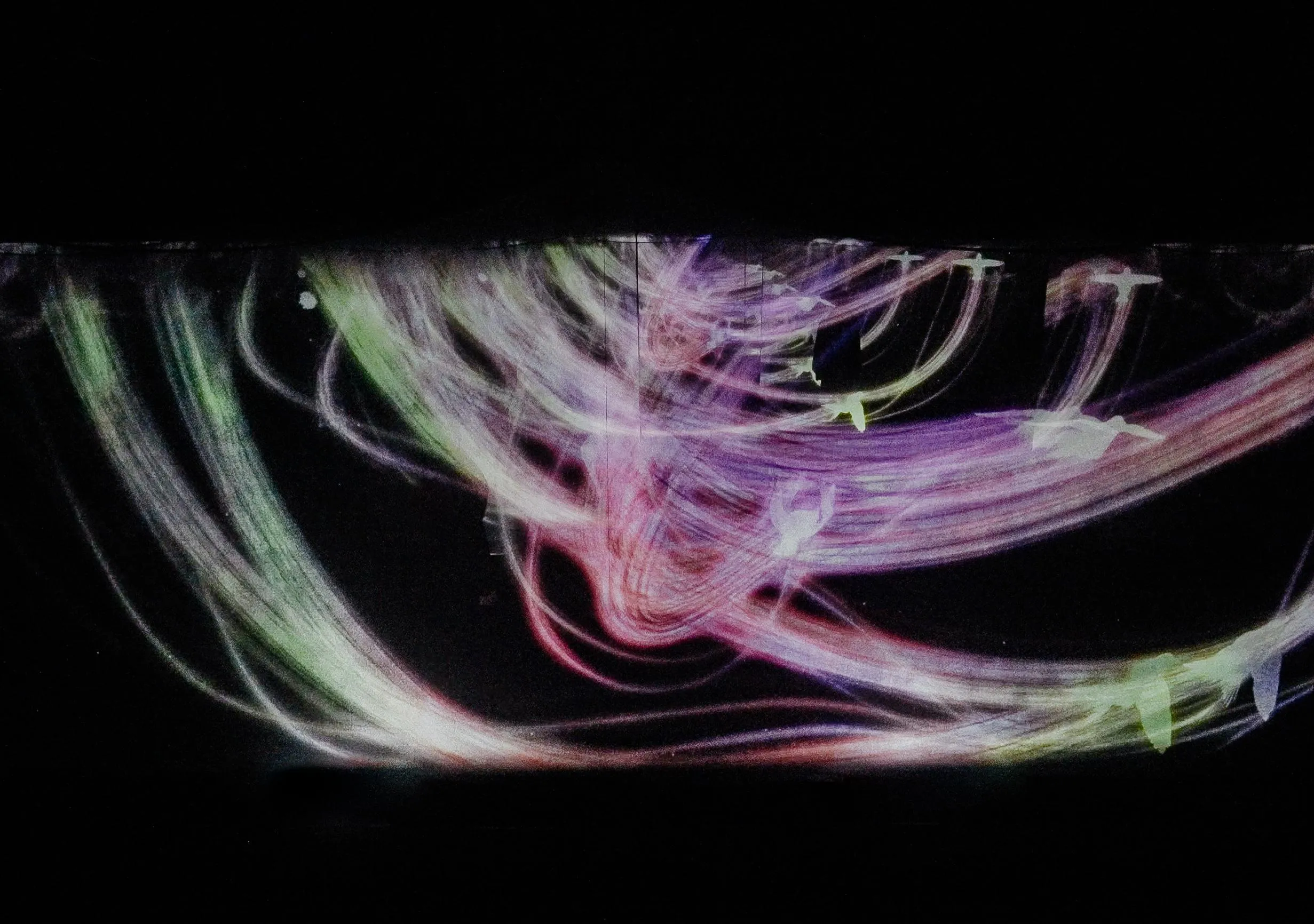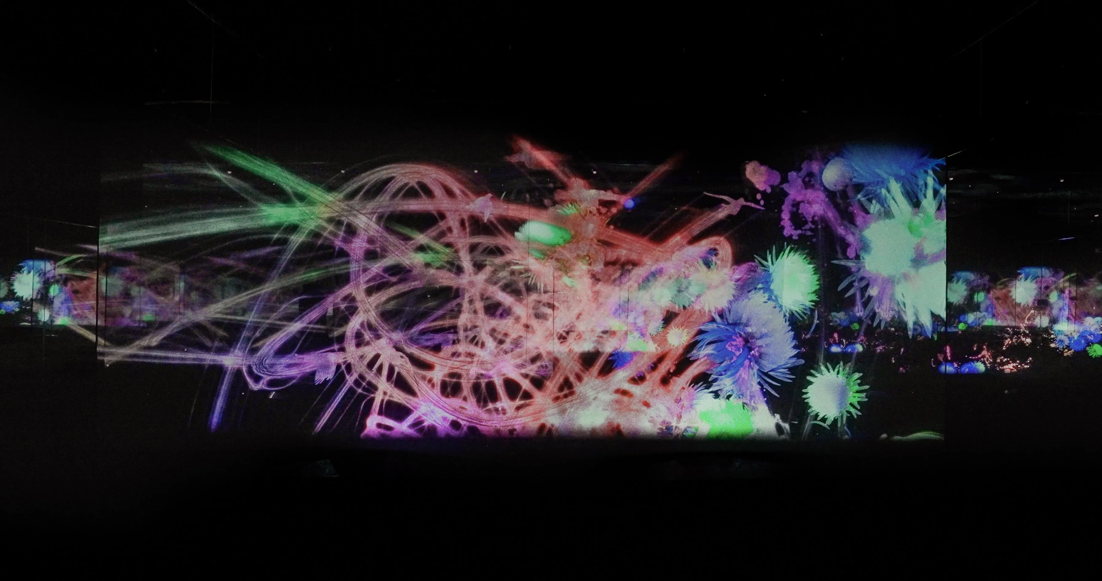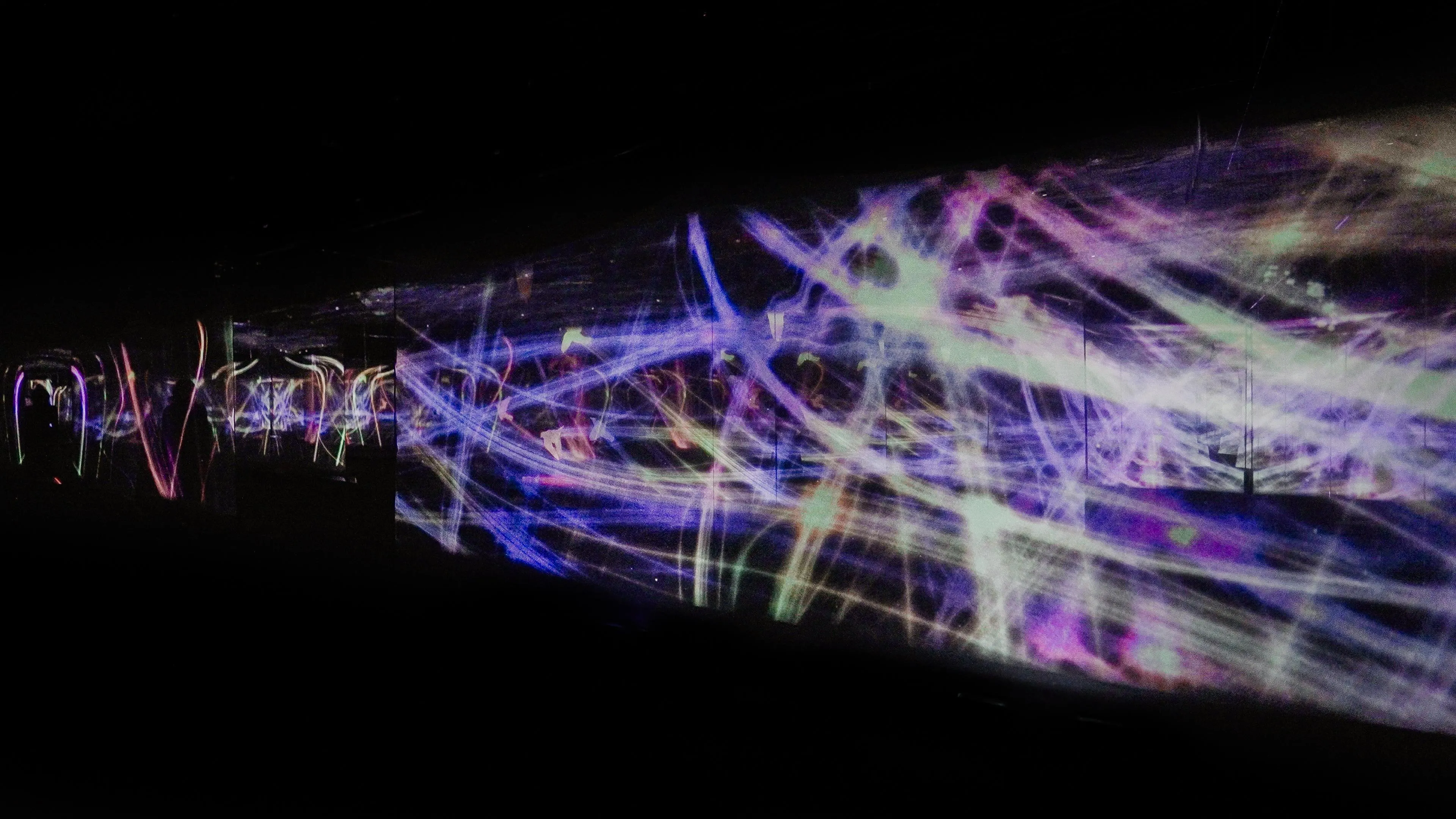 Flocks of mythical crows (Yatagarasu) rendered in light fly around the space leaving trails in their wake and forming Spatial Calligraphy. The chasing crows are eventually chased themselves, and form flowers when they crash into each other, scattering their petals.