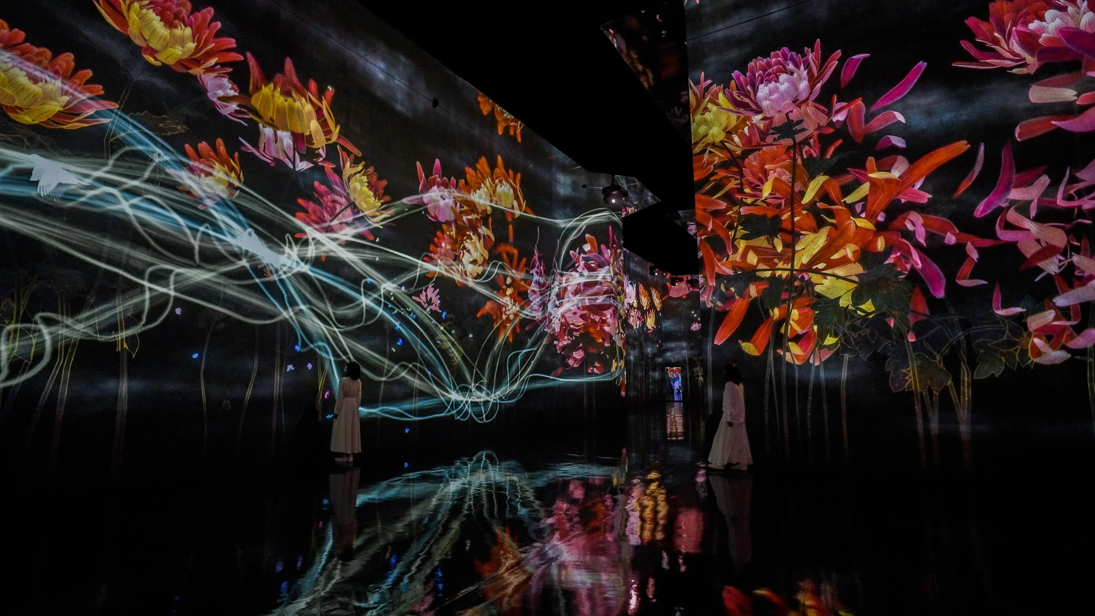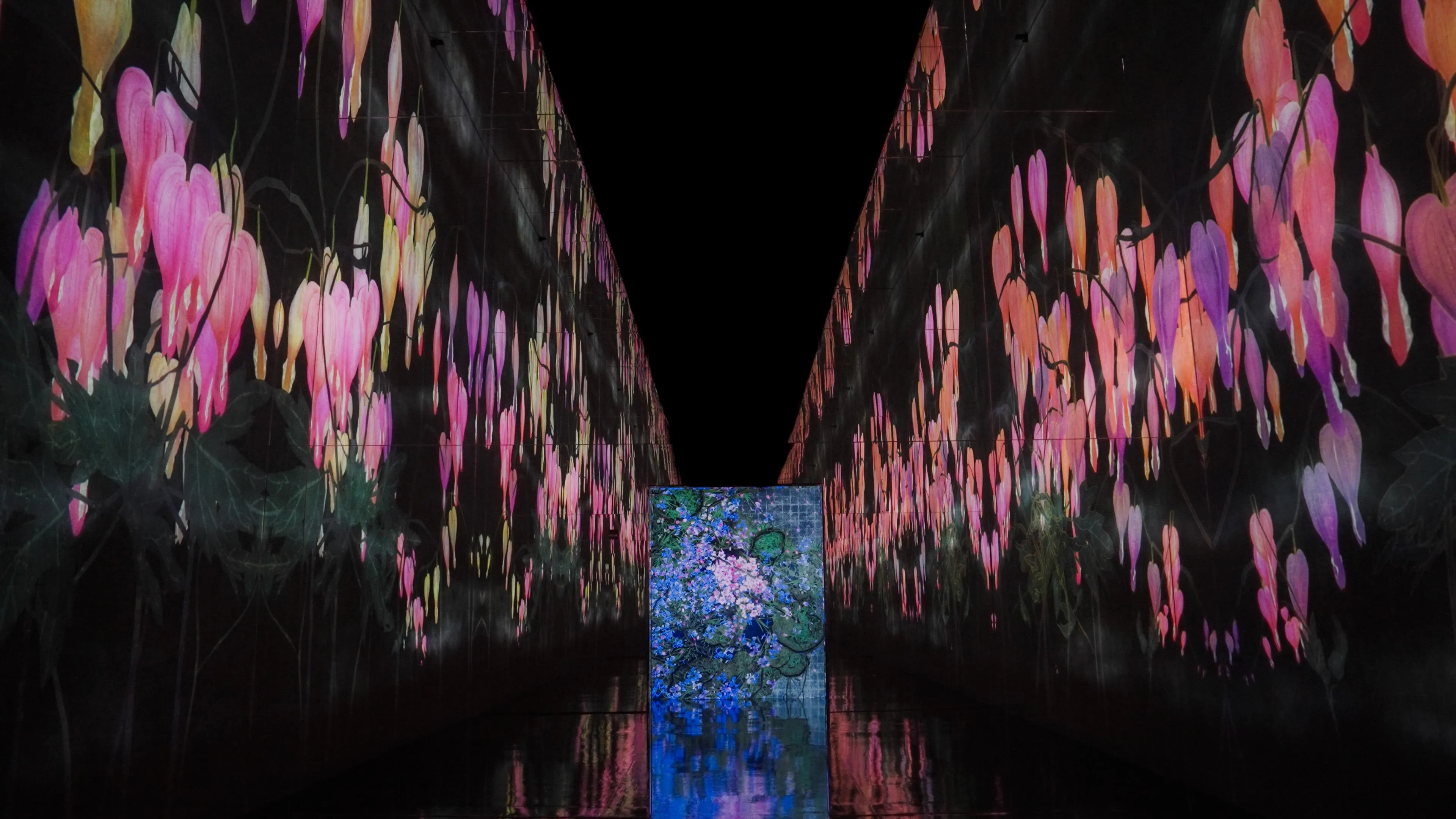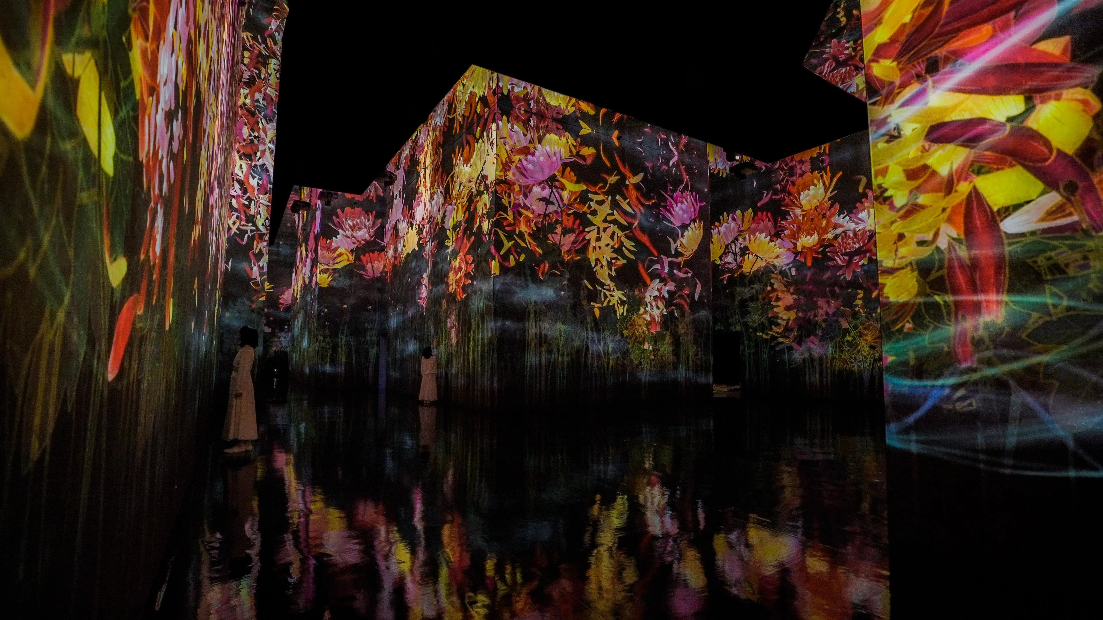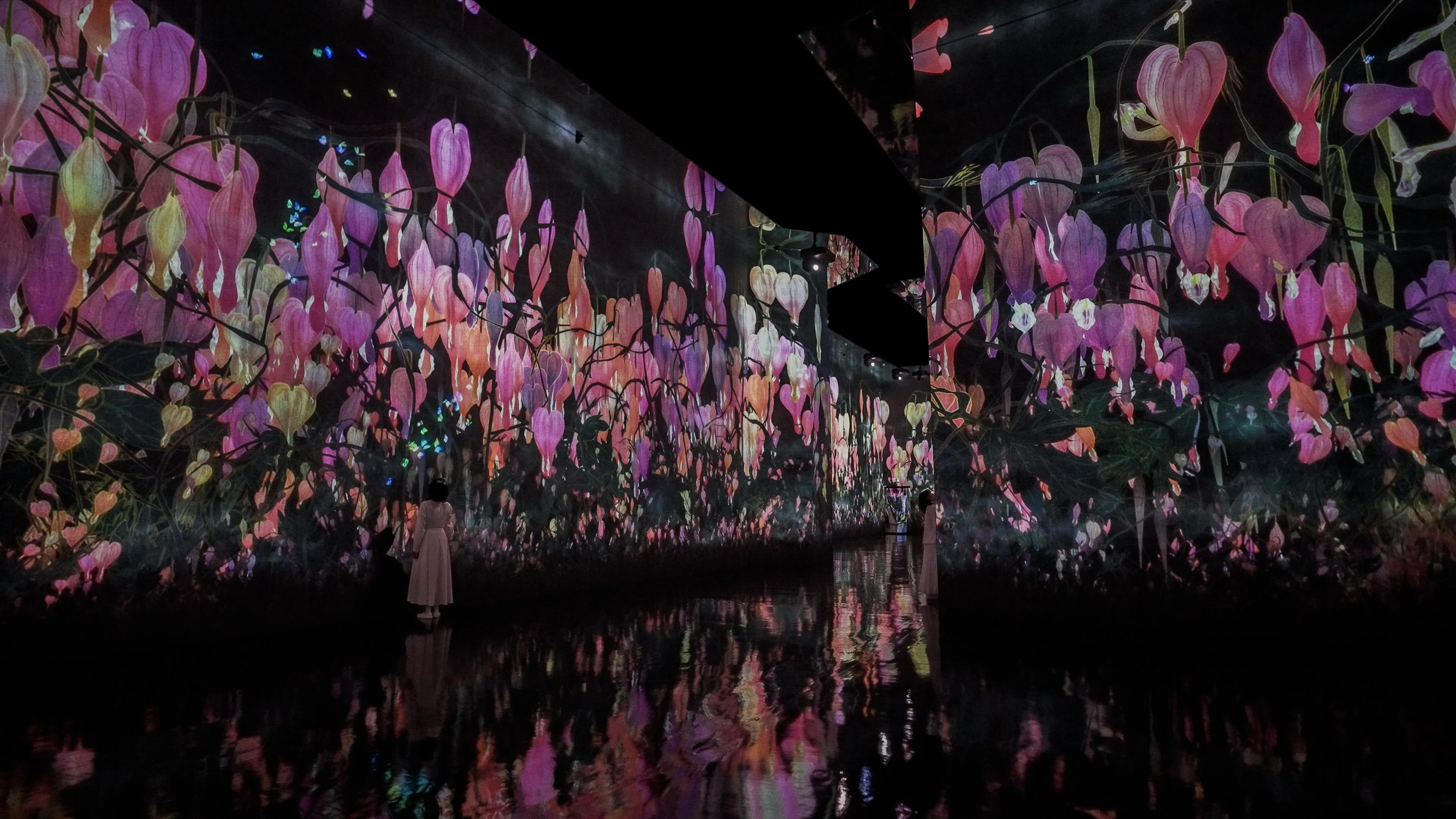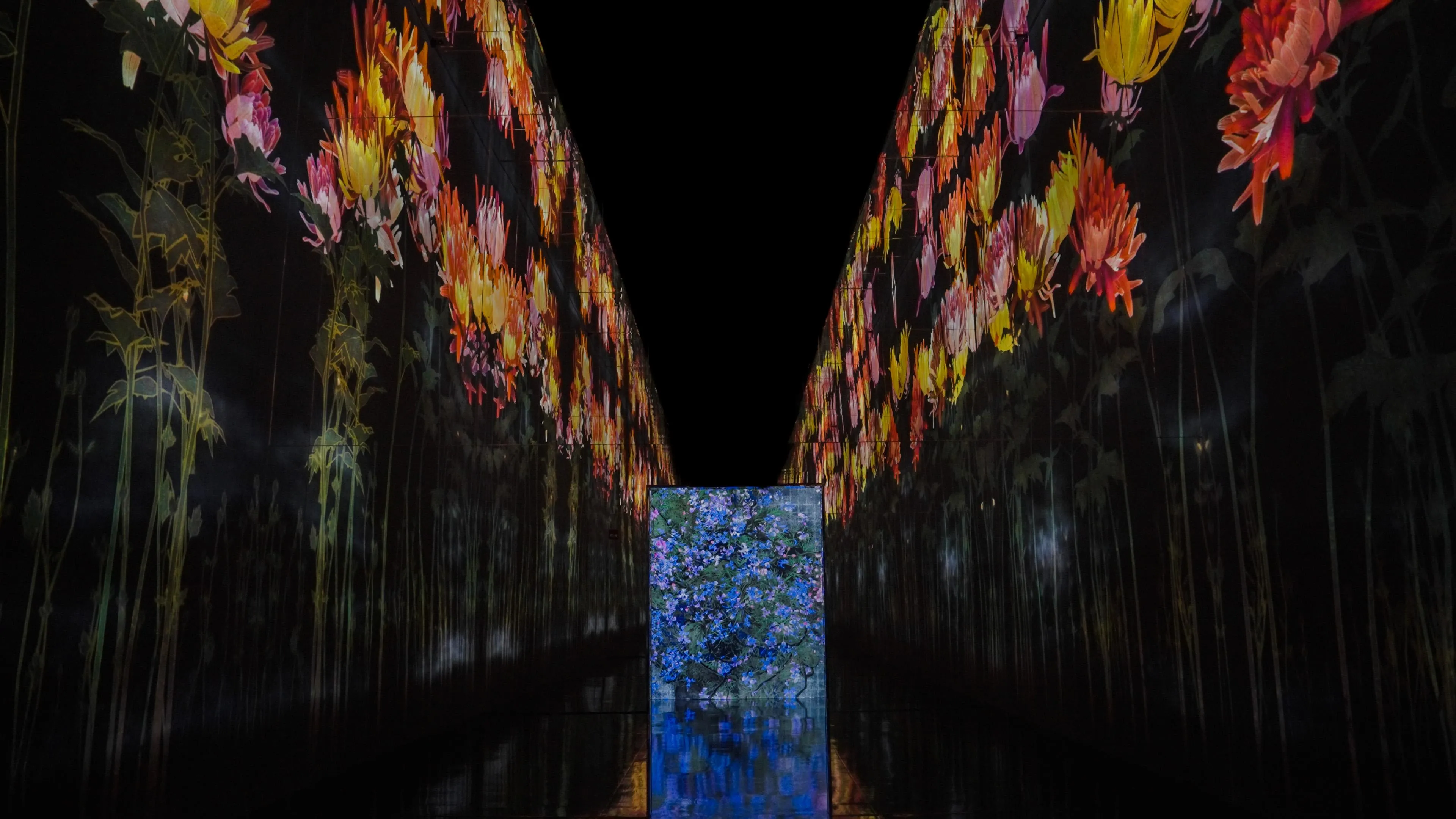 作品的世界,是基于teamLab所发想的「超主观空间」理论平面化而来的,因此不同于由镜头或透视法平面化而来的空间,观赏者的视角不会被固定,身体也会变得自由可动。映出作品世界的墙壁不会成为我们与作品的界线,花与作品的边界面变得模糊,作品世界与人们身体所在的空间互相连续。